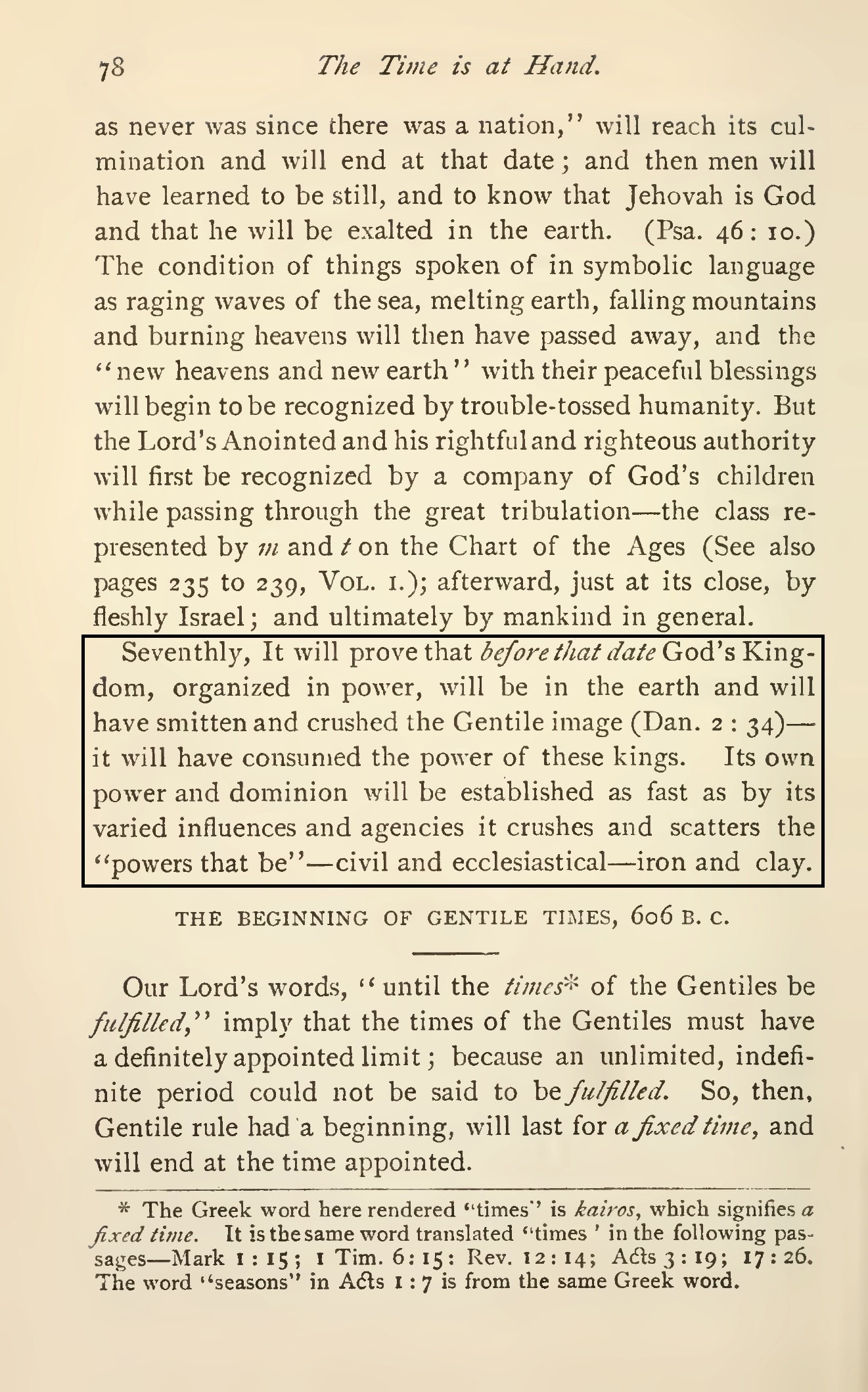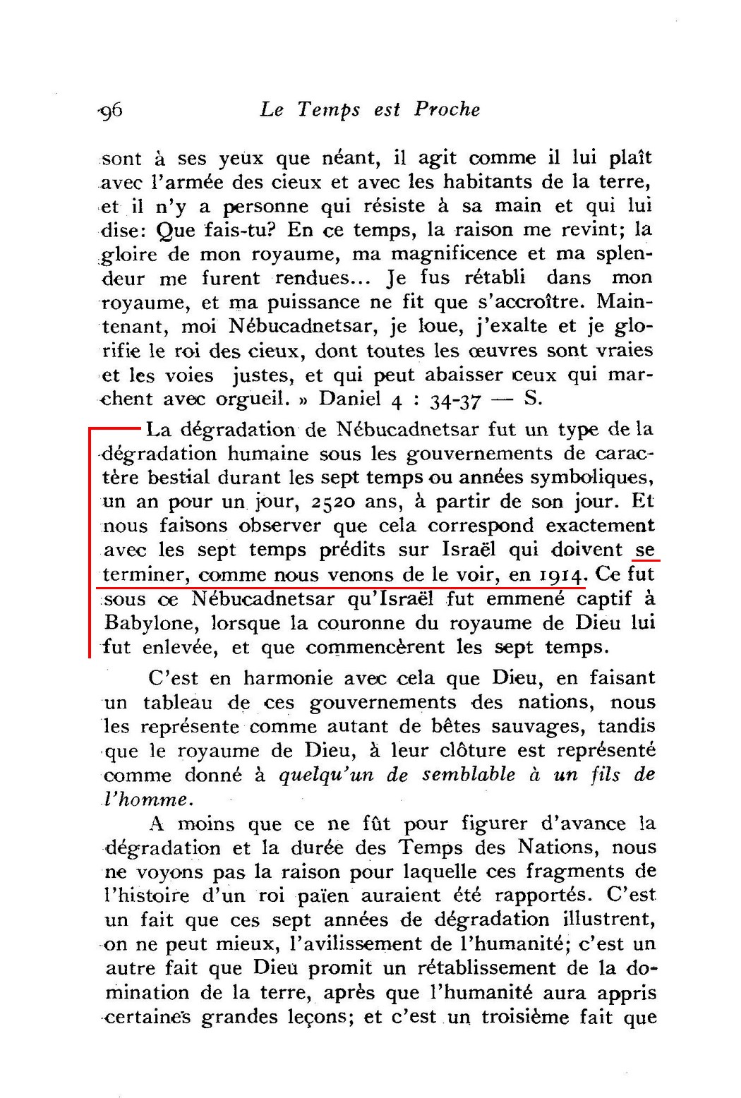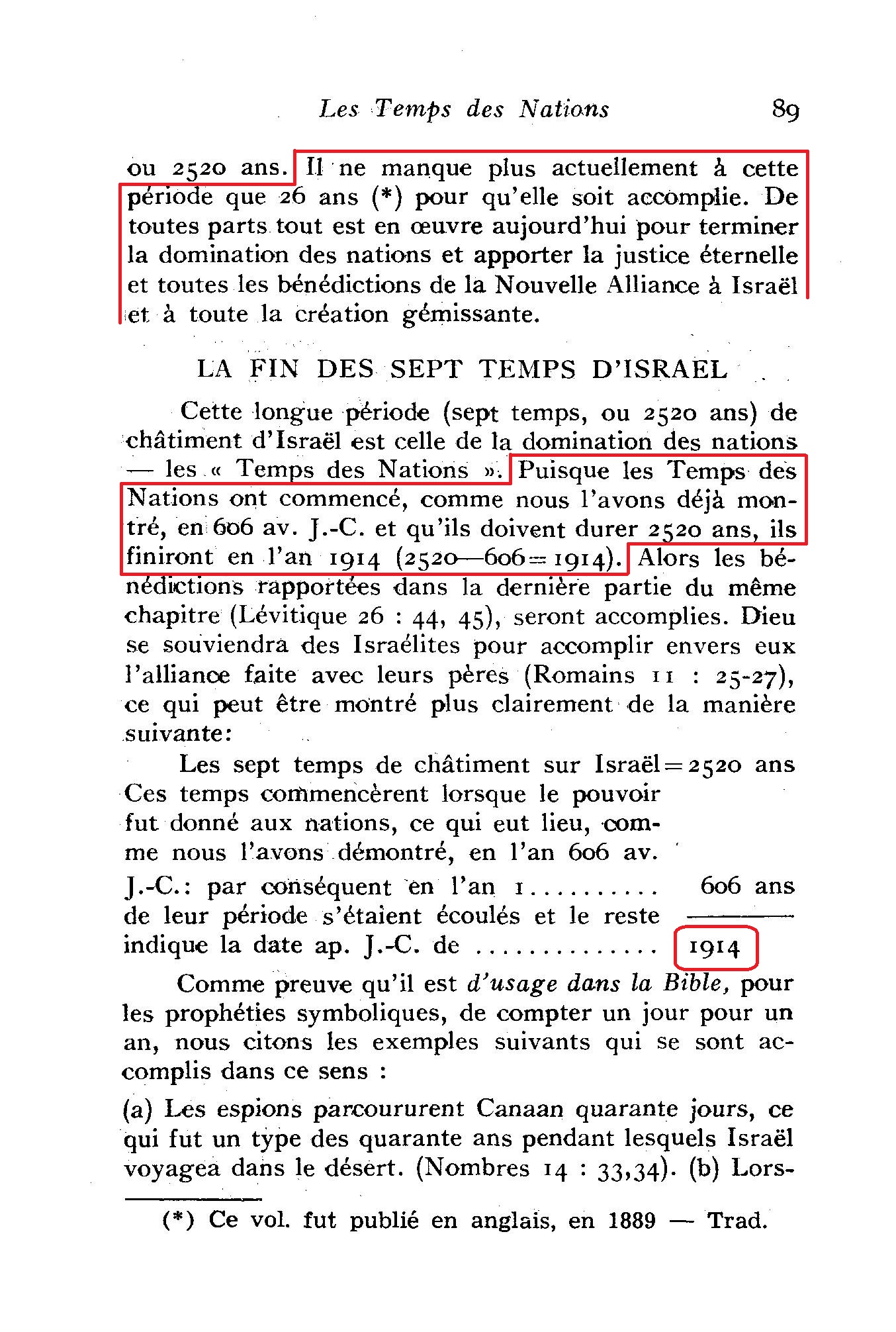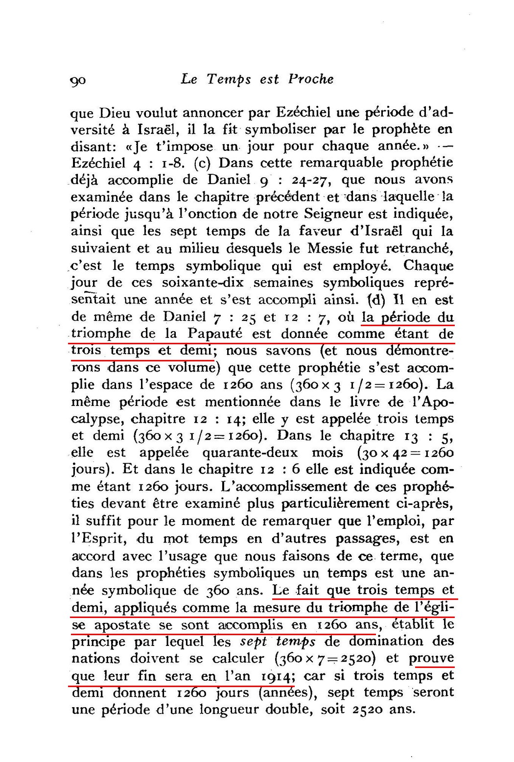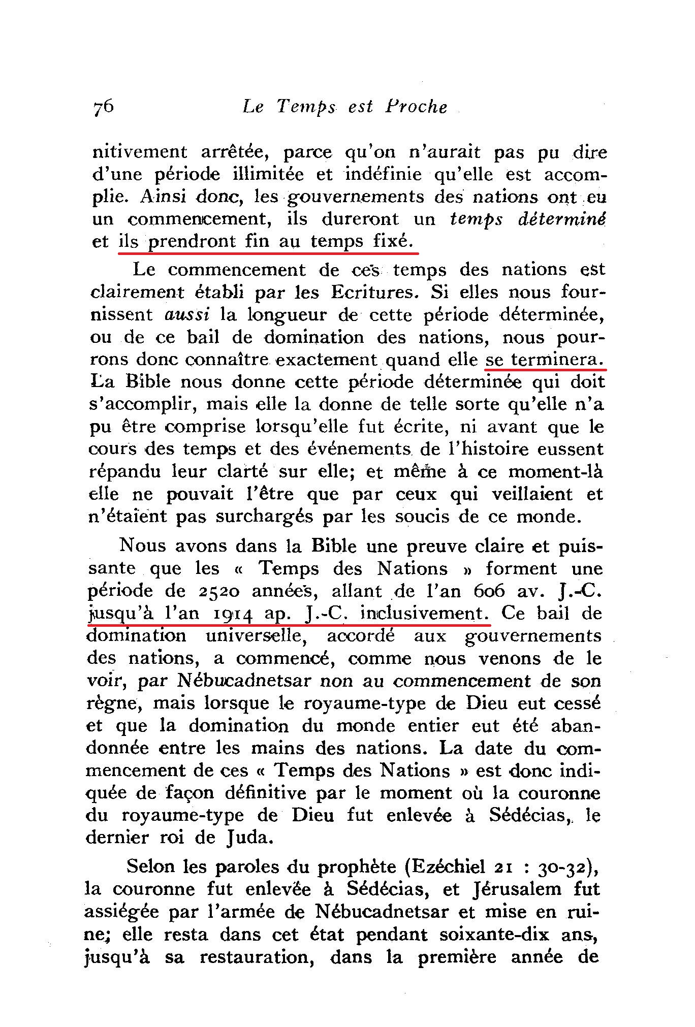 Ce temps est une période de " sept temps ", qui correspond prophétiquement à 2520 jours-années, qui ont commencé en 606 av. J.-C. et qui se terminent en 1914.