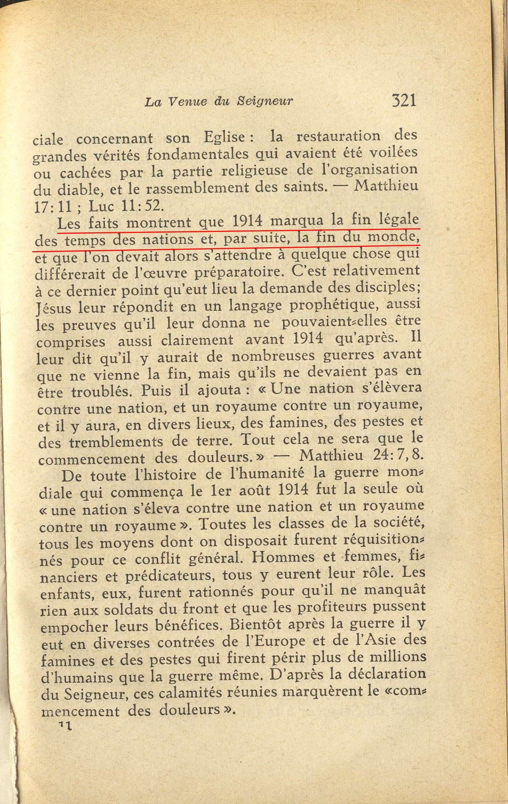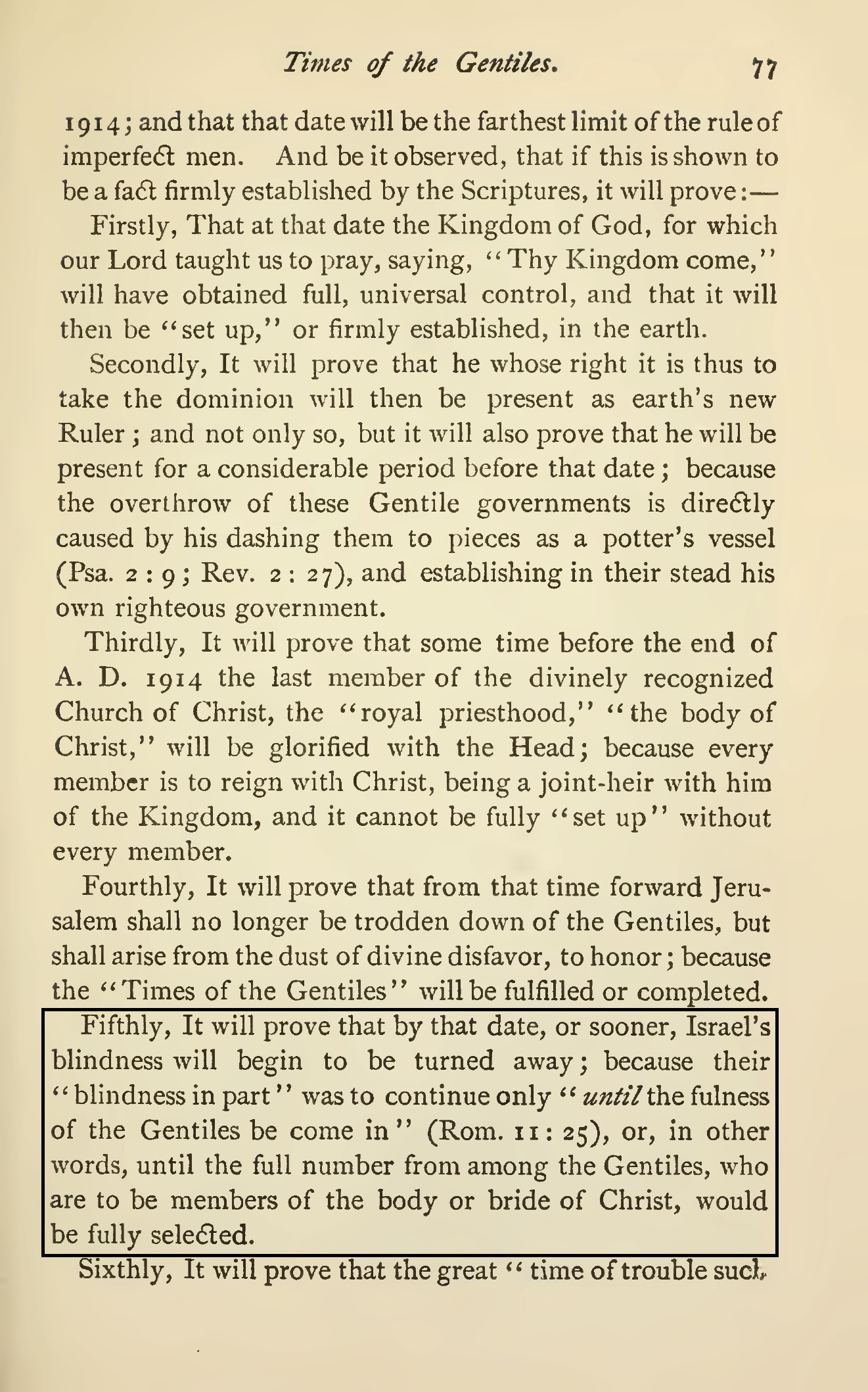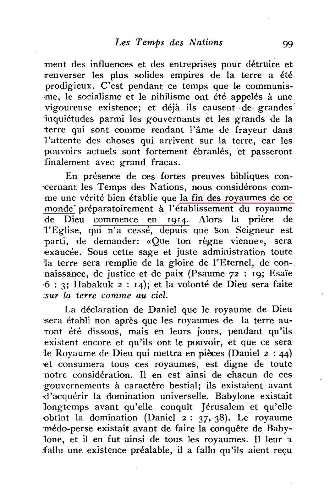 Notez bien que selon ces déclarations la fin des royaumes terrestres et l'établissement du royaume de Dieu sur la terre en 1914 ne sont pas partiels mais complets et définitives. À cette date-là, tous les gouvernements seront anéantis par le royaume de Dieu, et ainsi la volonté divine sera réalisée et appliquée sur toute la terre comme au ciel.
