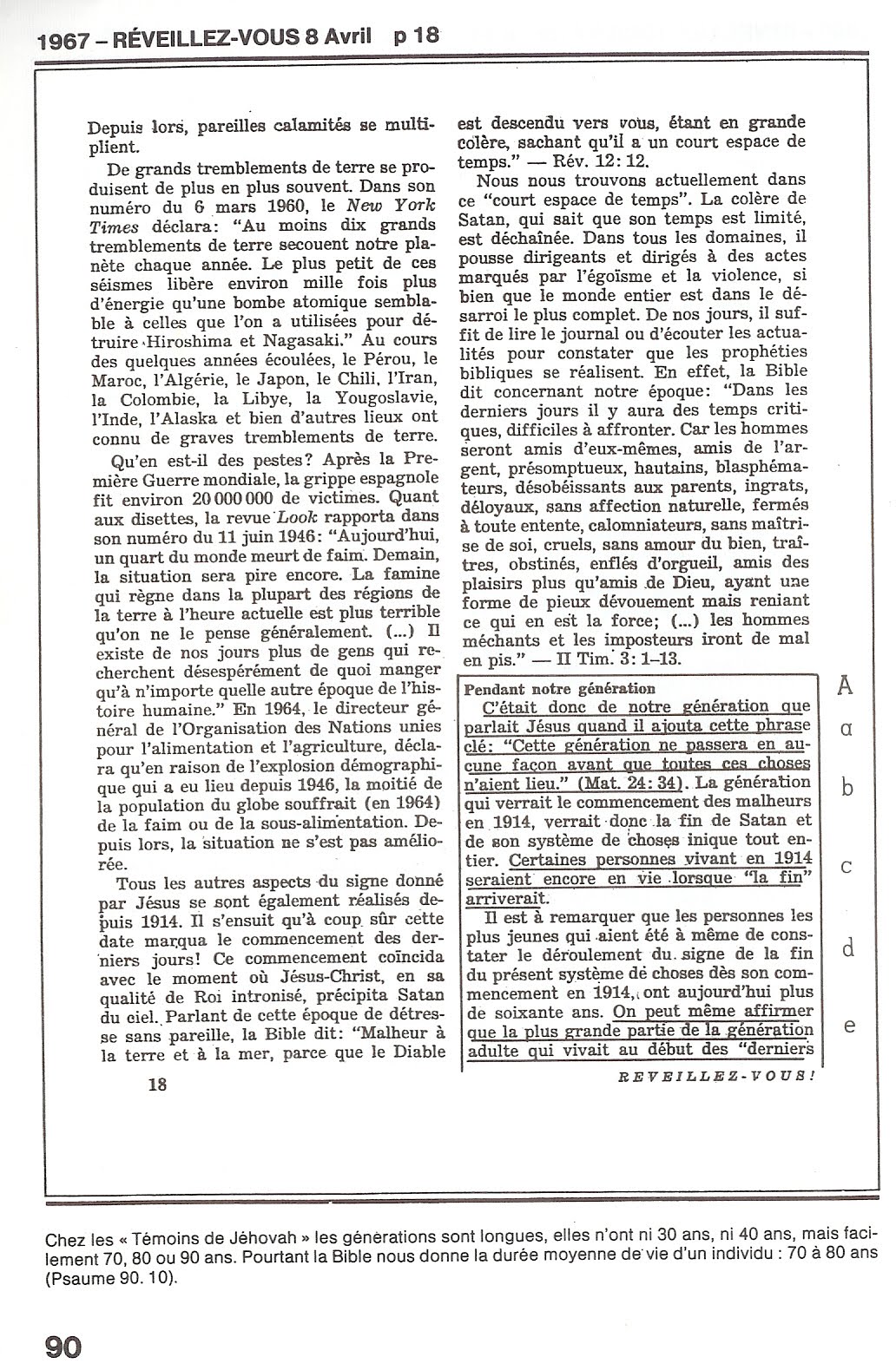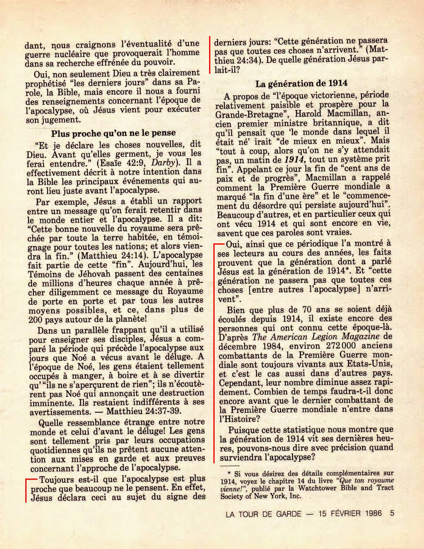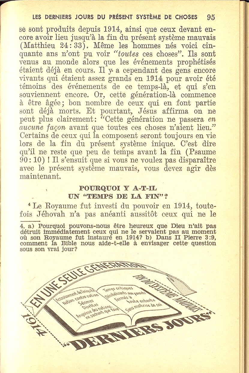 Dans son livre : " Crise de conscience ", Raymond Franz, ancien membre du Collège central de Brooklyn, dévoilait que les membres du Collège central savaient au moins depuis 1978 que 1914 ne pouvait pas être la date de l'établissement du Royaume dans les cieux et que par conséquent, la génération de 1914 ne verrait pas la fin. R.Franz écrivit en 1983 : " A présent, il est devenu évident que la génération de 1914 est passée et Harmaguédon n'est pas venu ".