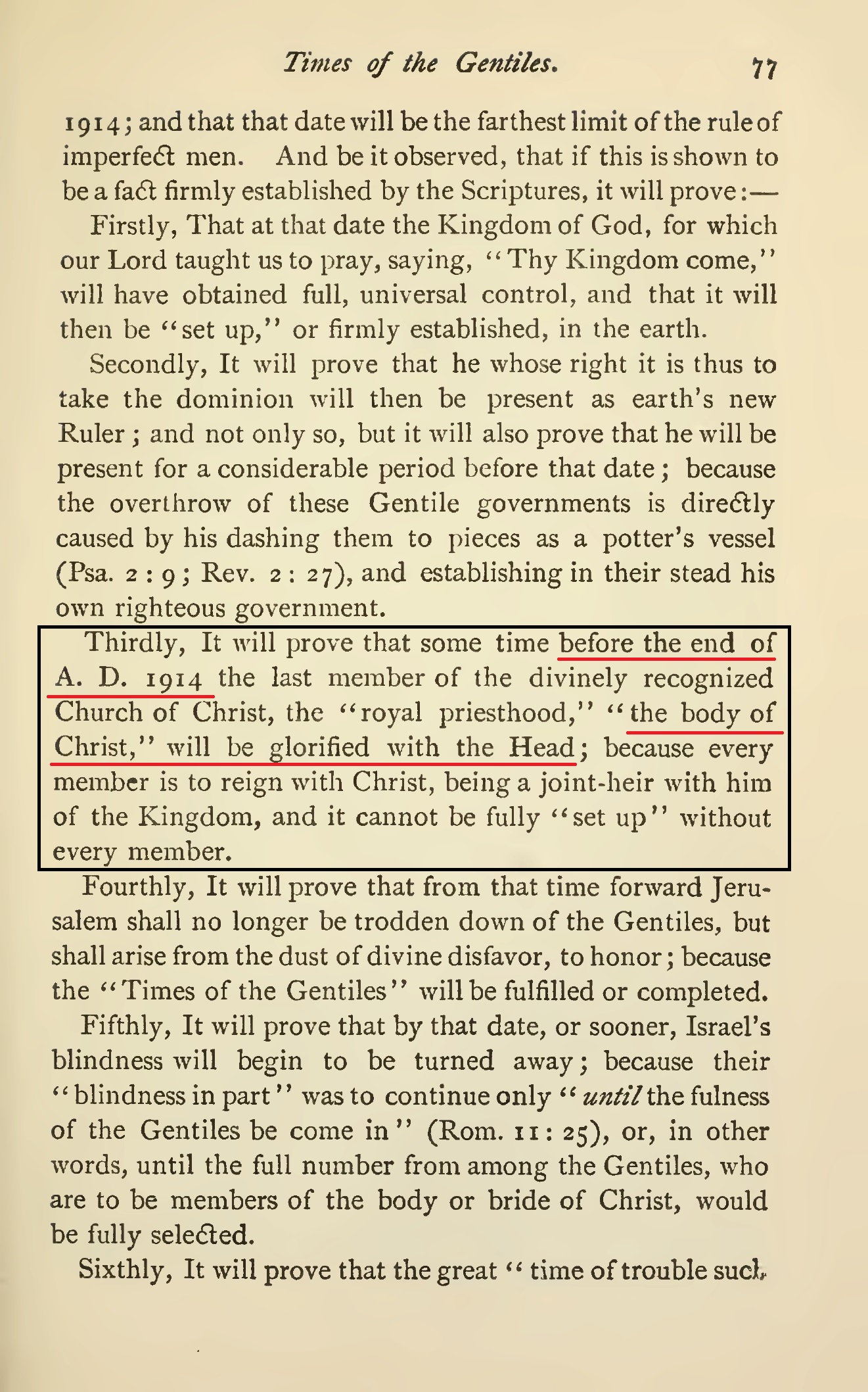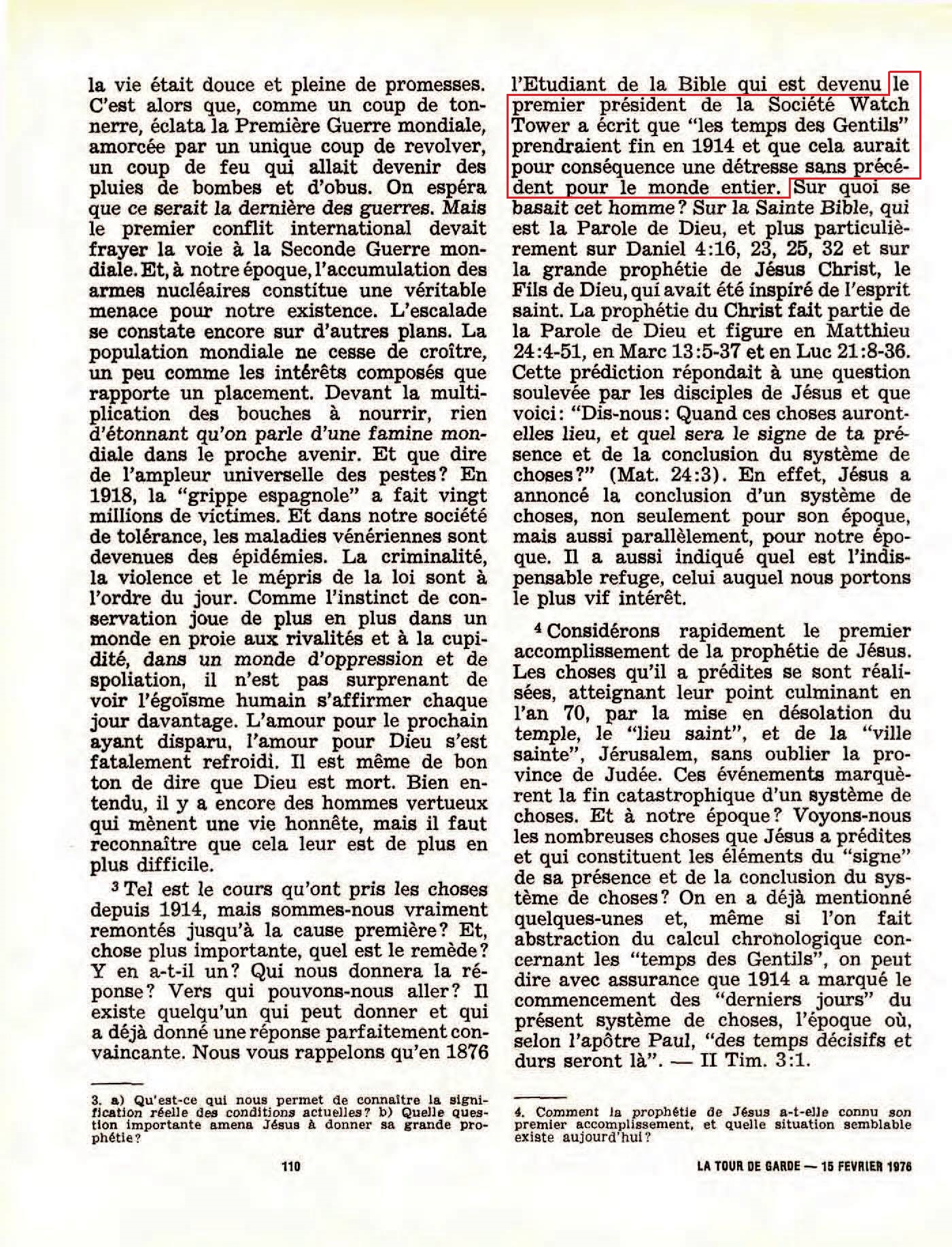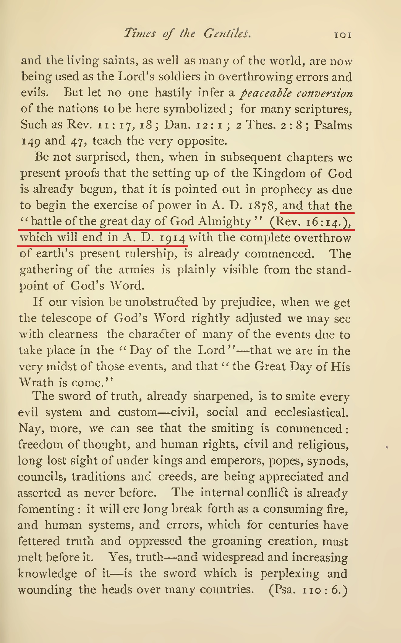 Russell fait plusieurs prophéties concernant 1914, Mais il n'y a aucune prédication de sa part au sujet du début d'une guerre mondiale cette année-là. Au contraire, Russell annonce la fin de la guerre par l'établissement complet du royaume de Dieu sur la terre. Il est bien clair que la SDTJ déforme délibérément les faits historiques à ses fins.