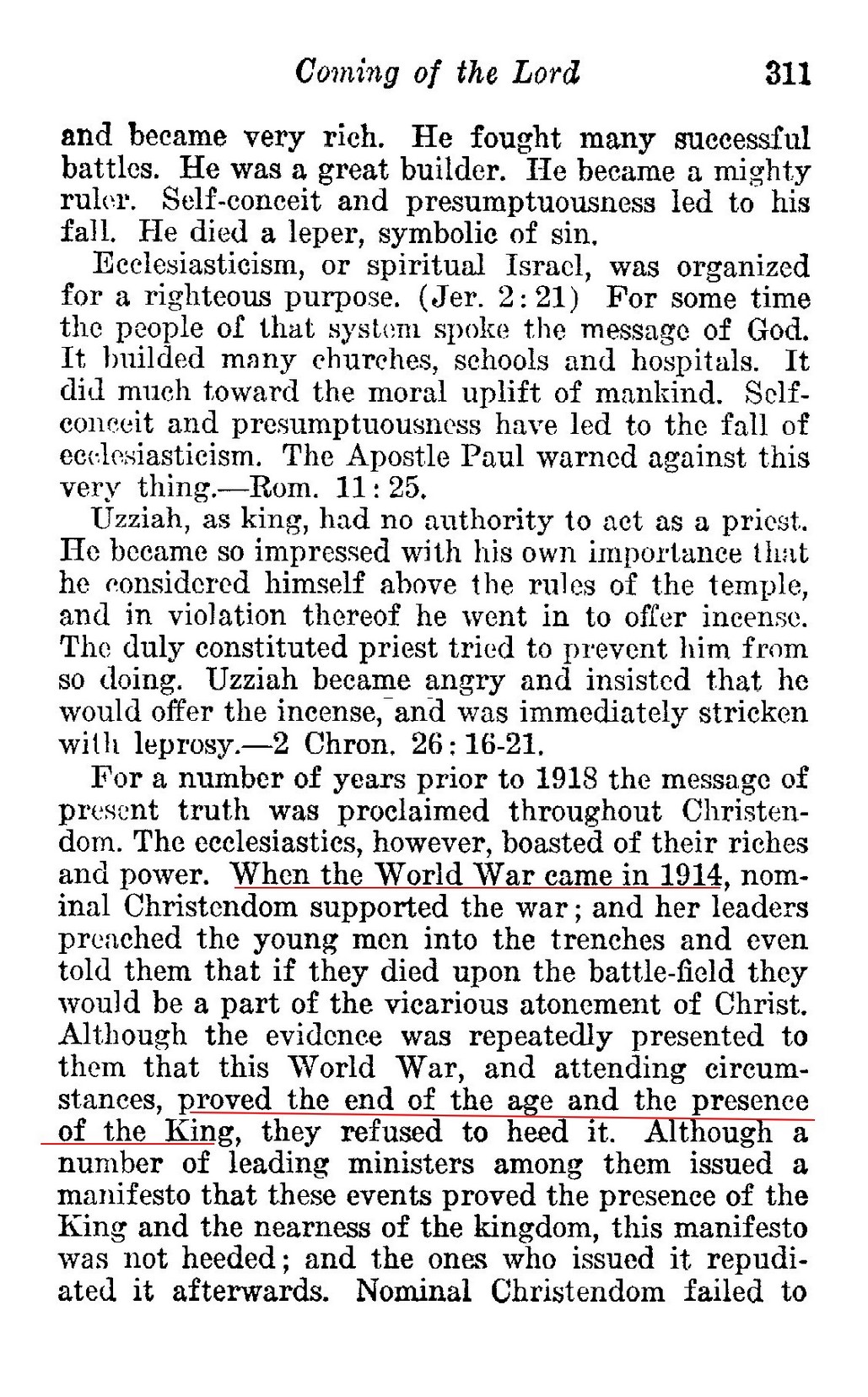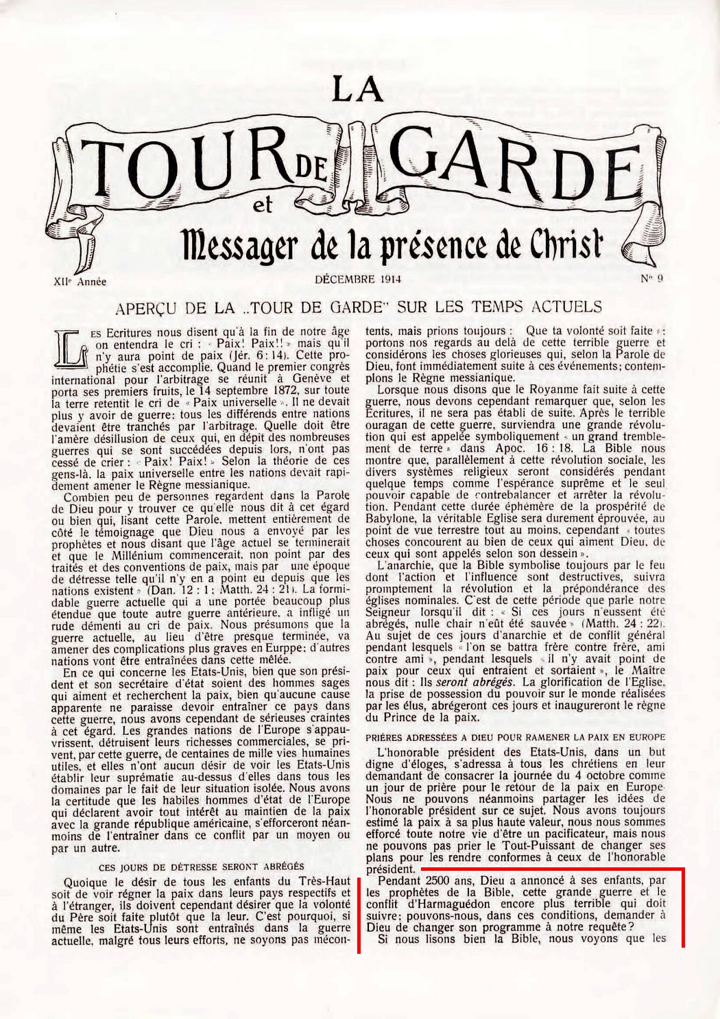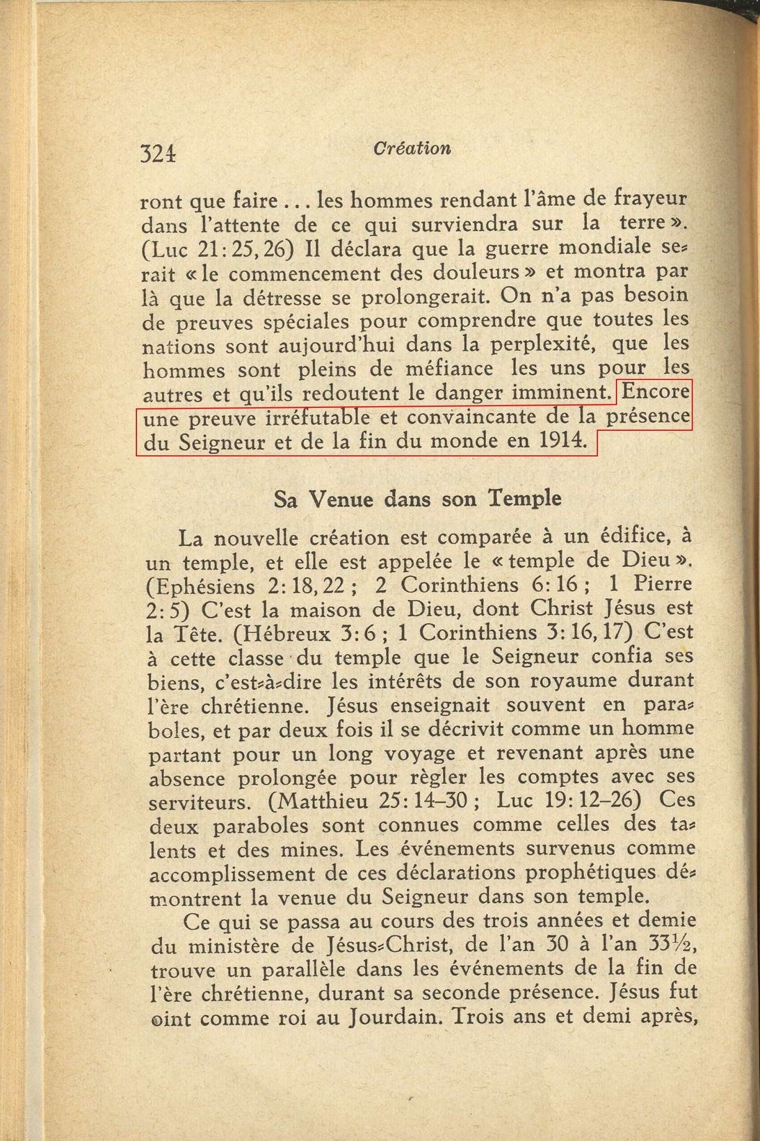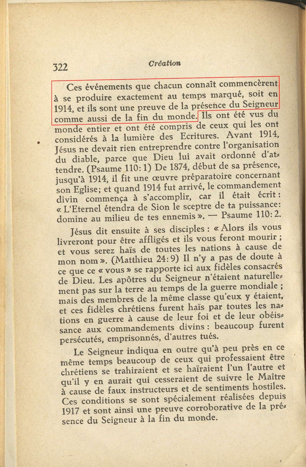 Russell fait plusieurs prophéties concernant 1914, Mais il n'y a aucune prédication de sa part au sujet du début d'une guerre mondiale cette année-là. Au contraire, Russell annonce la fin de la guerre par l'établissement complet du royaume de Dieu sur la terre. Il est bien clair que la SDTJ déforme délibérément les faits historiques à ses fins.