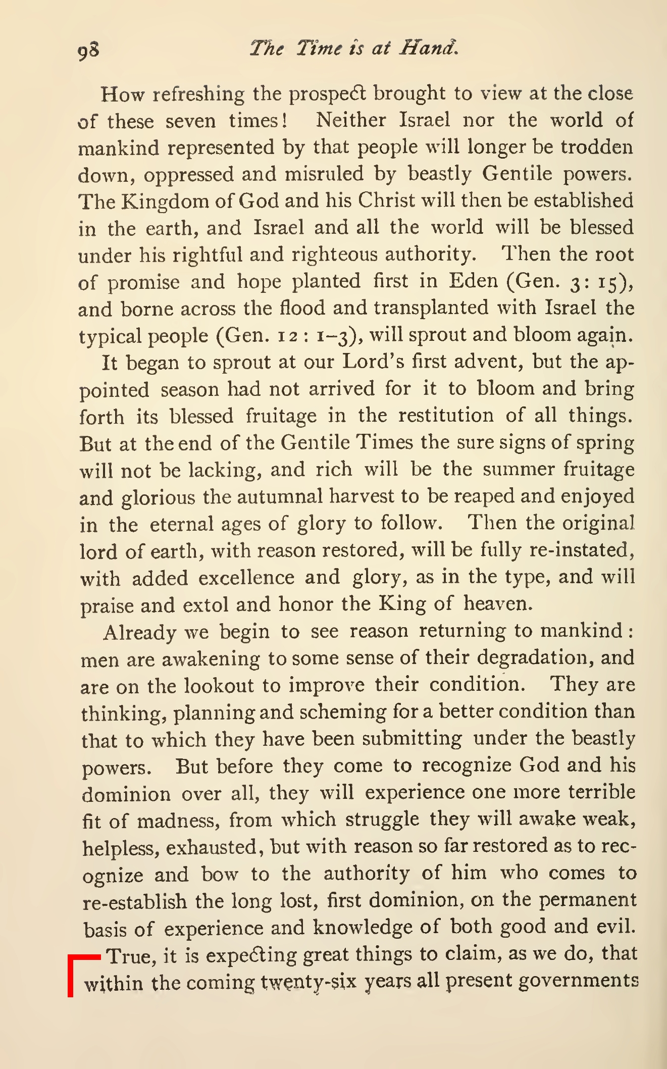 8) En 1914, tous les gouvernements des nations seront écrasés et le royaume de Dieu sera établi et le paradis terrestre sera restauré :