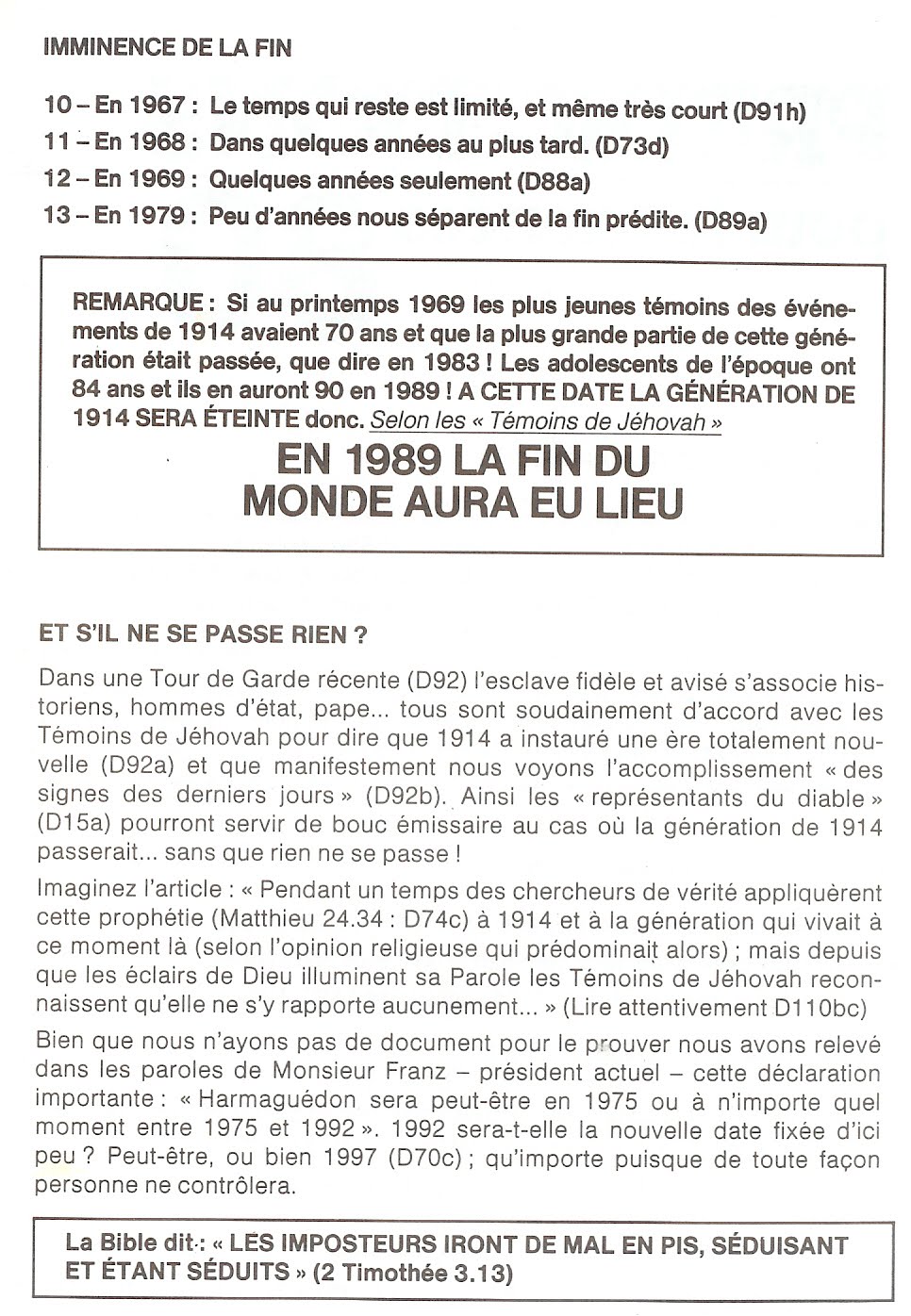 Nous pourrions encore multiplier les exemples de modifications opérées par la SDTJ dans le but de dissimuler ses fausses prophéties. Cela met déjà sérieusement en question leur crédibilité et l'origine divine de leur organisation!