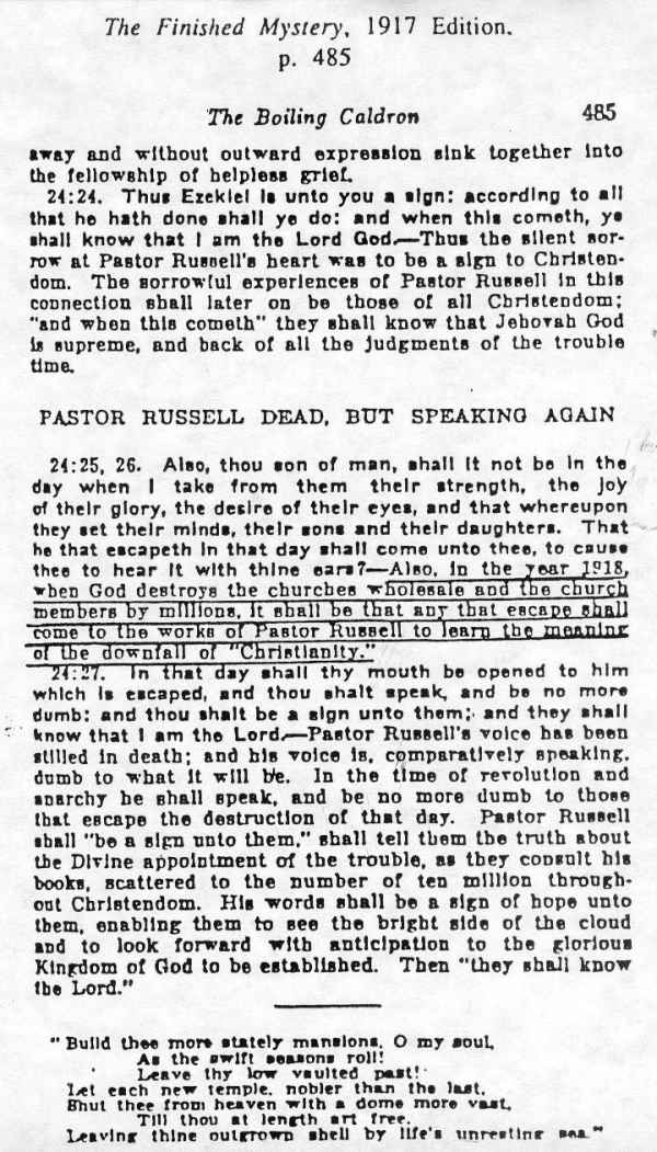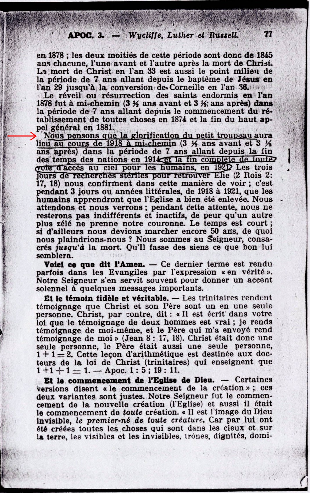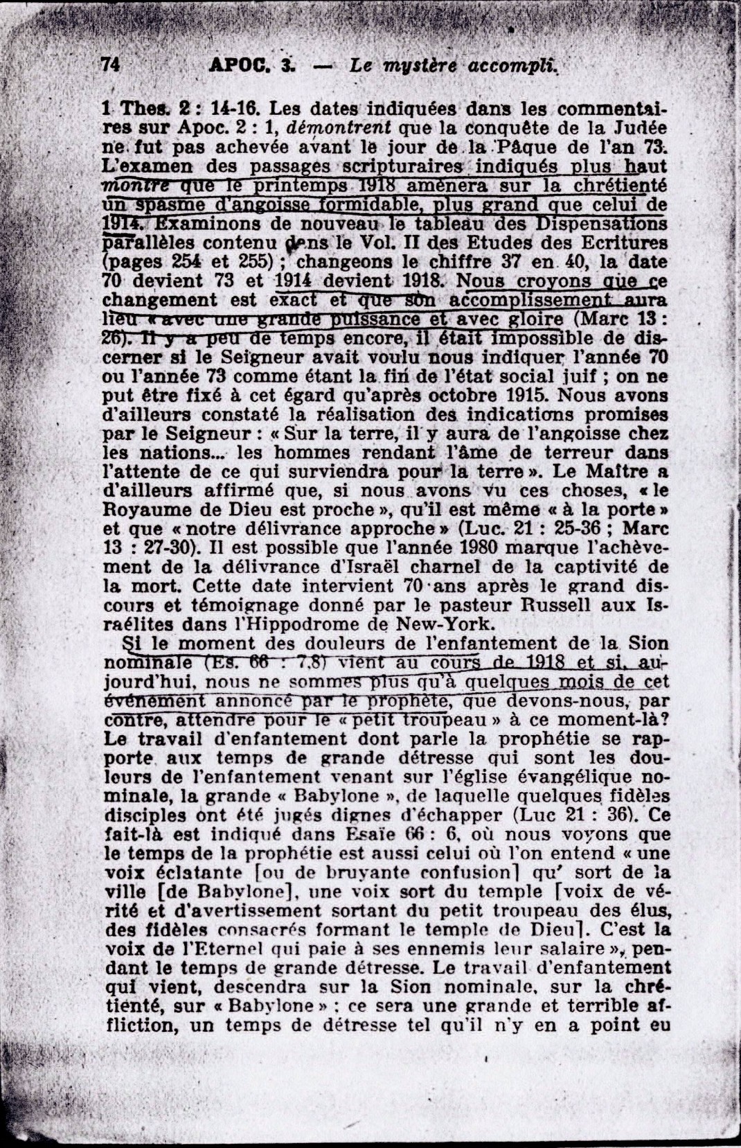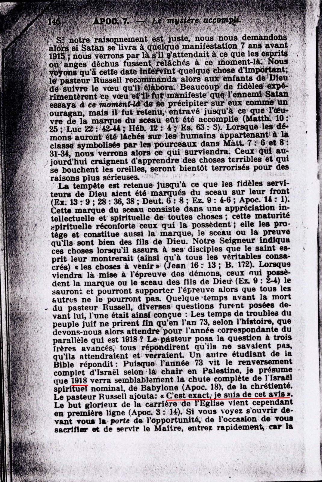 "En l'an 1918, quand la chrétienté en tant qu'organisation, tombera dans l'oubli (Shéol), que des républiques révolutionnaires lui succèderont..." (p.485).