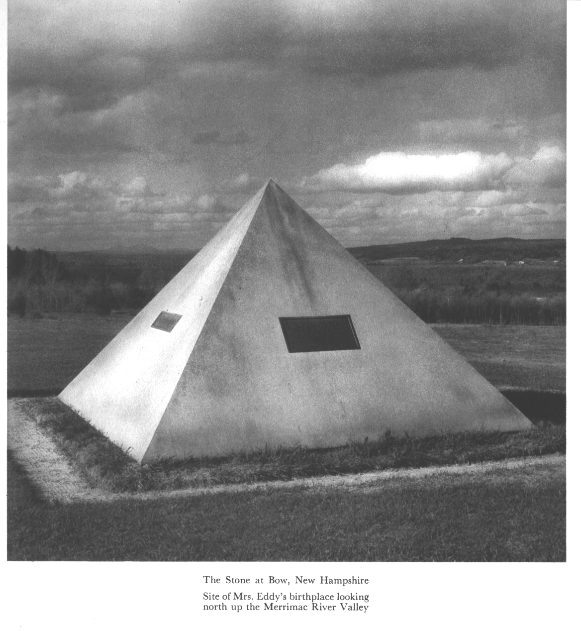 En 1921, à l’occasion du 100e anniversaire de la naissance d’Eddy, une pyramide de 100 tonnes (brut) et de 60 à 70 tonnes (taillée), avec une empreinte au sol de 121 pieds carrés (11,2 m2), a été consacrée sur le site de son lieu de naissance à Bow, New Hampshire. Cadeau de James F. Lord, elle a été dynamitée en 1962 sur ordre du conseil d’administration de l’Église. L’ancienne maison d’Eddy à Pleasant View a également été démolie, car le Conseil craignait qu’elle ne devienne un lieu de pèlerinage. Eddy est présentée sur un marqueur historique du New Hampshire (numéro 105), le long de la route 9 du New Hampshire, à Concord.