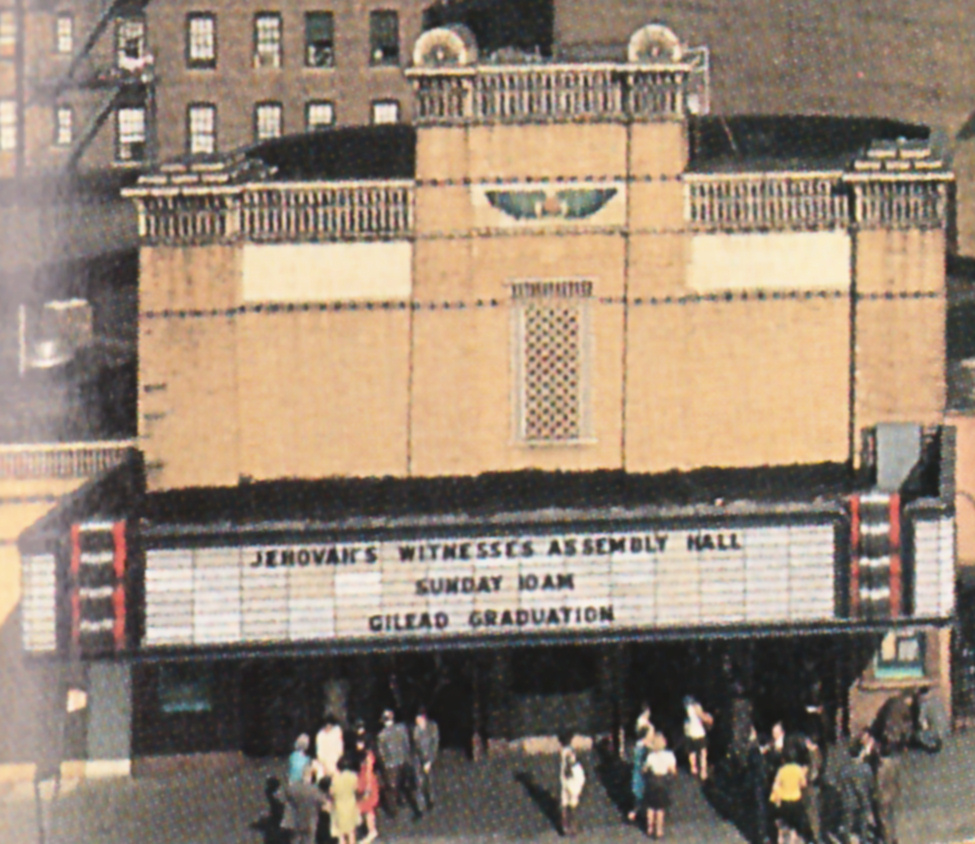 On peut très bien voir l'inscription « Jehovah's Witnesses Assembly Hall » sur la façade de la bâtisse, située dans le Queens à New York où avaient lieu ces réunions (cliquez sur la 1ère image pour l'agrandir). Le sujet de la réunion, à ce moment-là, était « God cannot lie » (Dieu ne peut pas mentir).