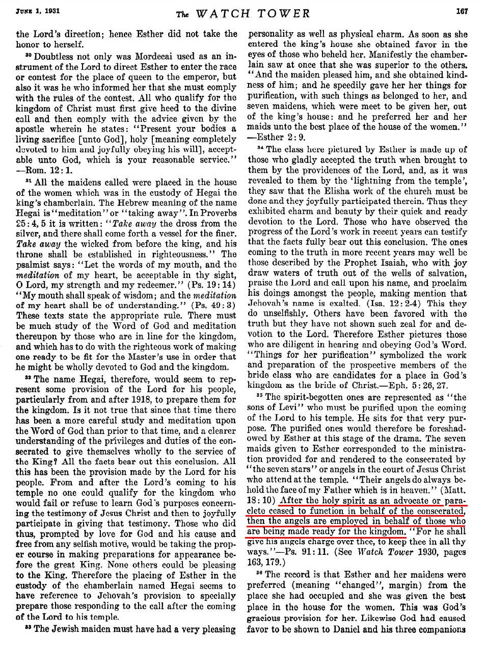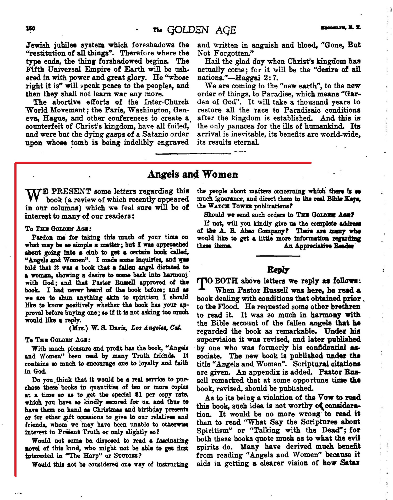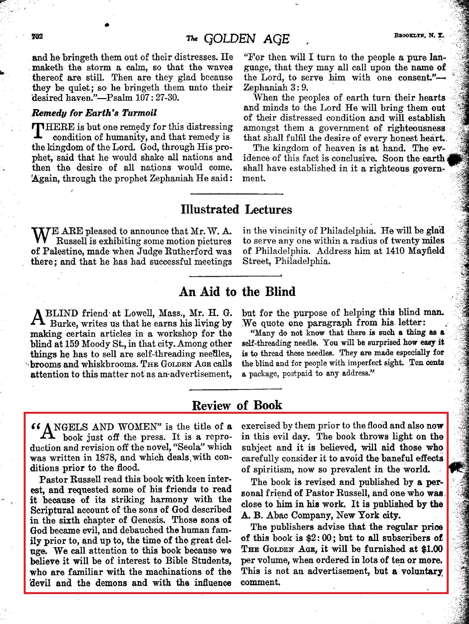 On voit encore l'esprit occulte derrière la publicité et la diffusion du livre Angels and Women, dans les journaux de la SDTJ. Ce livre a été dicté par la méthode d'écriture automatique (channeling) à un médium, de la part d'un ange déchu, qui voulait se réconcilier avec Dieu et obtenir sa faveur. Il est publié d'abord en 1878 par J. G. Smith, et est même conseillé par Russell, du fait qu'il apporte des éclaircissements aux six premiers chapitres de la Genèse. Rutherford conseille ce livre pour mieux connaître l'organisation de Satan et le monde des démons ! Le journal de la SDTJ The Golden Age (30 juillet 1924, page 702 et 3 décembre 1924, page 150, ainsi que page 151) propose ce livre à moitié prix à ses lecteurs. La SDTJ encourage aussi sa diffusion car ses enseignements ressemblent beaucoup à ceux de l'organisation. Le livre utilise souvent le nom « Jéhovah ». Rutherford croit que, parmi les anges déchus, de « bons démons » existent et veulent le bien des êtres humains. Il enseigne même qu'un jour ils pourraient être sauvés. Quelle approche dangereuse ! Quel enseignement démoniaque !