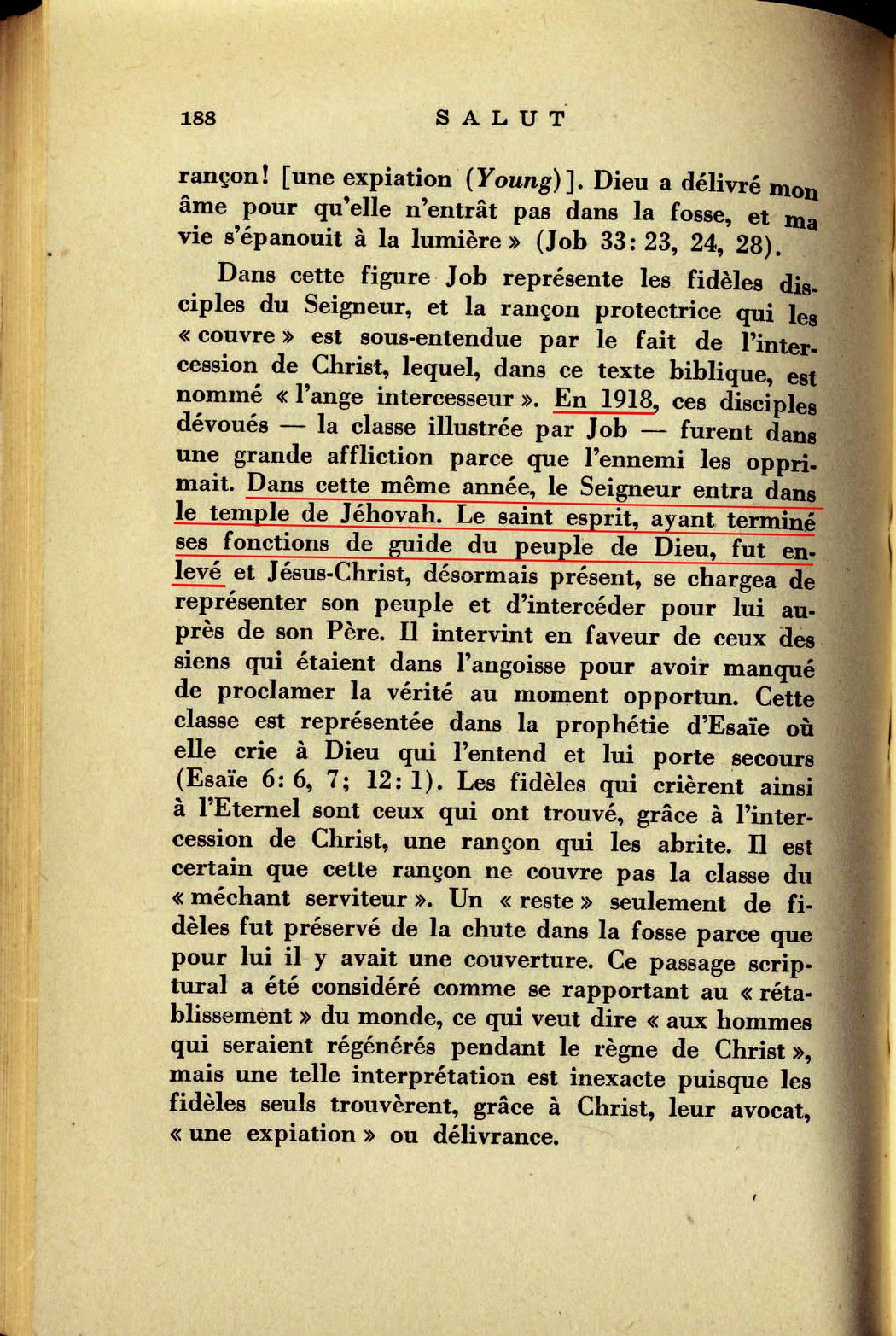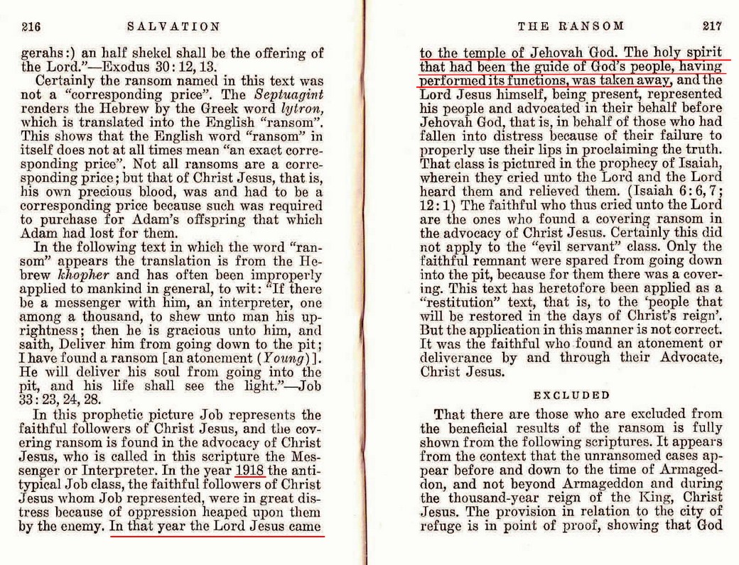 On voit également l'esprit occulte derrière l'affirmation de la SDTJ selon laquelle, depuis 1918, ce sont les anges qui transmettent les vérités divines au reste des oints. Rutherford enseigne que le vrai éclaircissement spirituel commence en 1918, et non en 1878. Selon lui, le « saint esprit » a achevé sa mission en 1918 et se trouve enlevé du reste (Salut, 1939, p. 188 ; voir aussi Préservation, p. 51 ; WT, 01/06/1931, p. 167).
