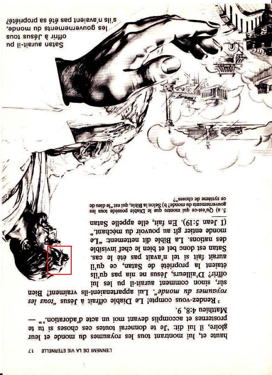 On voit encore l'esprit occulte derrière cette organisation dans les images subliminales publiées dans leur littérature. Certaines images publiées par la SDTJ contiennent des éléments subliminaux. Par exemple, dans le livre Vivre éternellement, à la page 17, on voit une image de Jésus. Lorsqu'on la retourne, on constate une tête diabolique sur la chevelure de Jésus. Cette forme est-elle là par pur hasard ?