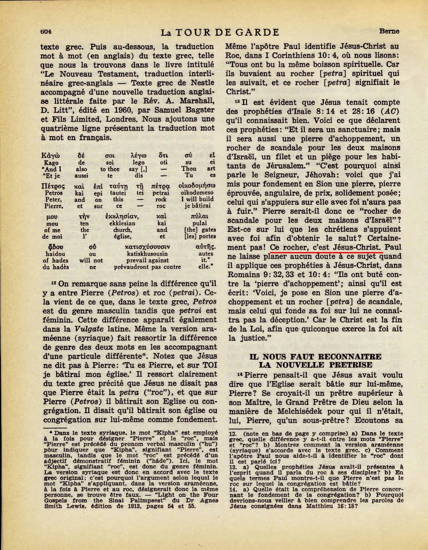 « Il est évident que Jésus tenait compte des prophéties d'Isaïe 8:14 et 28:16 (AC) qu'il connaît bien. Voici ce que déclarent ces prophéties : “ Et il sera un sanctuaire ; mais il sera aussi une pierre d'achoppement, un rocher de scandale pour les deux maisons d'Israël, un filet et un piège pour les habitants de Jérusalem. ” “ C'est pourquoi ainsi parle le Seigneur, Jéhovah : voici que j'ai mis pour fondement en Sion une pierre, pierre éprouvée, angulaire, de prix, solidement posée ; celui qui s'appuiera sur elle avec foi n'aura pas à fuir. ” Pierre serait-il donc ce rocher de scandale pour les deux maisons d’Israël ? Est-ce sur lui que les chrétiens s’appuient avec foi afin d’obtenir le salut ? Certainement pas ! Ce rocher, c’est Jésus-Christ. »