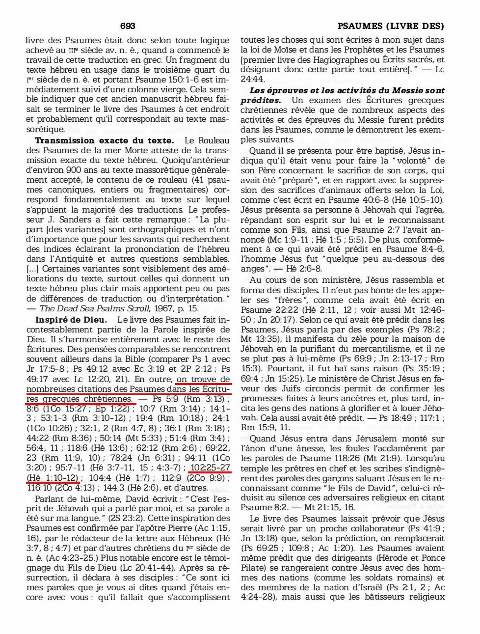 Ci-dessous, plusieurs sources Watchtower reconnaissent que Hébreux 1:10-12 reprend le Psaume 102:25-27.