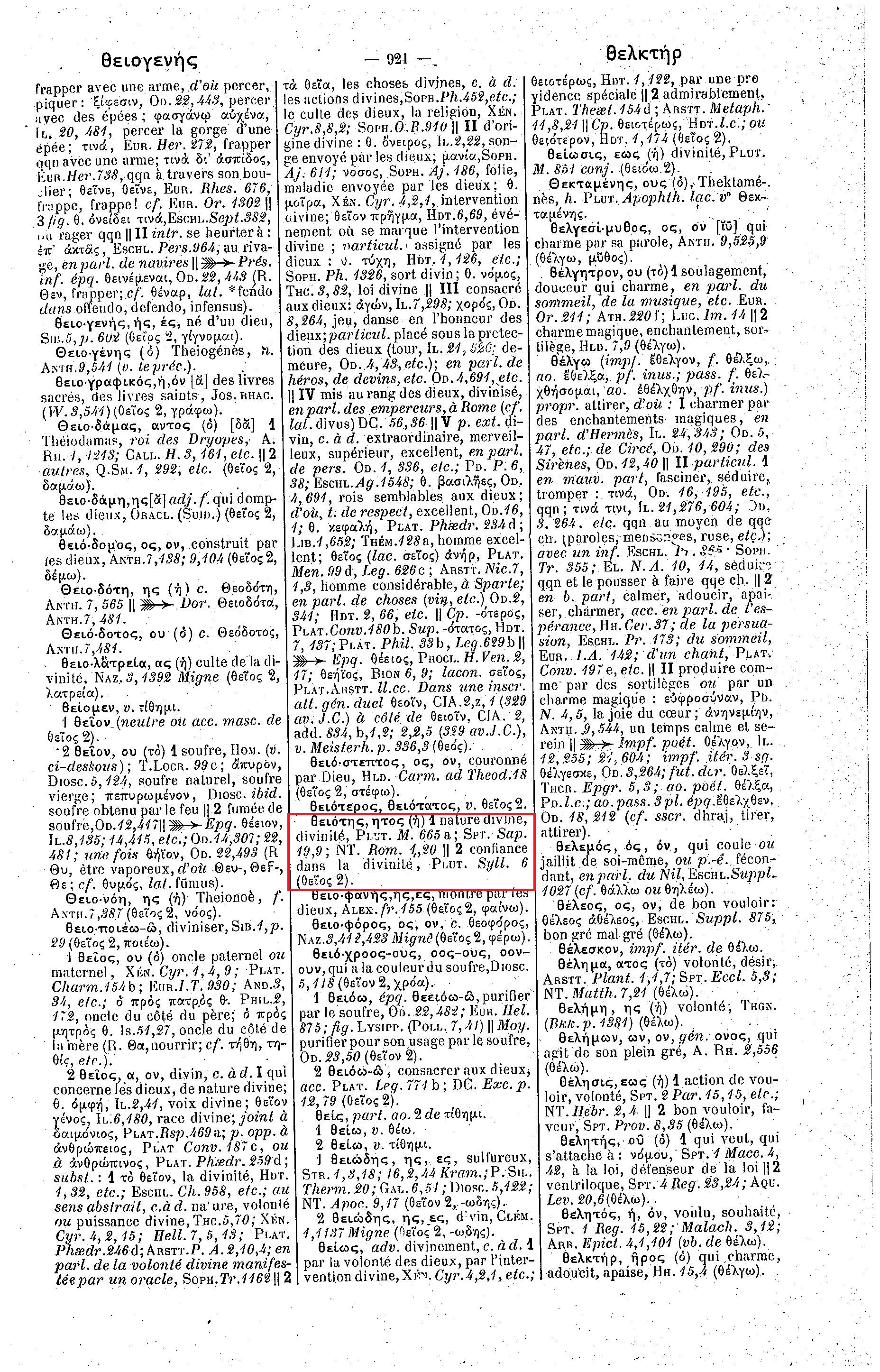 En disant que le Dictionnaire grec-français de A. Bailly donne à théotês le même sens fondamental qu'à théïotês, c'est-à-dire "divinité (nature divine)", l'organisation se tire une balle dans le pied. En effet, voici la définition Larousse du mot "divinité" :