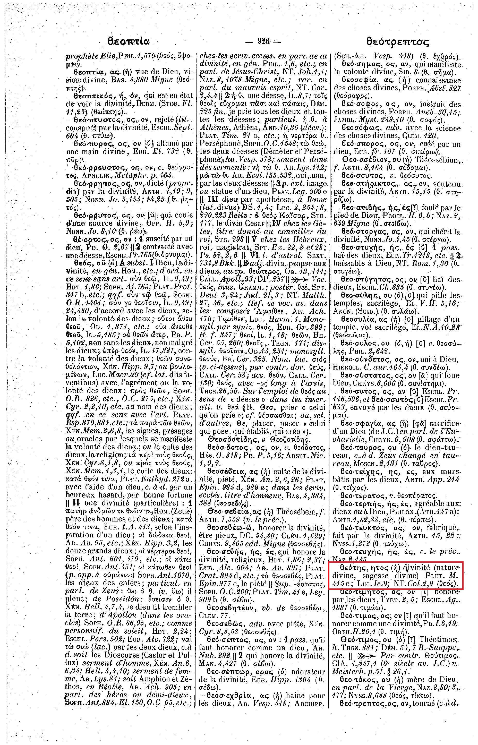 Puis, en Colossiens 2:9, l'apôtre Paul dit qu'en Christ "toute la plénitude de la qualité divine [forme de théotês] habite corporellement". Certaines traductions mettent "déité", ce qui. pour les trinitaires, signifie que Dieu habite personnellement en Christ (Ch ; Da ; voir aussi BFC). Toutefois, le Dictionnaire grec-français de A. Bailly donne à théotês le même sens fondamental qu'à théïotês, c'est-à-dire "divinité (nature divine)". (P.926) La Peshitta et la Vulgate traduisent ce mot par "divinité". Par conséquent, il y a ici aussi des raisons solides de traduire théotês par un terme qui désigne une qualité et non une personnalité. Un examen du contexte de Colossiens 2:9 montre clairement que posséder la "divinité", ou la "nature divine", ne fait pas de Christ le même que Dieu le Tout-Puissant. Dans le chapitre précédent, Paul déclare : "Dieu a jugé bon de faire habiter en lui toute plénitude." (Col 1:19). Ainsi, toute plénitude habite en Christ parce que cela "a plu au Père" (AG ; Sa) , parce que c'était "le bon plaisir du Père". (Ma.) La plénitude de la "divinité" qui habite en Christ est donc sienne par suite d'une décision prise par le Père. L'apôtre Paul parle plus loin de Christ comme étant "assis à la droite de Dieu", ce qui montre encore que posséder cette "plénitude" ne fait pas de Jésus Christ la même personne que le Dieu Tout-Puissant. - Col 3:1.