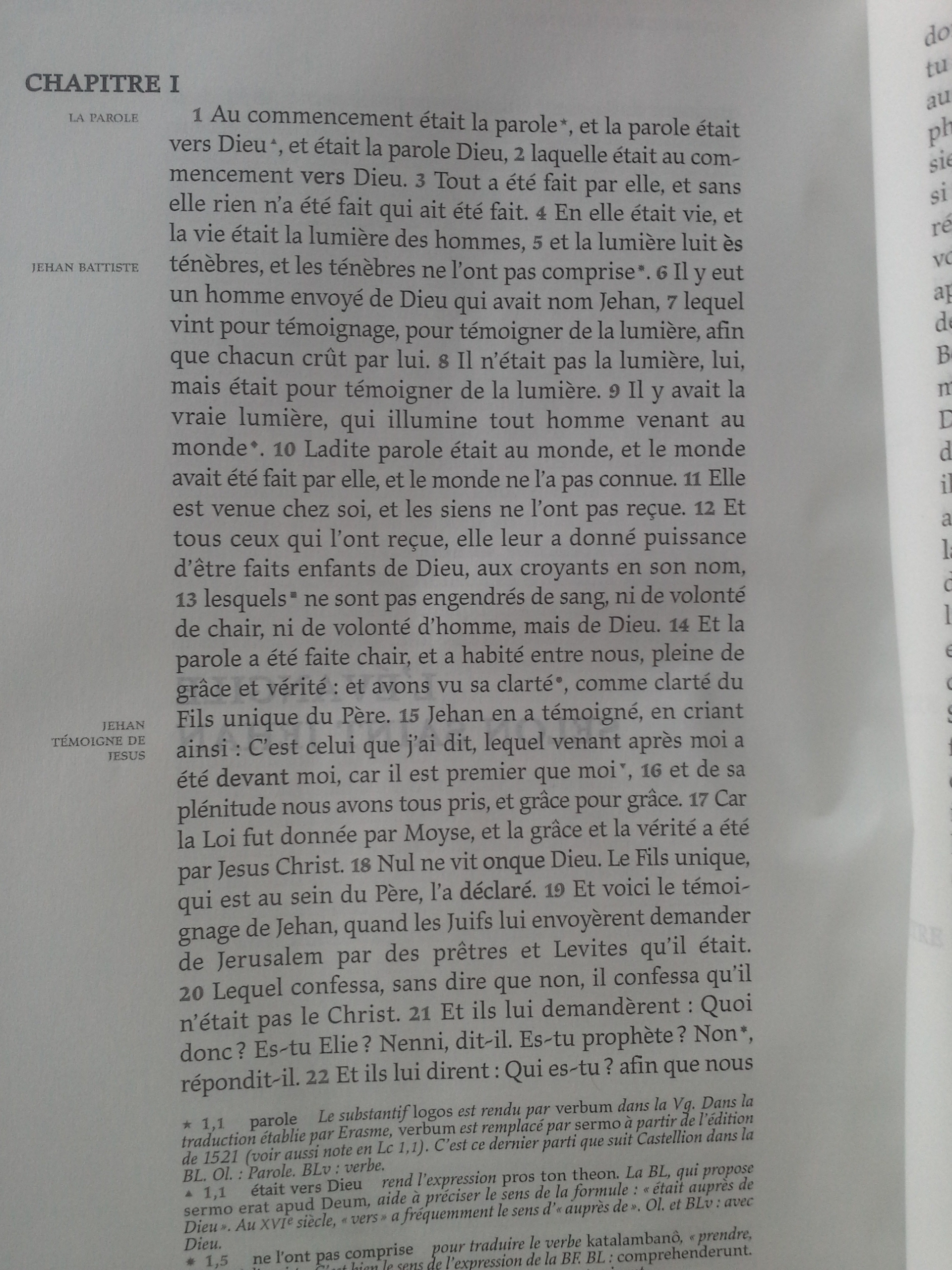 - Au commencement était la Parole, et la Parole était vers Dieu, et était la Parole Dieu. (La Bible de Sébastien Castellion, 1555)