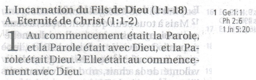 - Au commencement était la Parole, et la Parole était avec Dieu, et la Parole était Dieu. (Bible Annotée de Neufchâtel)
