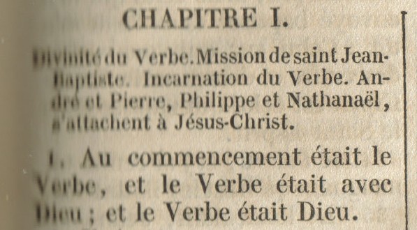 - Au commencement était le Verbe, et le Verbe était avec Dieu, et le Verbe était Dieu. (La Bible de l'abbé Genoude, 1880)