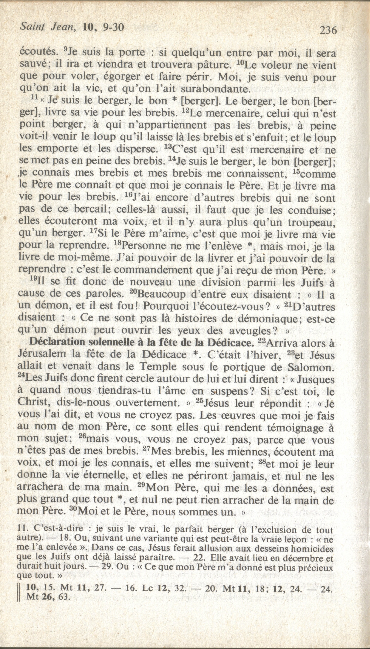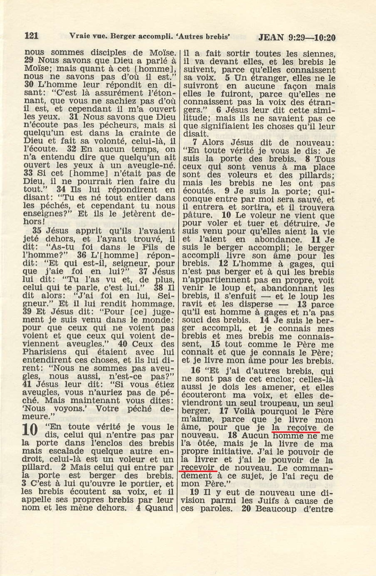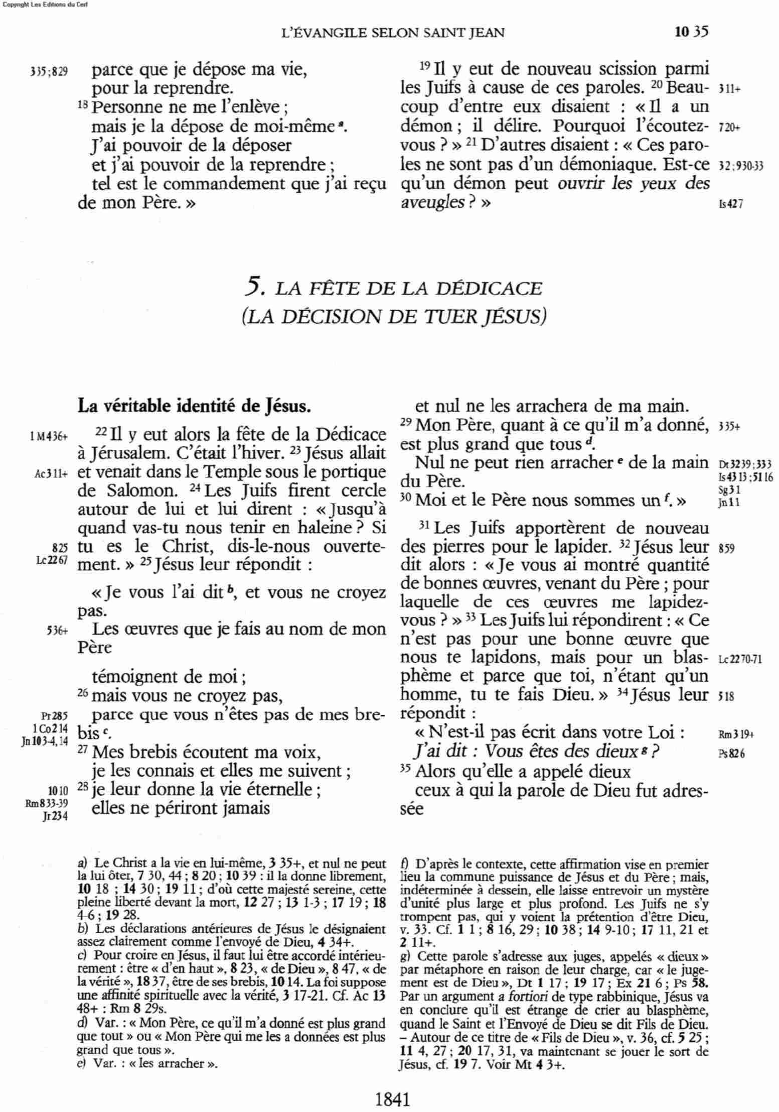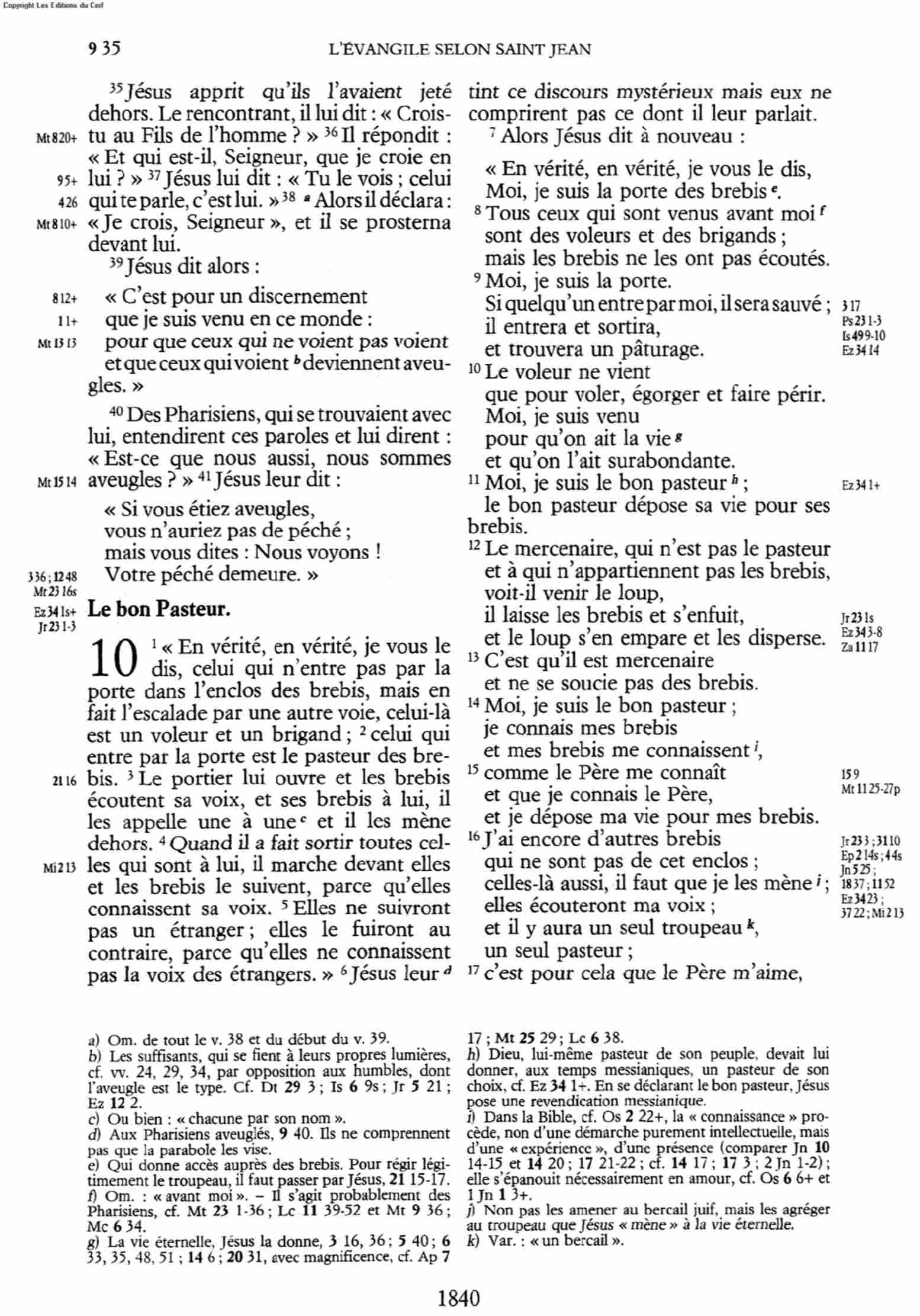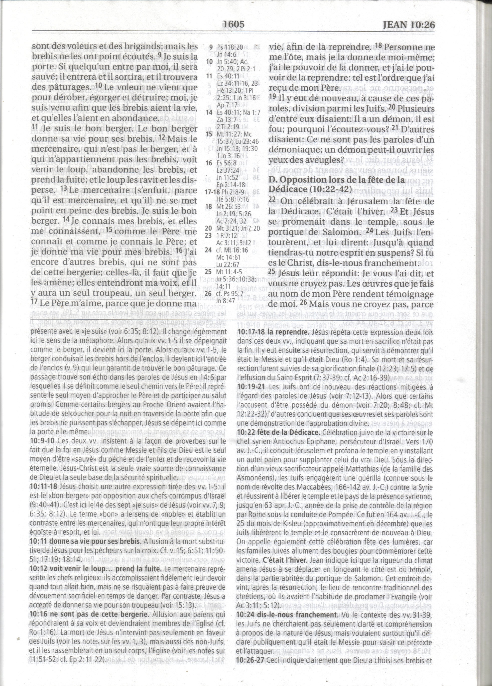 - N.T. (Annoté) par le T. R. Père Buzy - édition 1949 : « C'est pour ceci que le Père m'aime, parce que je donne ma vie, toutefois avec [pouvoir] de la reprendre. 18 Personne ne peut me l'enlever, c'est de mon propre gré que je la donne. J'ai le pouvoir de la donner et le pouvoir de la reprendre … 📘 📖