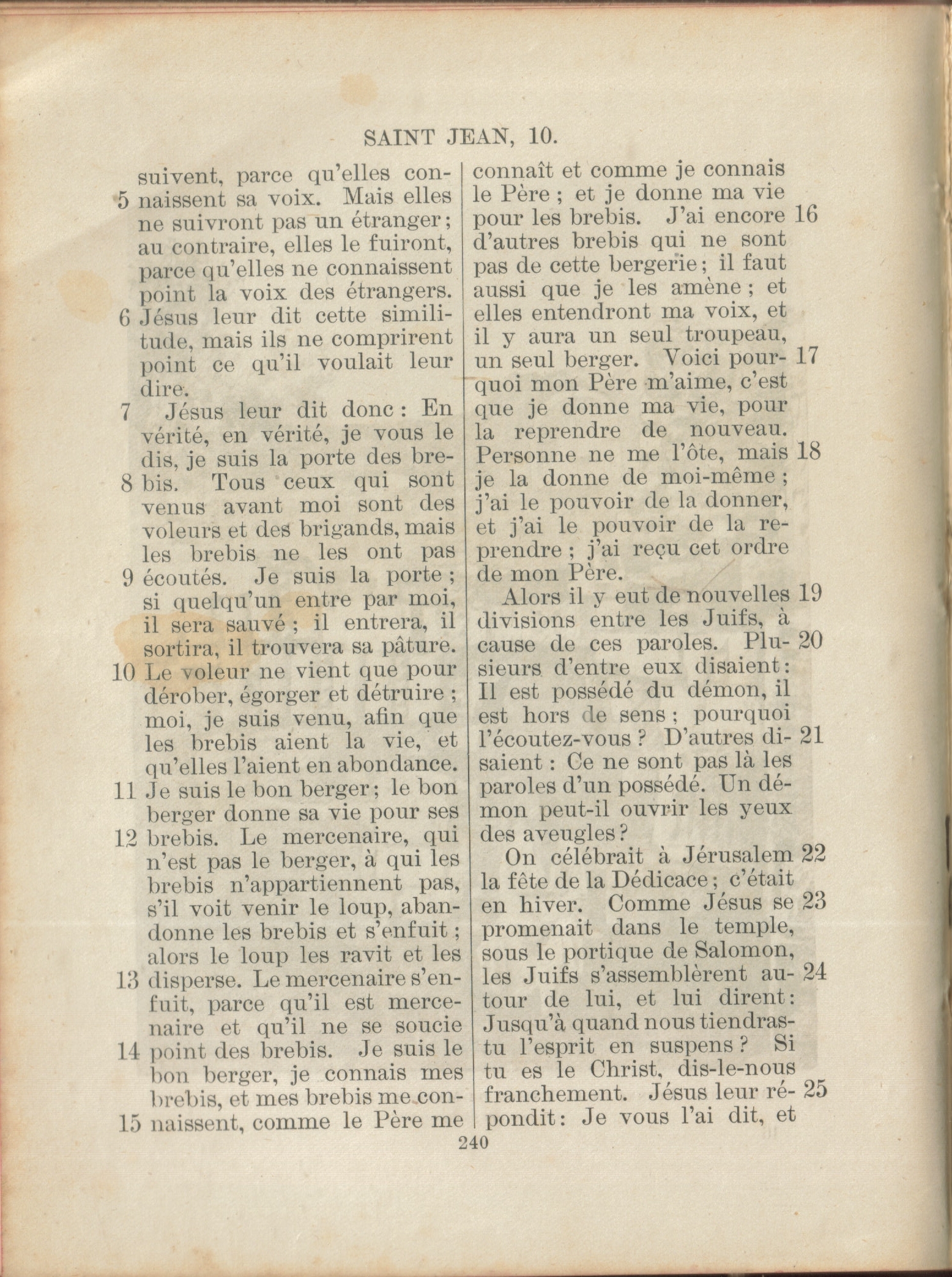 - La Bible, Amiot & Tamisier 1950 : C’est pour cela que le Père m’aime, parce que je donne ma vie ; mais c’est pour la reprendre ensuite. 18Personne ne peut me l’enlever, mais c’est moi qui la donne de moi-même. J’ai le pouvoir de la donner, et j’ai le pouvoir de la reprendre … 🌐