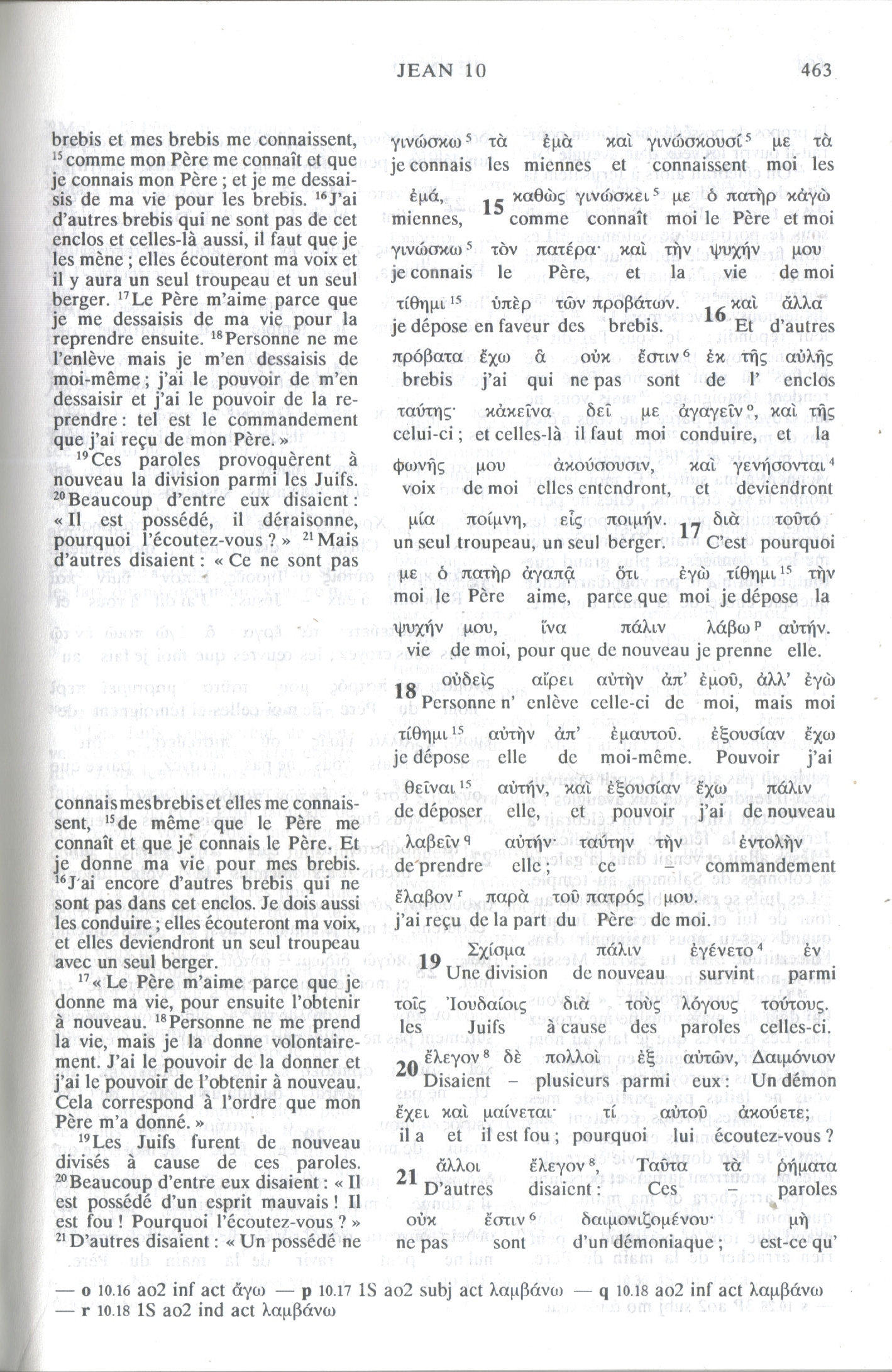 Grec : « οὐδεὶς αἴρει αὐτὴν ἀπ᾿ ἐμοῦ, ἀλλ᾿ ἐγὼ τίθημι αὐτὴν ἀπ᾿ ἐμαυτοῦ· ἐξουσίαν ἔχω θεῖναι αὐτήν, καὶ ἐξουσίαν ἔχω πάλιν λαβεῖν αὐτήν· ταύτην τὴν ἐντολὴν ἔλαβον παρὰ τοῦ Πατρός μου. »