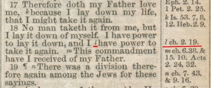 On observe ici que la bible anglaise a choisi de traduire par « I have power to take it again », donc « J'ai le pouvoir de la reprendre » (sa vie). Ce qui est en accord avec le renvoi vers Jean 2:19 où Jésus dit en parlant de son corps « je le relèverai ». Car selon ces deux versets Jésus a un rôle actif dans sa résurrection.