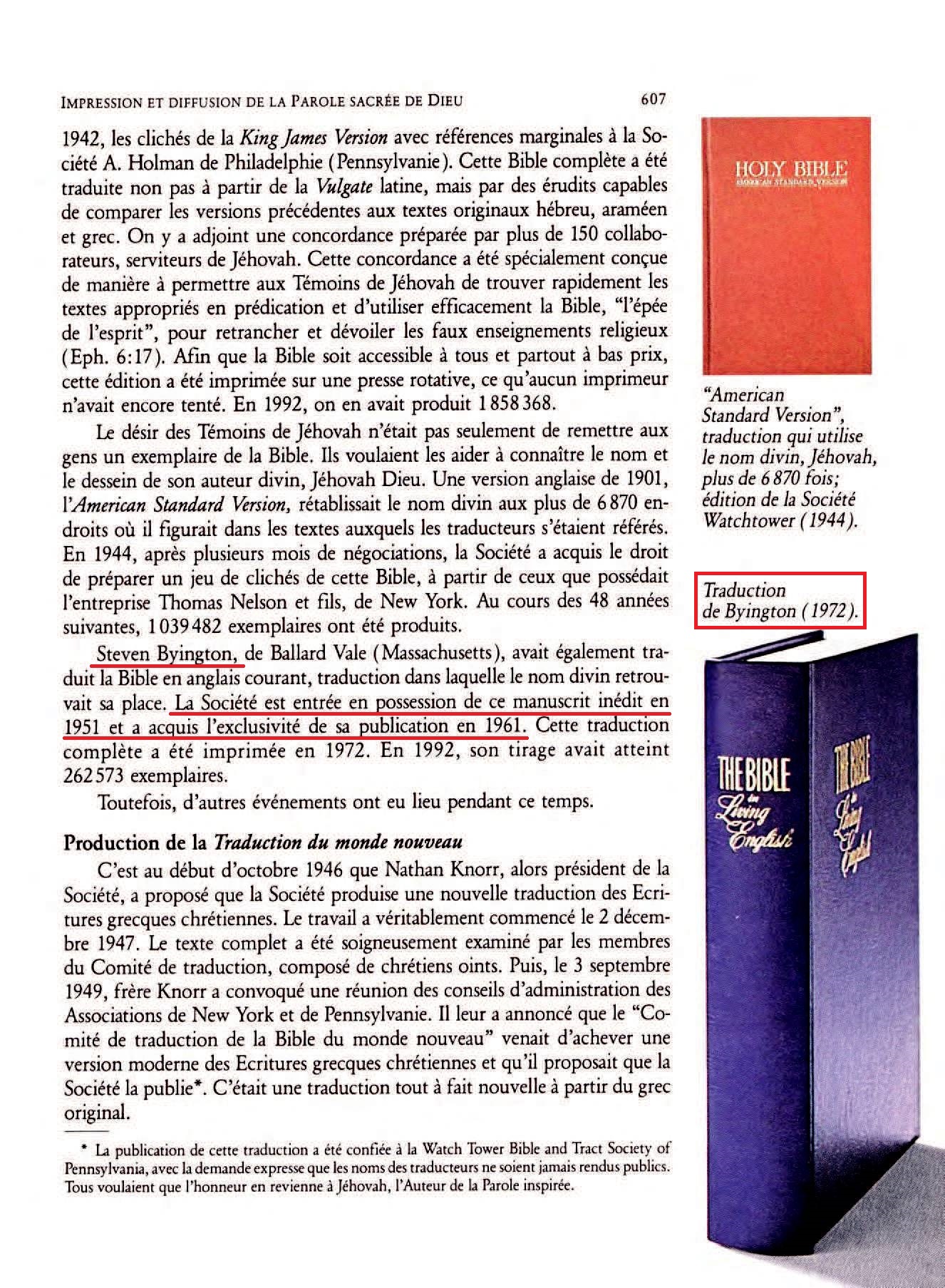Intéressons-nous maintenant à la traduction de Byington, dont la Société des TJ a acquis l'exclusivité de sa publication en 1961. Cette traduction complète a été imprimée en 1972 (Source : les Témoins de Jéhovah prédicateurs du royaume de Dieu, page 607).