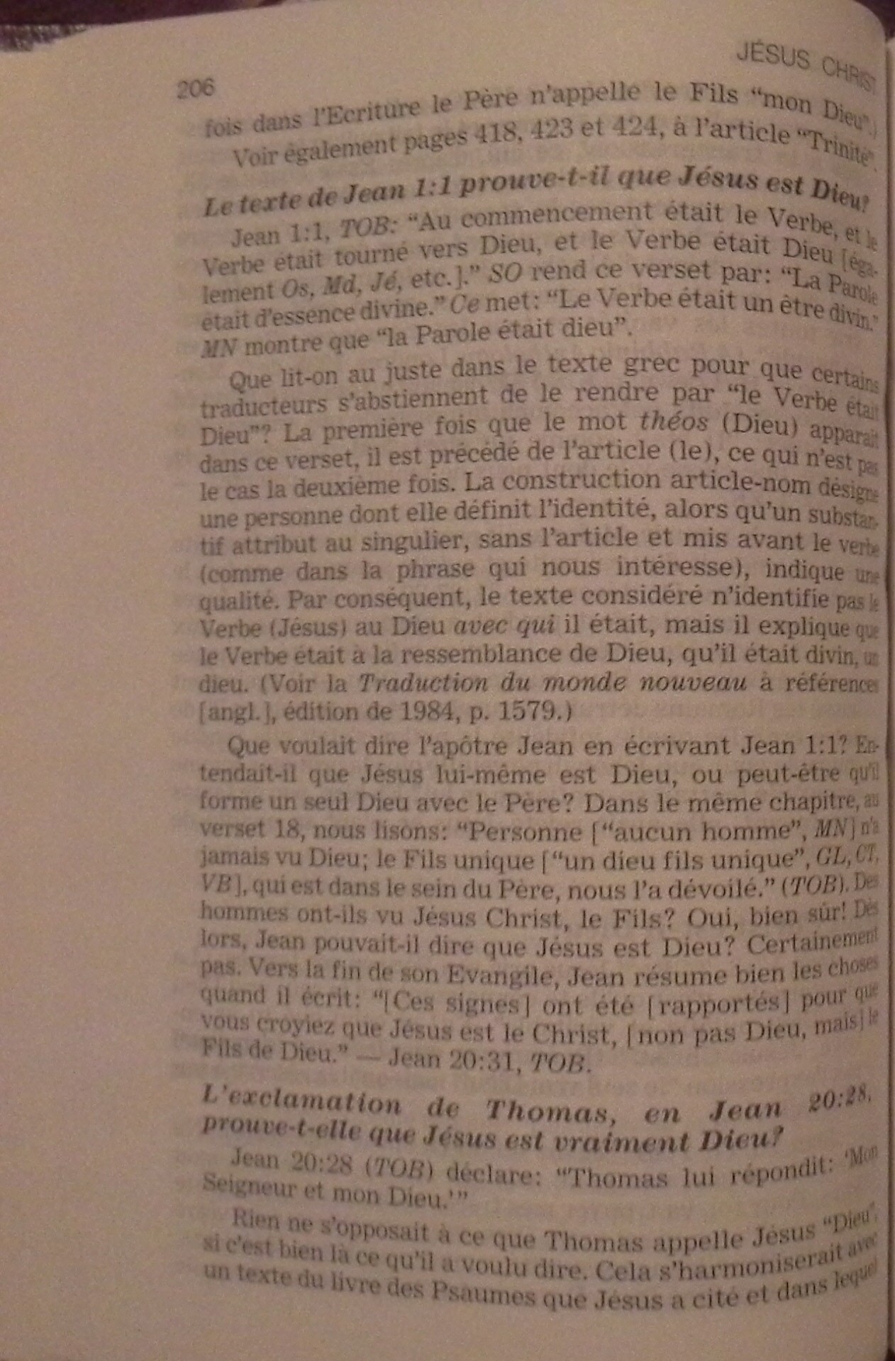 Dans ce verset de la Traduction du monde nouveau (la Bible des TJ), nous lisons que Thomas appelle Jésus "mon Dieu" avec un "D" majuscule. C'est ainsi que traduisent toutes les Bibles en français (sauf exception, Chouraqui traduisant en hébreu). Le texte grec ne pouvant être contesté, l'organisation des témoins de Jéhovah n’en accepte pas le message. Reniant la divinité exprimée par la bouche de Thomas, l'organisation donne une explication particulière à ses fidèles. Nous pouvons lire celle-ci dans leur livre intitulé "Comment Raisonner à partir des Écritures" (publié par la wt en 1986), aux pages 206 et 207 :