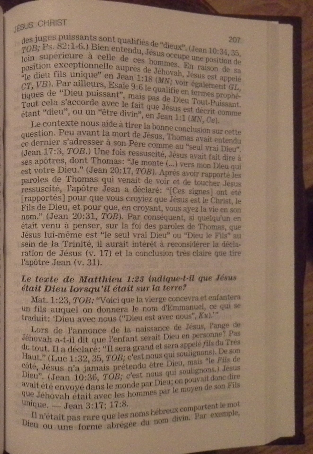 Réponse : On observe ici à une subtile manœuvre de langage de la part de l'organisation des témoins de Jéhovah. Qui faisant une citation d'Ésaïe 9:6 choisit soigneusement d'attribuer à Jésus l'expression « Dieu puissant », au lieu de « Dieu fort » qu'elle a pourtant imprimé dans sa propre Traduction du monde nouveau, ainsi que dans ses ouvrages.