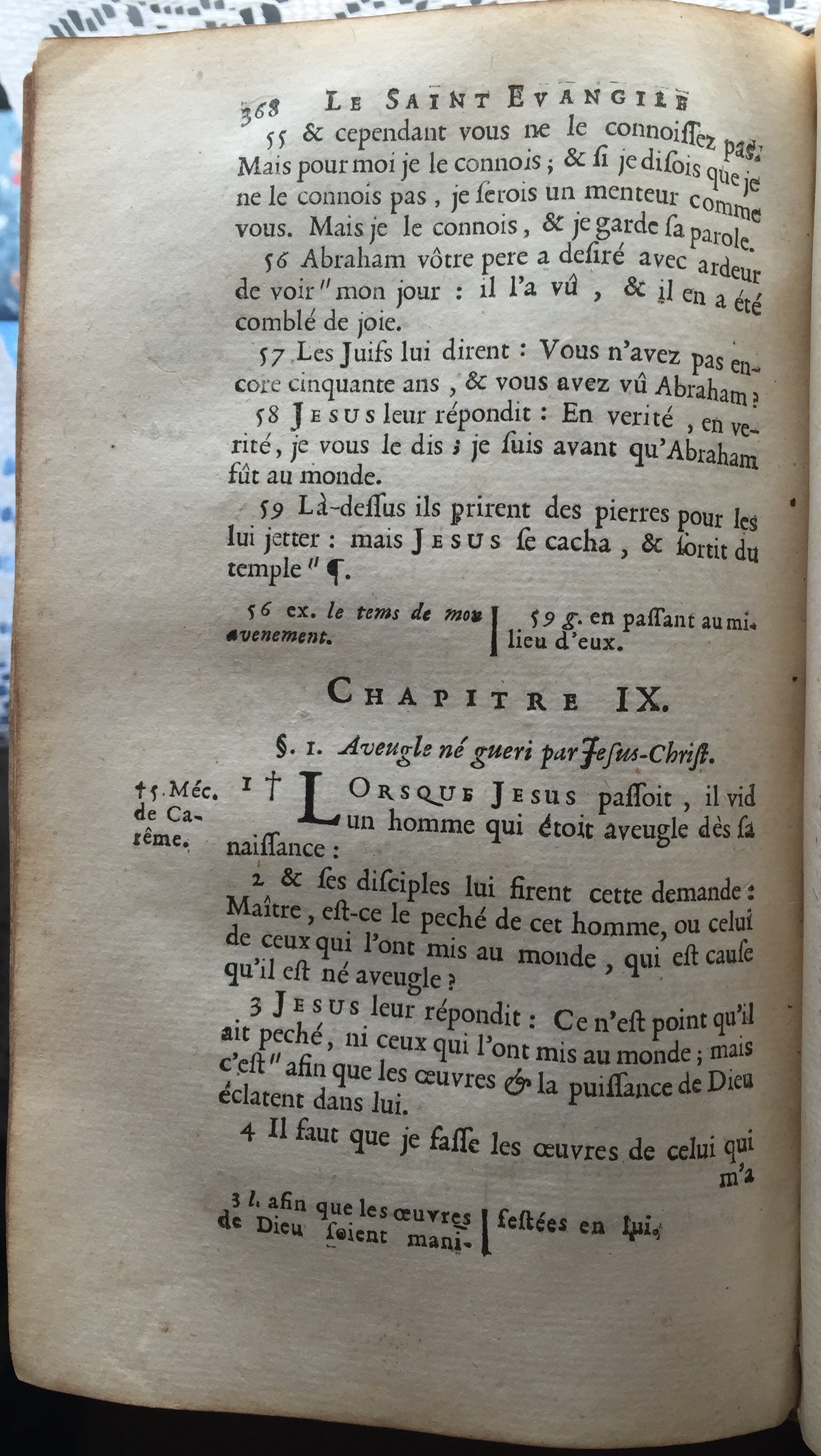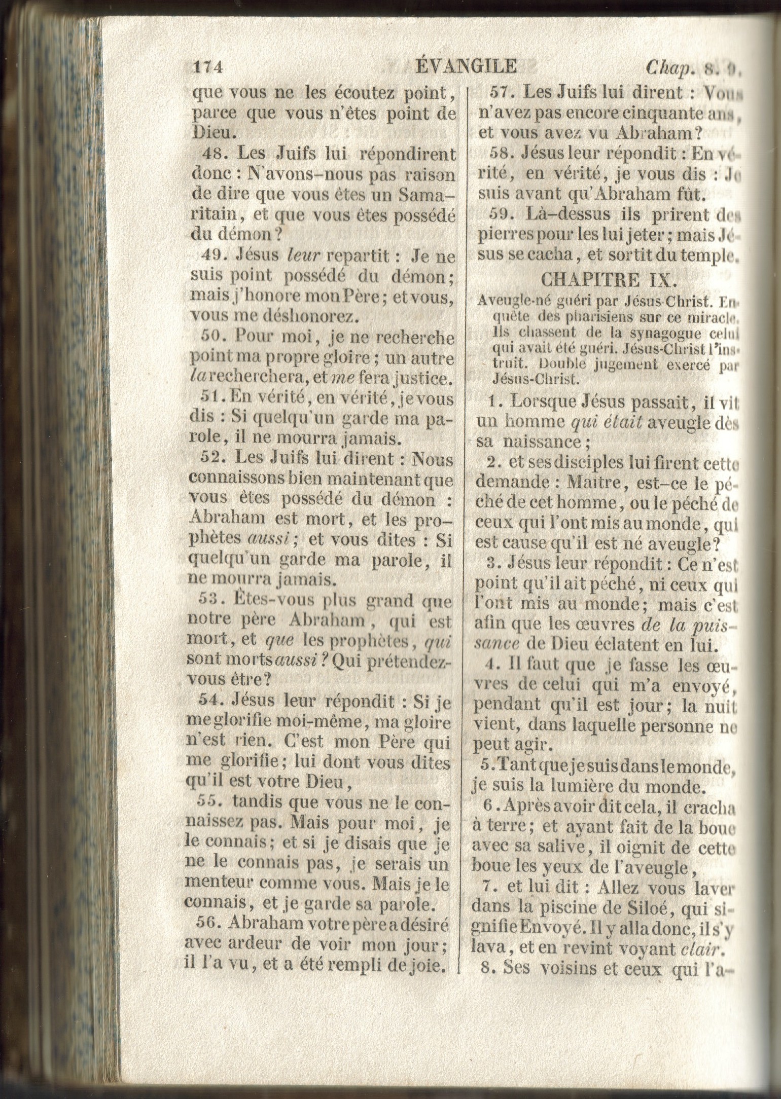 - En vérité, en vérité, je vous dis : Je suis avant qu'Abraham fût. (NT par LeMaistre de Sacy - version de 1844)