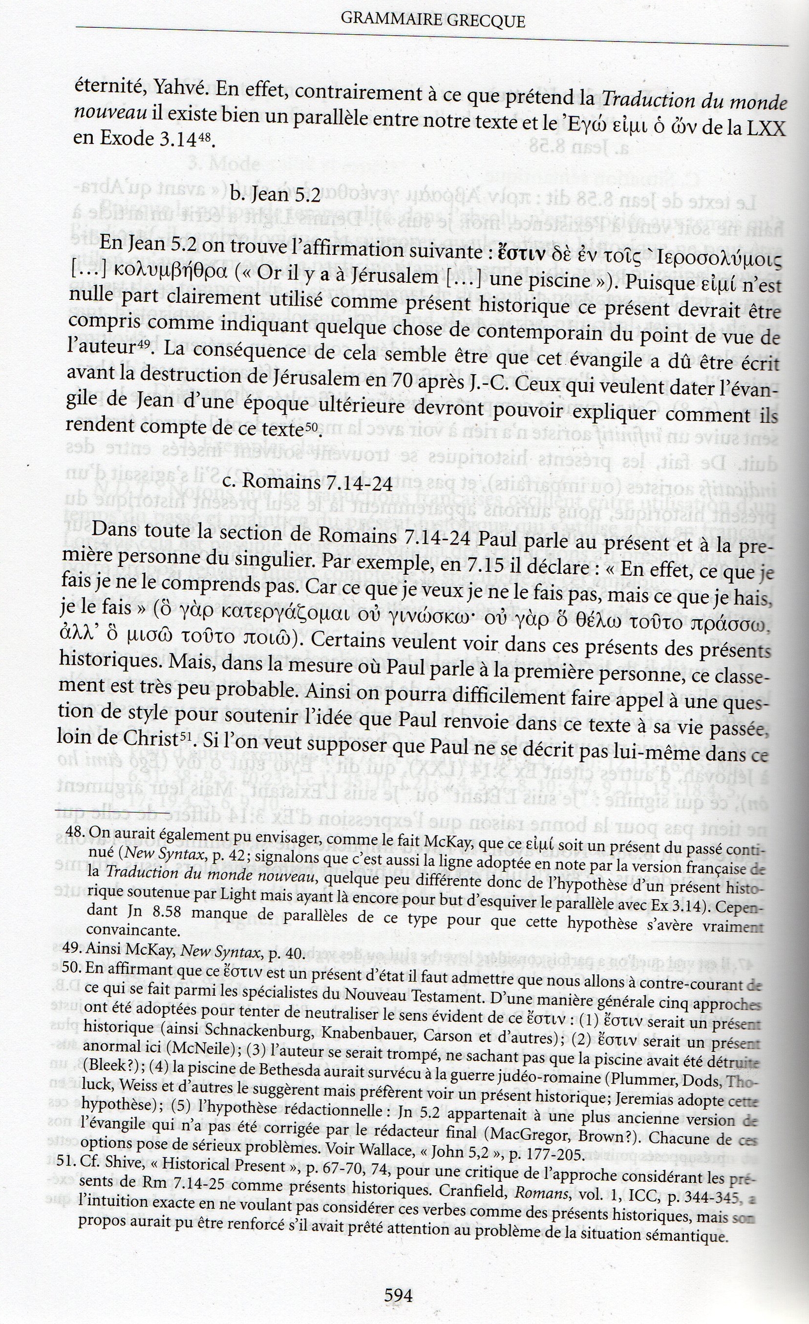 47. Il est vrai que l'on a parfois considéré le verbe εἰμί ou des verbes à la première personne comme des présents historiques. Cependant la plupart rejettent cette identification des passages suggérés (cf. le traitement de cette question par R.L. Shive, "The Historical Present in the New testament", et D.B. Wallace, "John 5,2 and the Date of the fourth Gospel", Bib 71, 1990, p. 177-205). Une juste approche de la syntaxe doit se fonder sur des exemples légitimes et indiscutables. Les exemples plus incertains doivent correspondre aux contours de ces exemples clairs, sans quoi ils demeurent suspects. Cela ne veut pas dire qu'il serait impossible que εἰμί puisse être, par exemple en Jn 8.58, un présent historique. Cela signifie toutefois que celui qui avance cette hypothèse devra pouvoir en apporter les preuves. Malheureusement l'approche grammaticale souvent adoptée à l'égard de ces passages discutés consiste trop souvent à (a) trouver une catégorie d'emploi qui correspond à nos présupposés pour ensuite (b) ignorer la situation sémantique habituelle dans laquelle apparaît cette catégorie et argumenter de sa justesse pour le passage en question sur la base du contexte (qui doit être interprété) et de divers autre artifices. Le contexte joue certes un rôle très important dans l'exégèse - souvent même plus que la grammaire proprement dite, - mais la grammaire fait plus que fournir un éventail d'options interprétatives parmi lesquelles piocher ce qui nous convient.