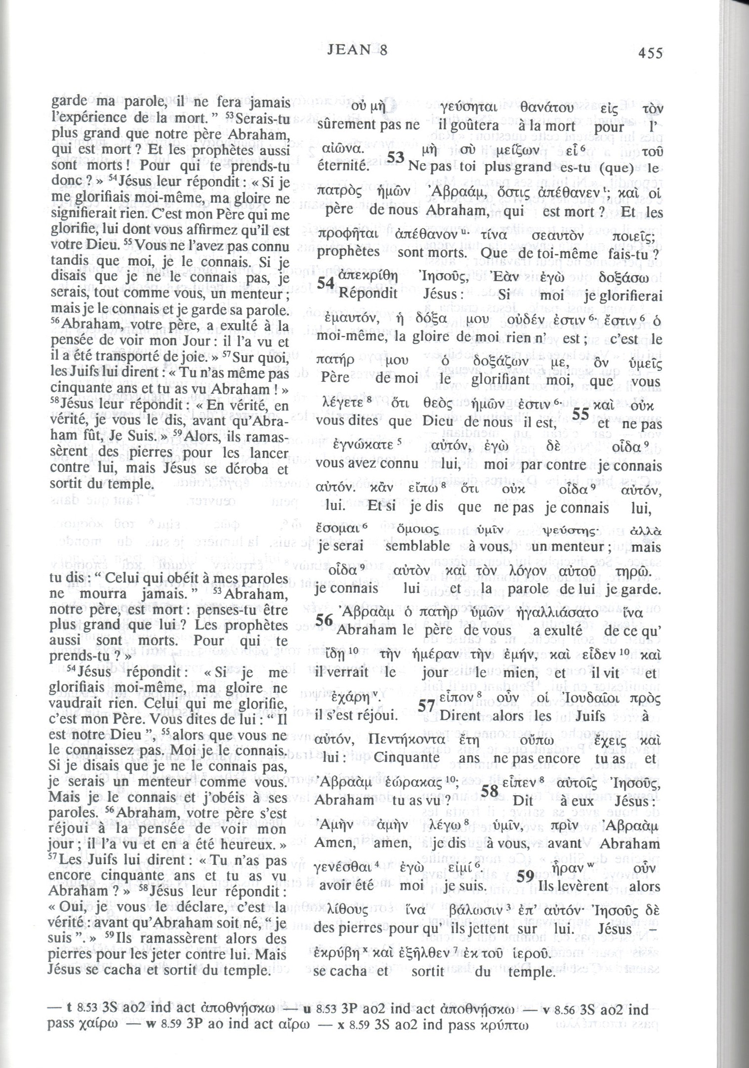 1) Texte Grec (GNT) : εἶπεν αὐτοῖς ἰησοῦς, ἀμὴν ἀμὴν λέγω ὑμῖν, πρὶν ἀβραὰμ γενέσθαι ἐγὼ εἰμί.2) Traduction littérale (sous le Grec) : Dit à eux Jésus: Amen, amen, je dis à vous vous, avant Abraham avoir été moi je suis.
