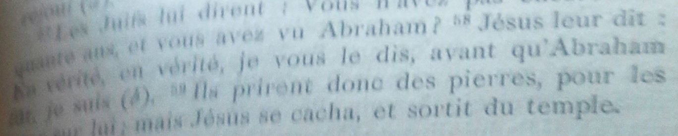 - En vérité, en vérité je vous le dis, avant qu'Abraham parût, moi, je suis. (NT du chanoine Osty)