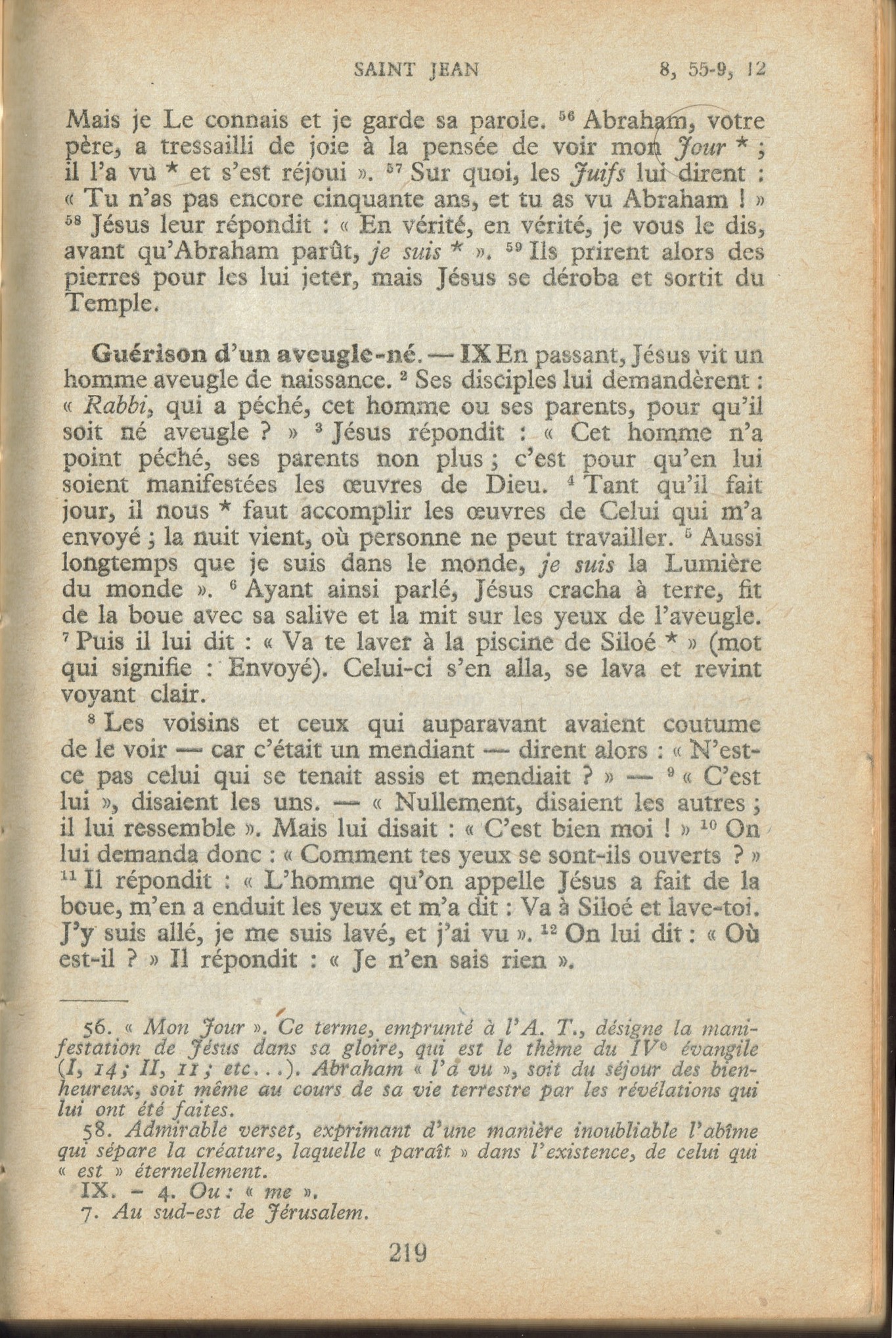 - En vérité, en vérité je vous le dis, avant qu'Abraham parût,je suis. (NT E. Osty, 2 édition revue et corrigée - 1949)