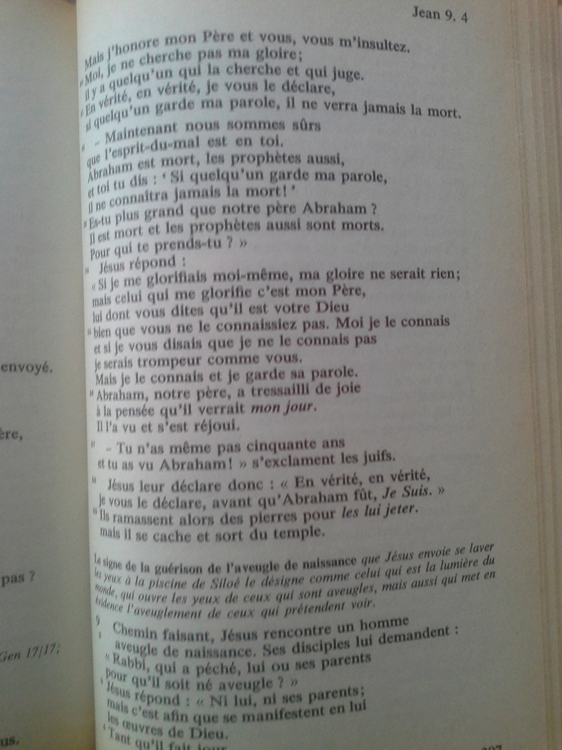 3) TOB (En haut à gauche) : Jésus leur répondit: " En vérité, en vérité, je vous le dis, avant qu'Abraham fût, Je Suis. "