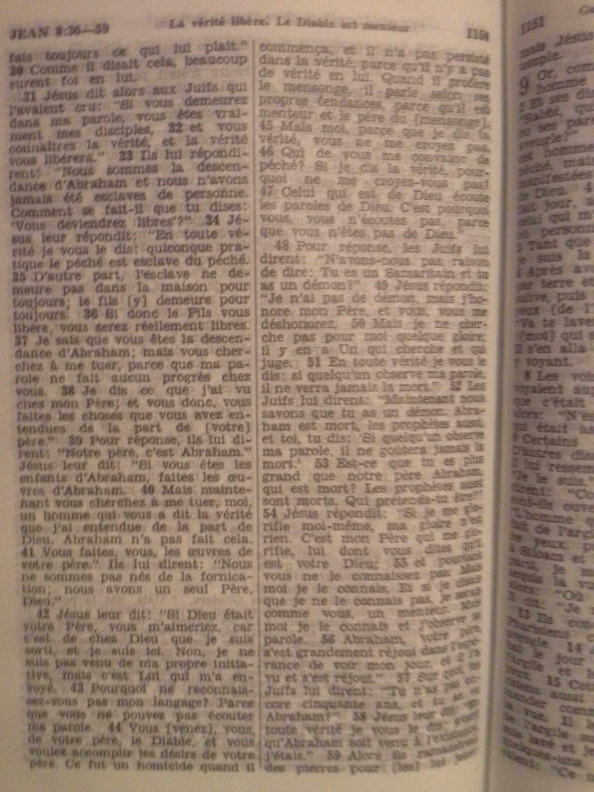 - En vérité, en vérité je vous le dis, avant qu'Abraham fût, je suis. (NT Hugues Oltramare, 1879, + révisions de 1900)