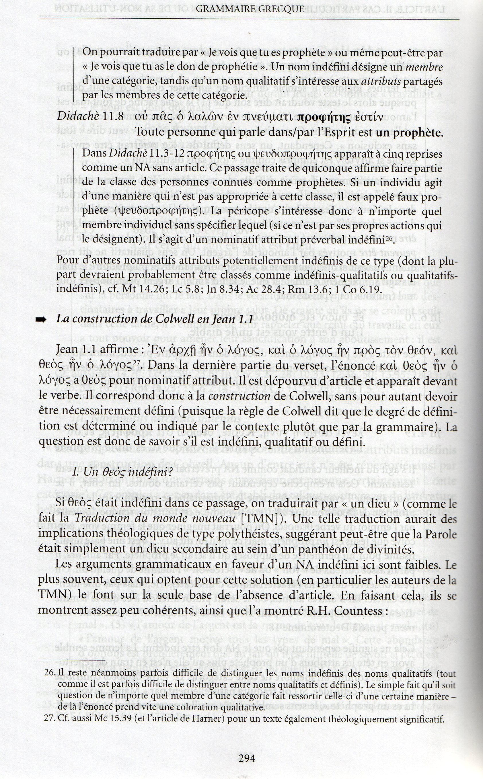 30. Avant 1933 les commentateurs du Nouveau testament considéraient θεὸς comme qualitatif. Par exemple, dans son commentaire sur Jean, Wescott affirme que ce terme devait "nécessairement apparaître sans article (θεὸς et pas ὁ θεὸς) puisqu'il décrit la nature de la Parole sans identifier sa personne. Ce serait du pur sabellianisme de dire que "la Parole était ὁ θεὸς".