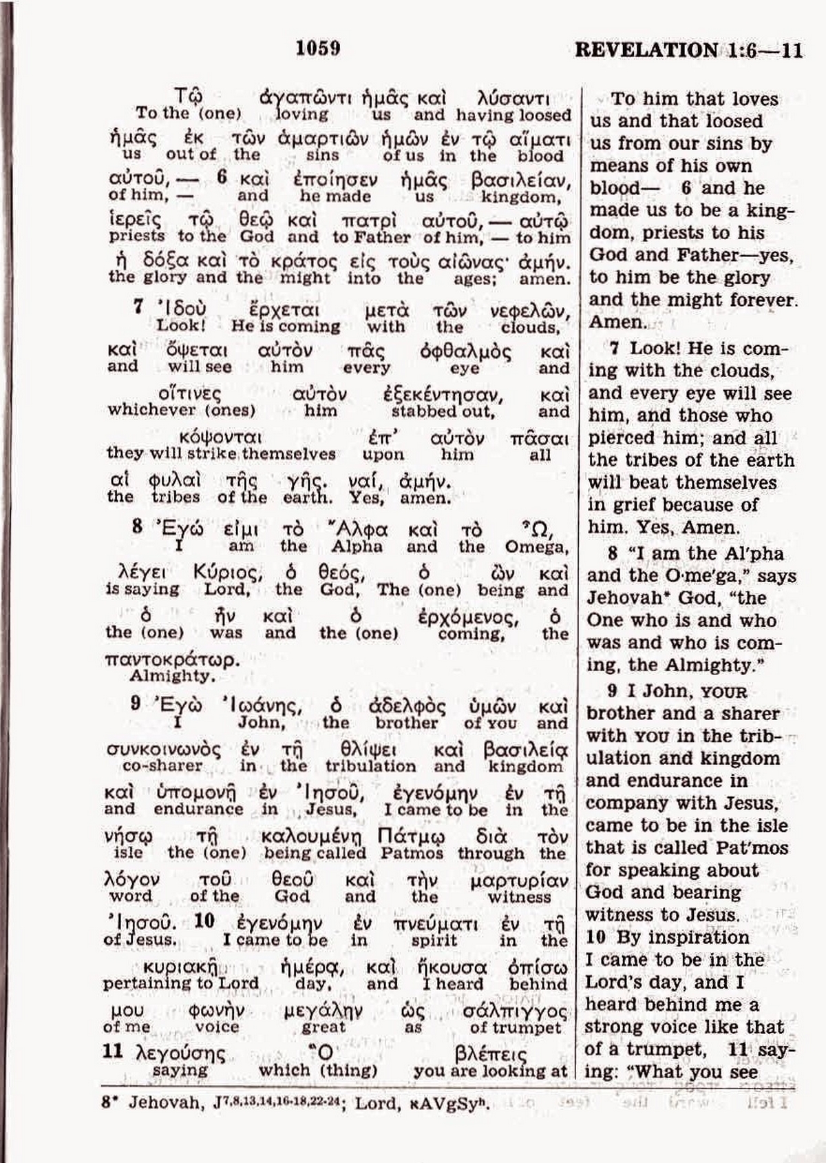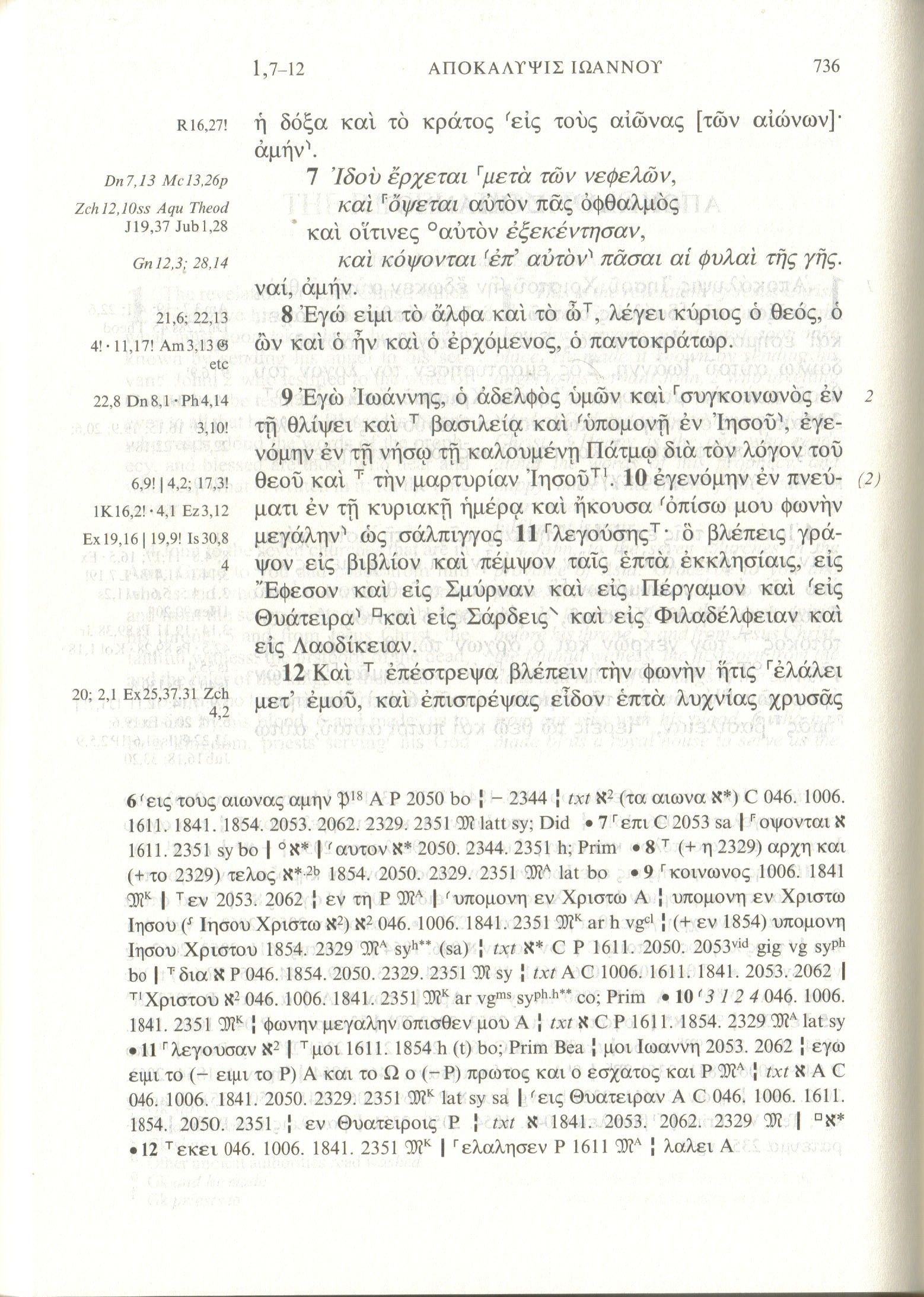 1) GNT (texte grec) : ἐγώ εἰμι τὸ ἄλφα καὶ τὸ ὦ, λέγει κύριος ὁ θεός, ὁ ὢν καὶ ὁ ἦν καὶ ὁ ἐρχόμενος, ὁ παντοκράτωρ.