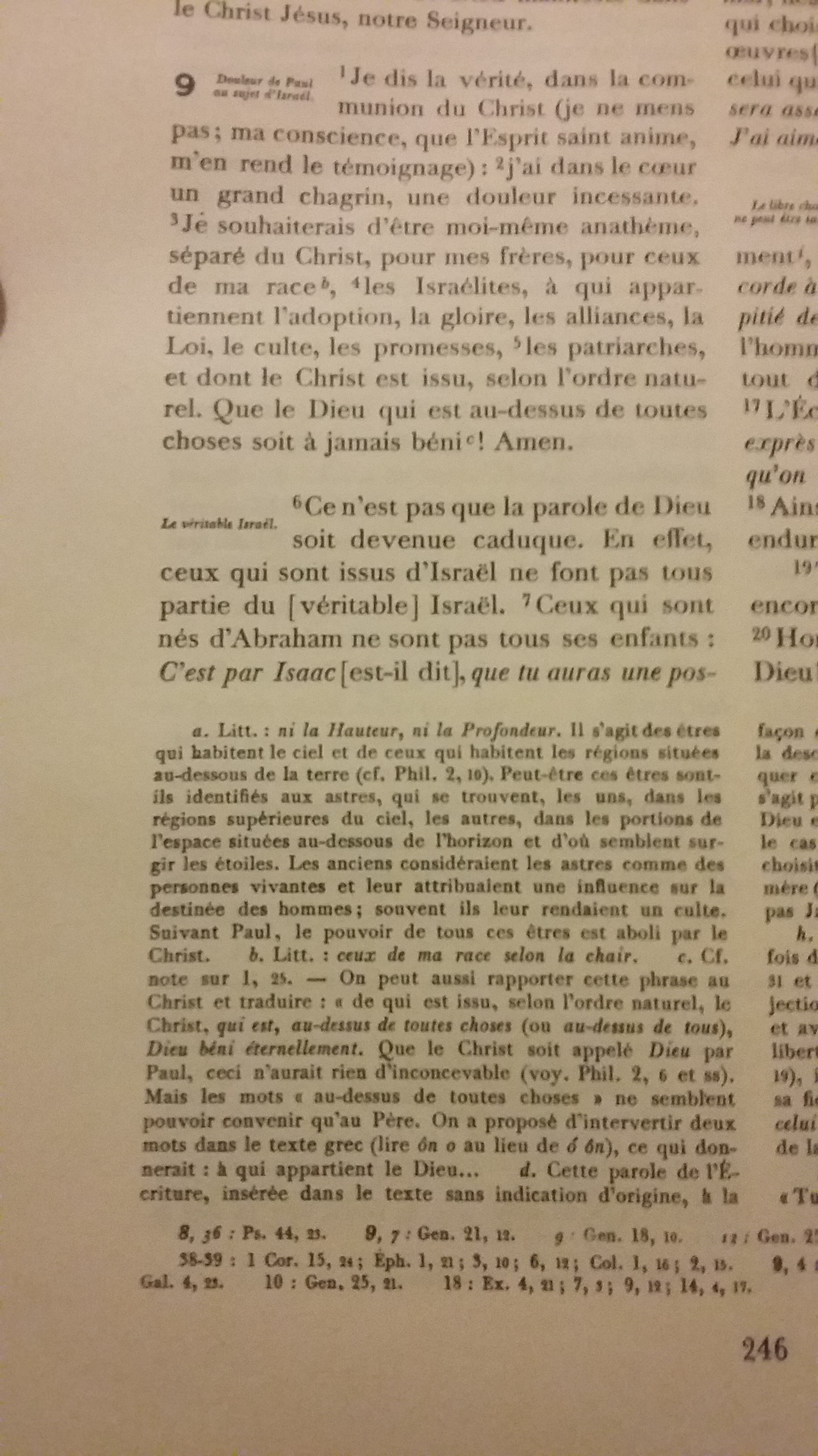 auxquels sont les pères, et desquels, selon la chair, est [issu] le Christ, qui est sur toutes choses Dieu béni éternellement. Amen !