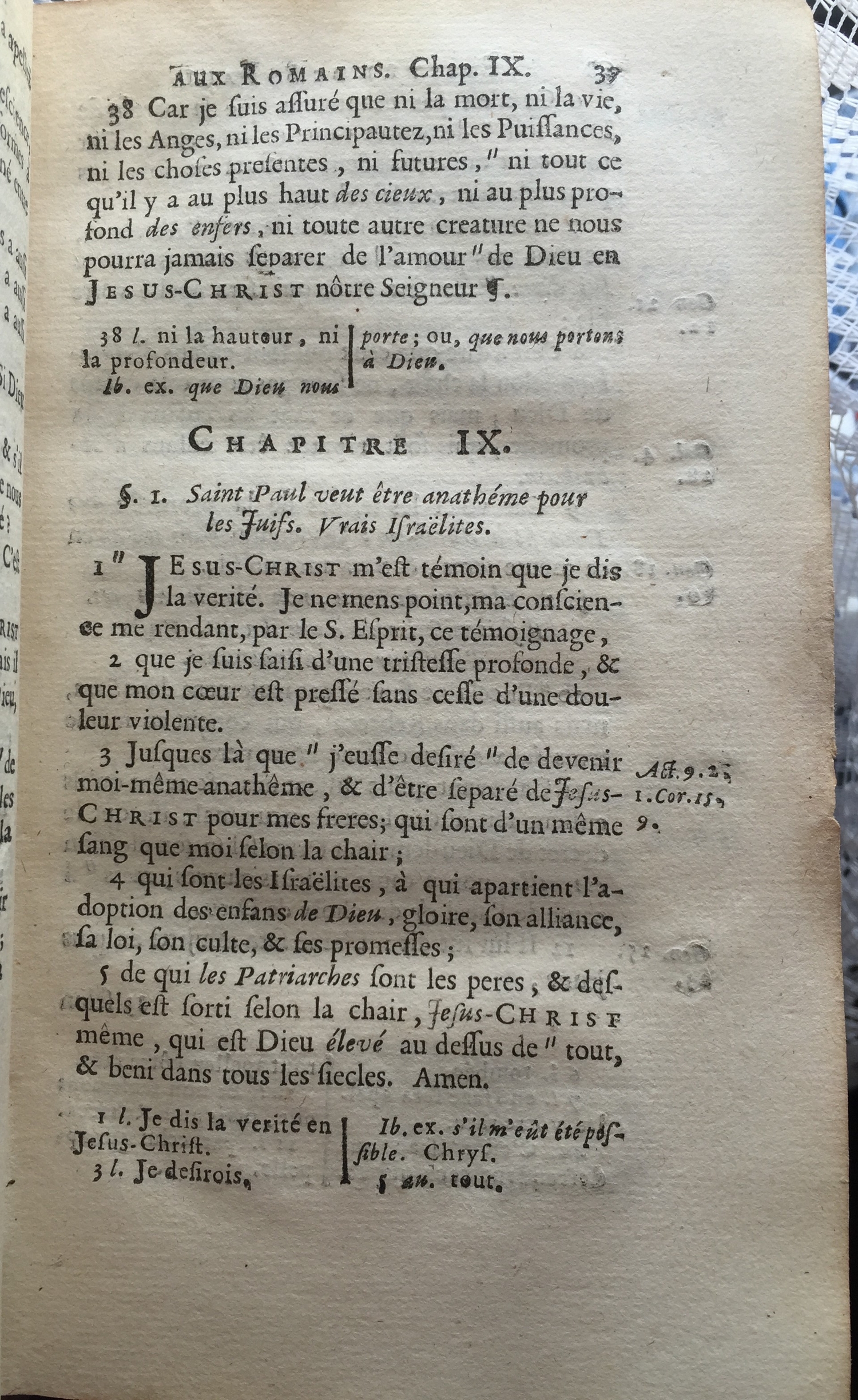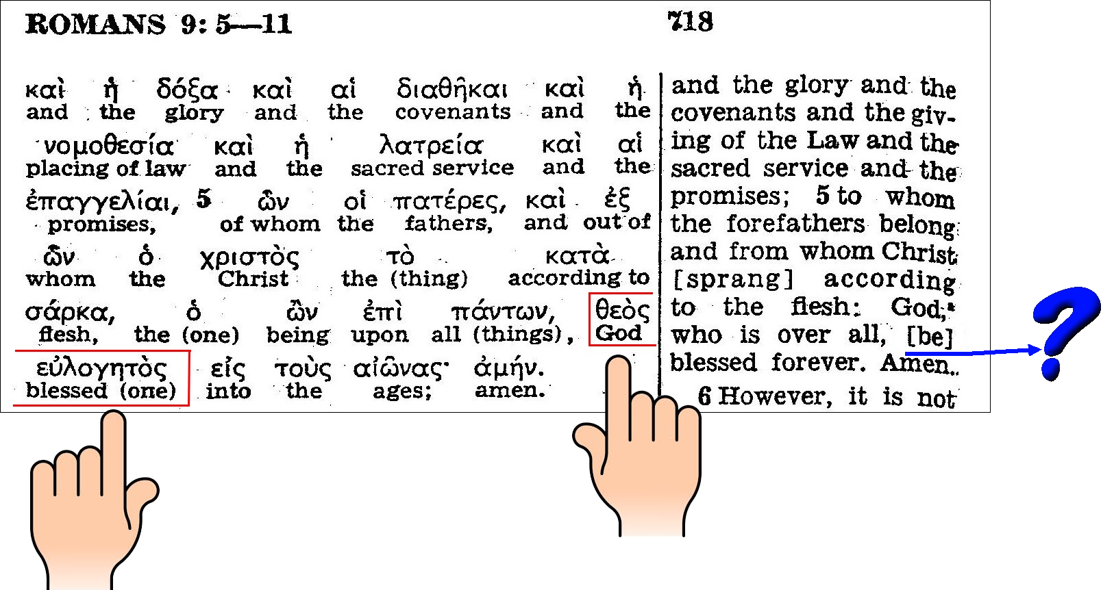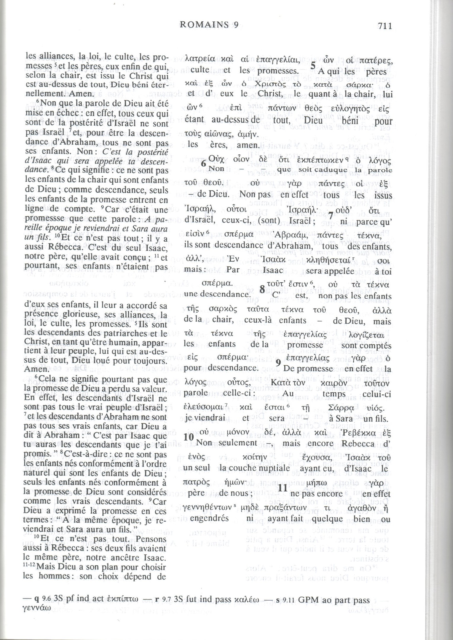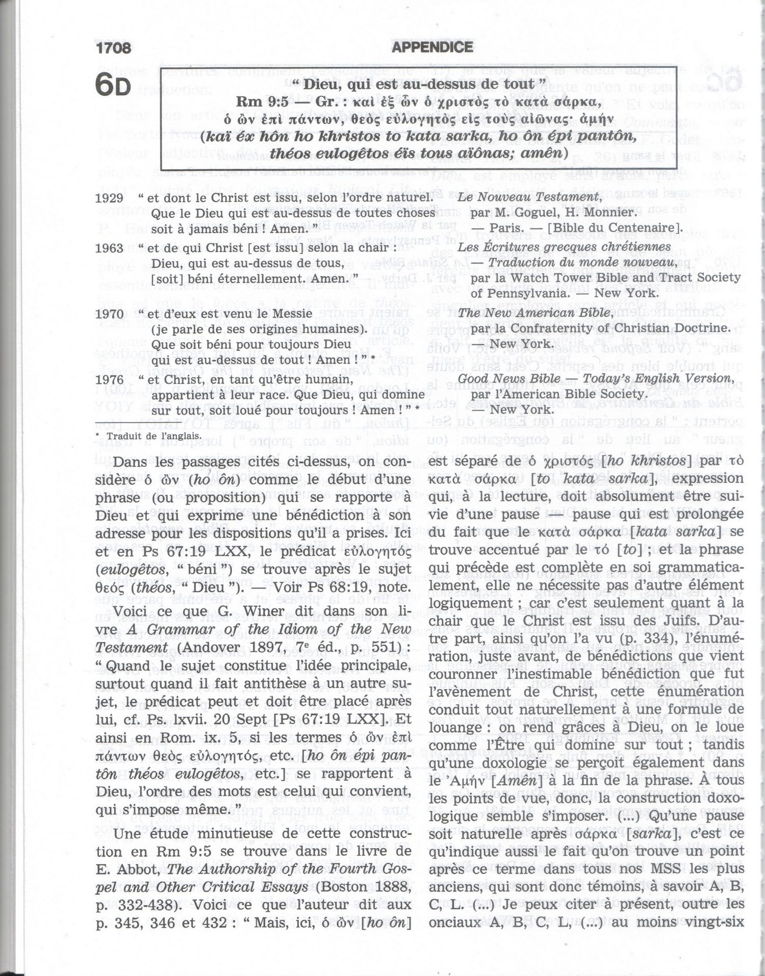1) GNT (Texte Grec) : ὧν οἱ πατέρες, καὶ ἐξ ὧν ὁ χριστὸς τὸ κατὰ σάρκα· ὁ ὢν ἐπὶ πάντων θεὸς εὐλογητὸς εἰς τοὺς αἰῶνας, ἀμήν.