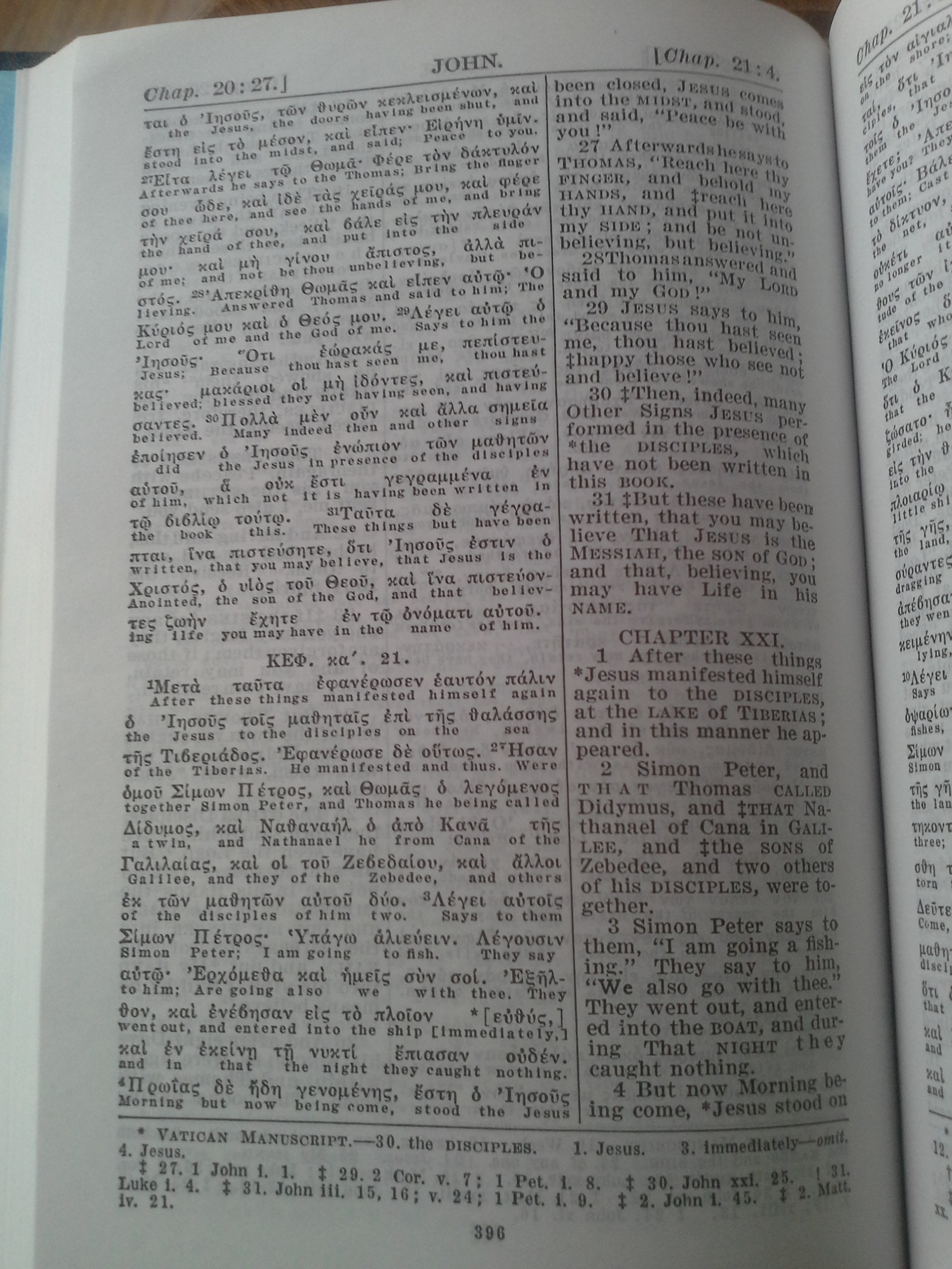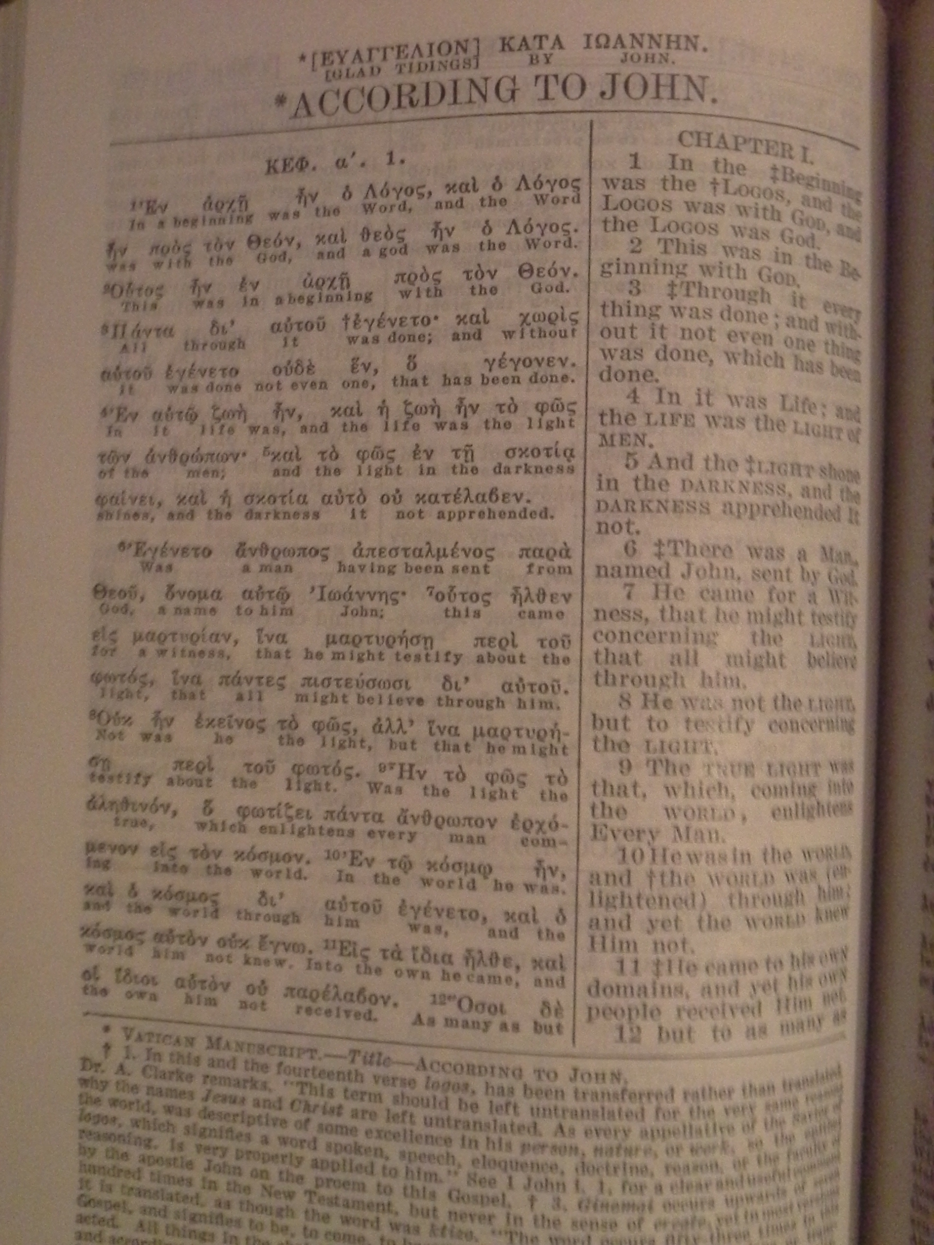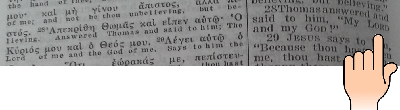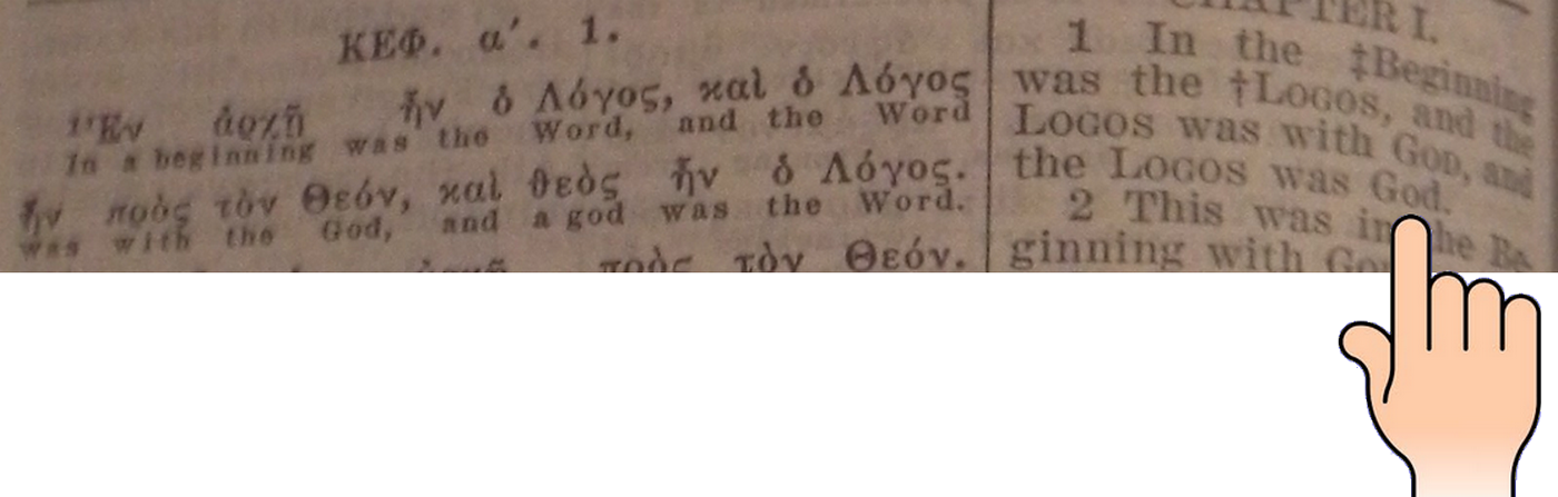 Il y a un détail à soulever dans cette page. S'il est vrai que la traduction appropriée est : "la Parole était Dieu" (was God), on remarquera qu'à gauche sous les mots grecs "καὶ Θεὸς ἦν ὁ Λόγος", il est écrit "and a god (un dieu) was the Word". Cela s'explique par le fait qu'à gauche, il s'agit simplement d'un rendu "mot à mot". En fait, la traduction se trouve à droite. Il faut savoir qu'une traduction tient compte d'un certain nombre de paramètres (contexte, grammaire, etc.)