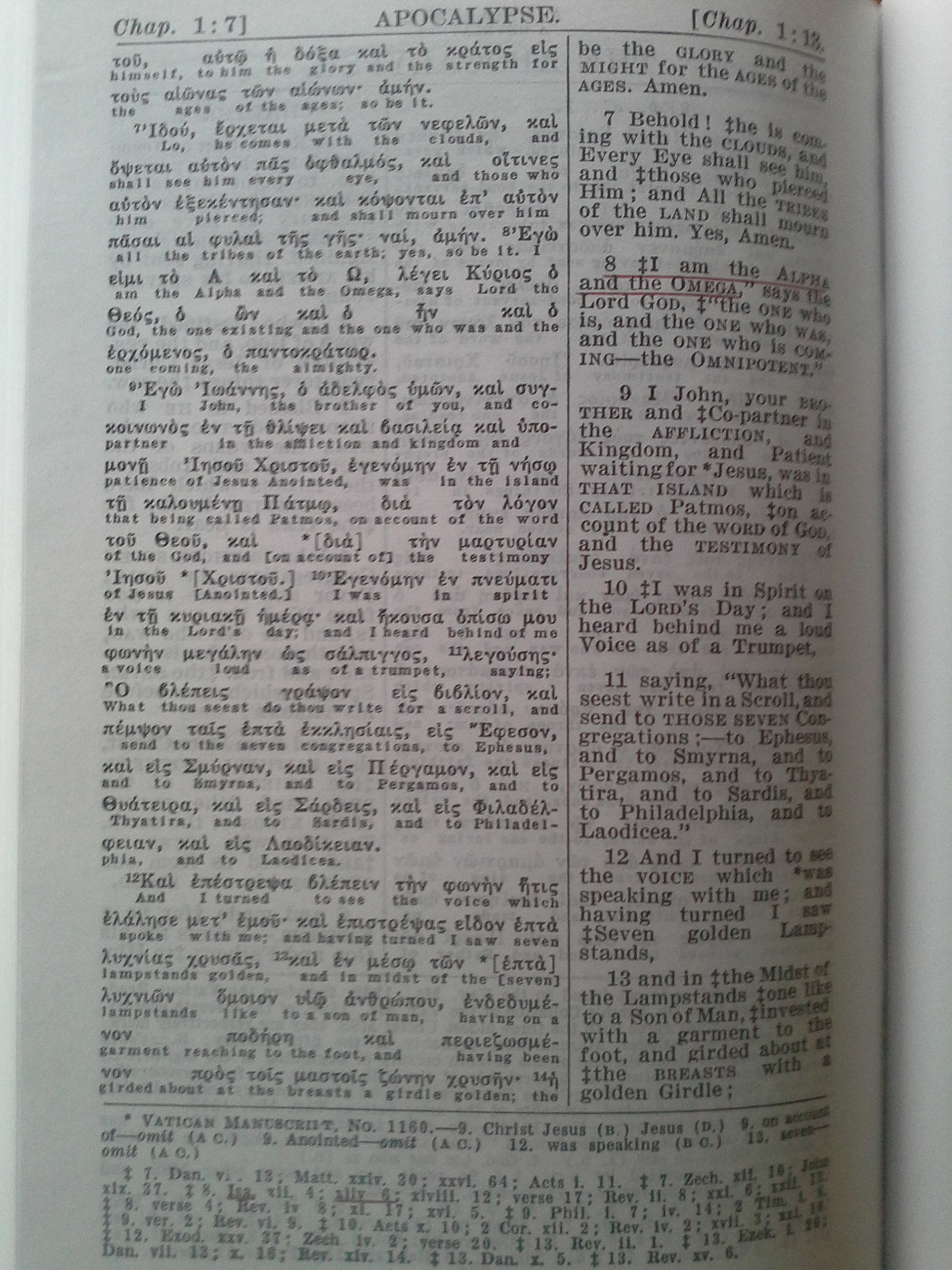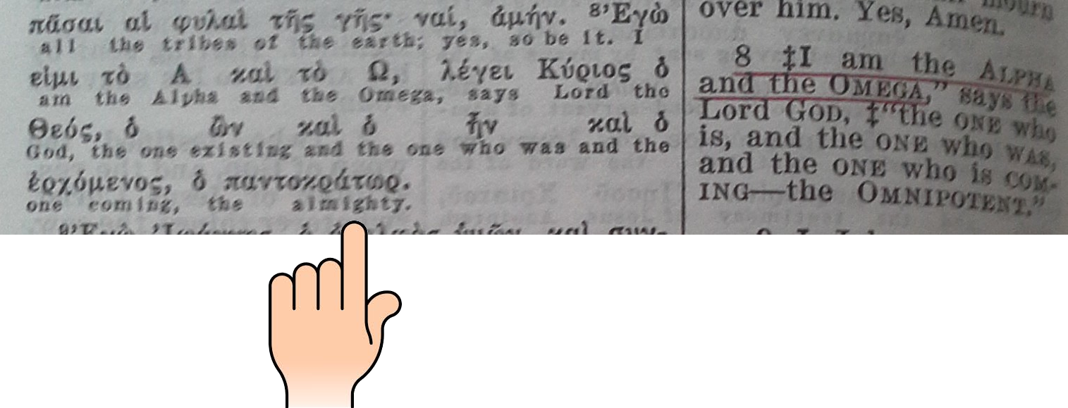 Voici dans la Diaglott, le verset de Révélation 1:8, suivi de l'Alphabetical Appendix, page 872, qui identifie l'Alpha et l'Oméga de Révélation 1:8.