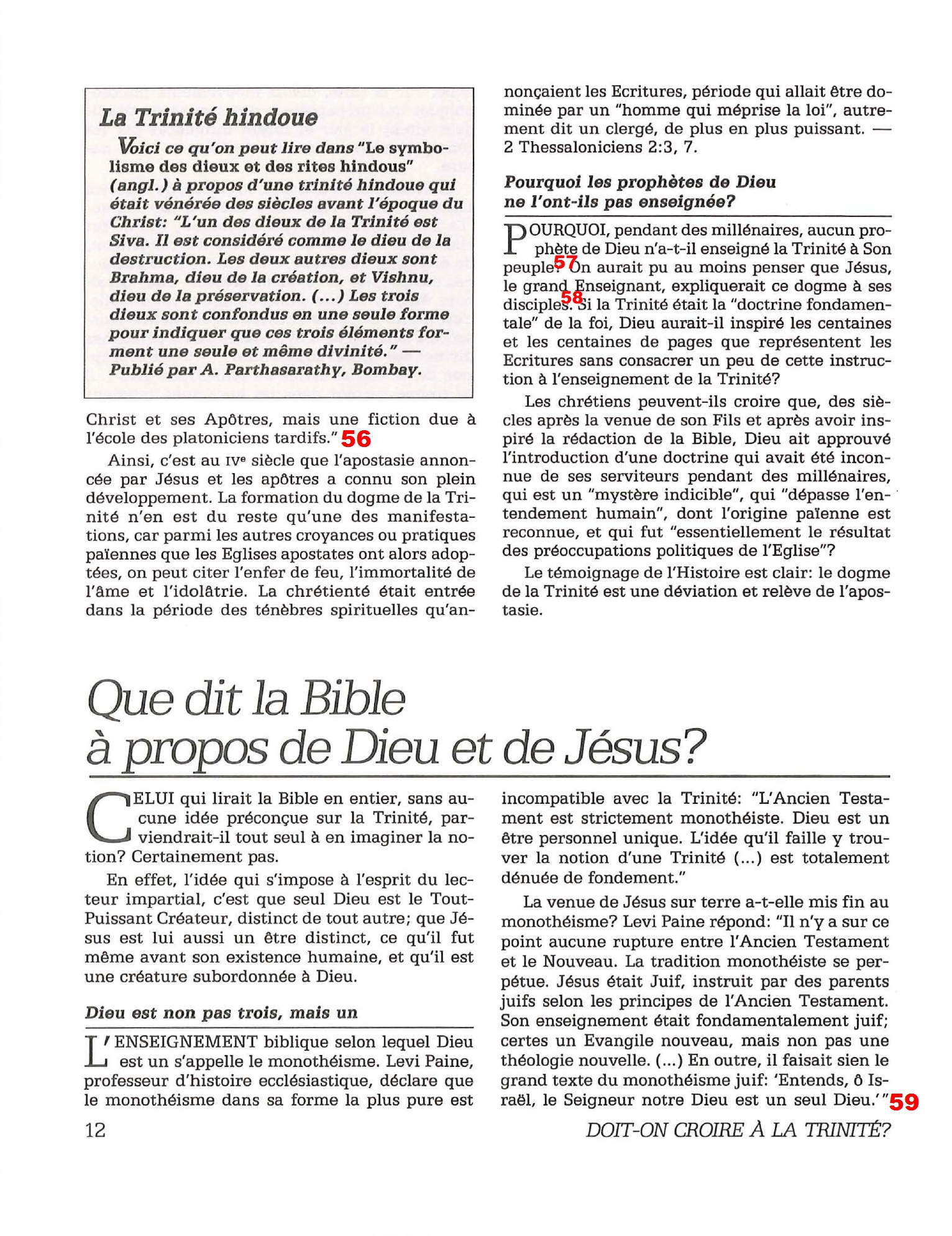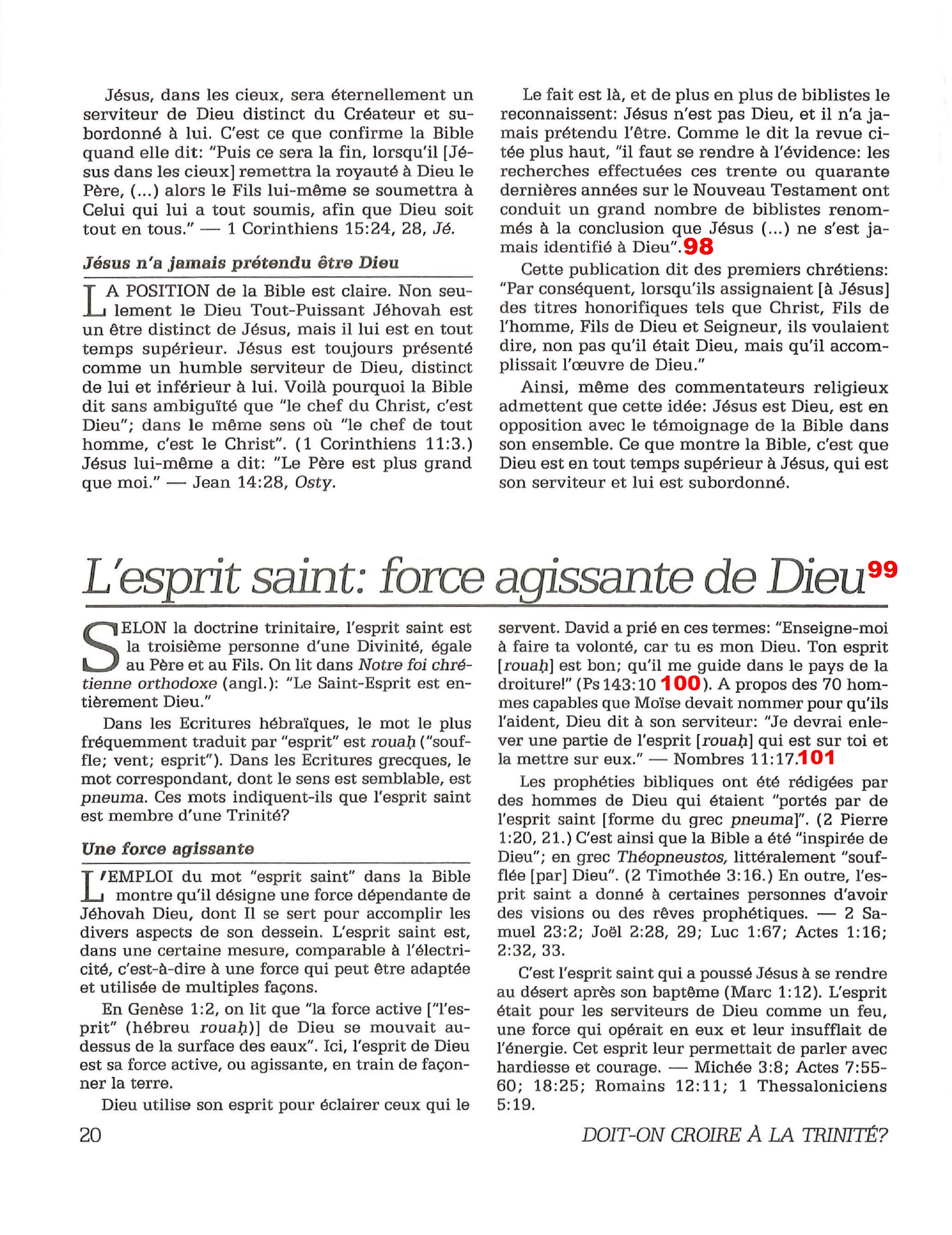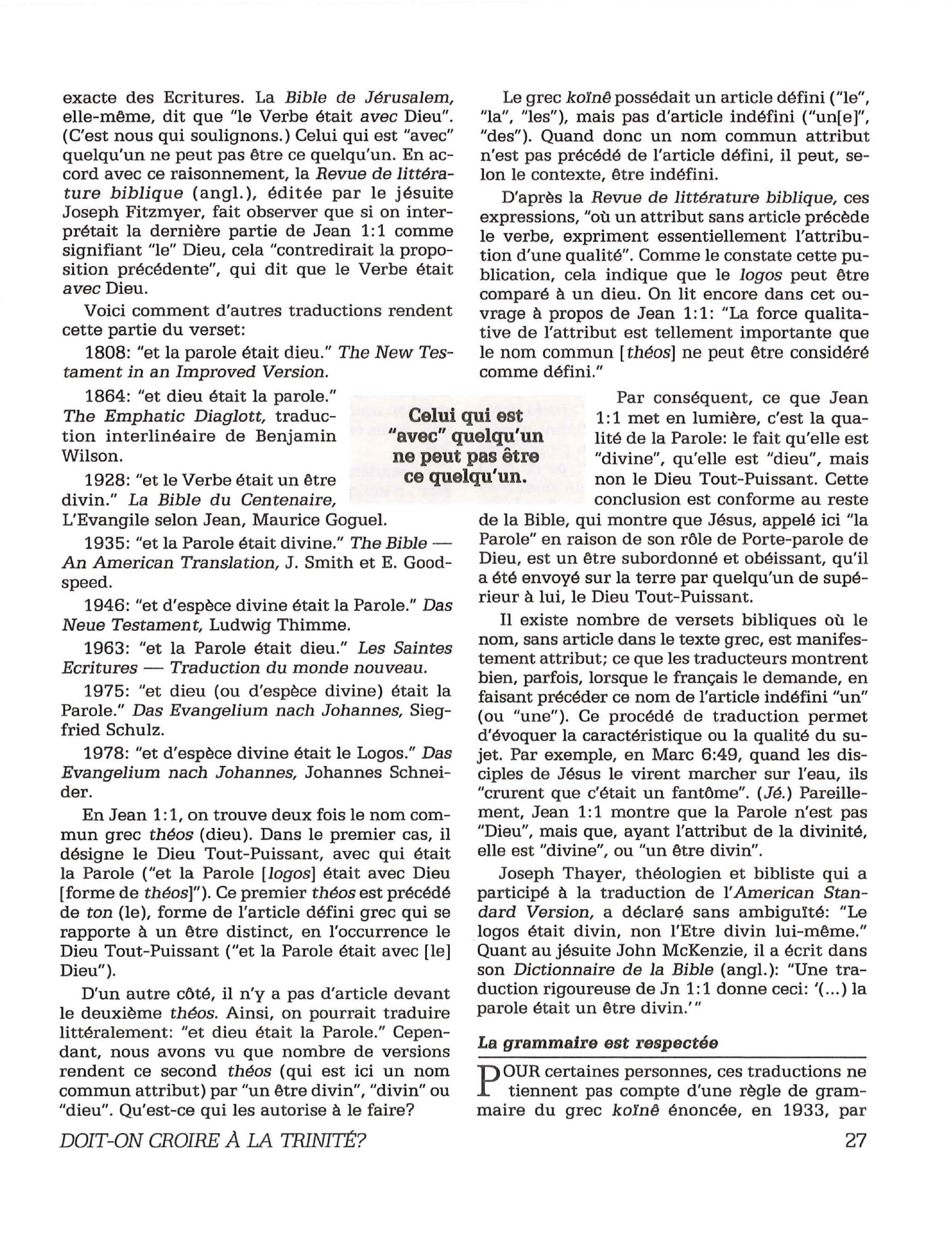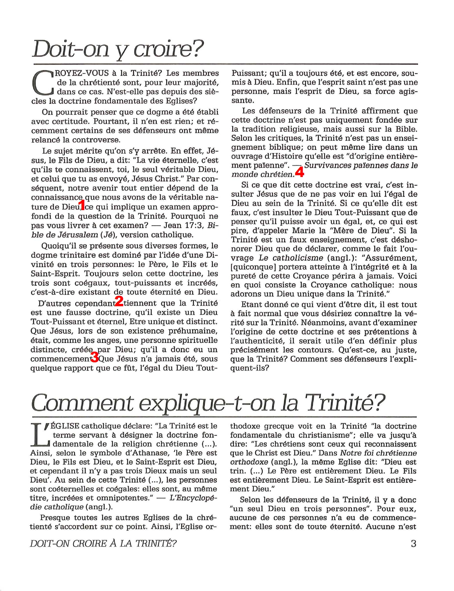 Introduction «Doit-on-croire à la Trinité?» est un pamphlet issu de la Tour de Garde (Watchtower society) publié en 1989 et qui attaque frontalement la Trinité, c’est-à-dire l’idée d’un Dieu unique en trois personnes (Père, Fils et St Esprit) qui est la marque distinctive du Christianisme. Cette brochure a été distribuée à 5 millions d’exemplaires, ce qui est tout simplement gigantesque, et j’ai été amené à la lire moi-même en 2014, lorsqu’un collègue Témoin de Jéhovah me l’a passé pour «m’amener à la vérité». Je remercie le Seigneur d’avoir déjà étudié le sujet auparavant, car les arguments contenus dans ce pamphlet sont les meilleurs que l’Organisation des Témoins de Jéhovah a pu apporter. Aujourd’hui, je me suis senti amené à écrire cette «contre-brochure» sous la forme de notes en bas de page du texte original. J’ai fait ce choix pour trois raisons :