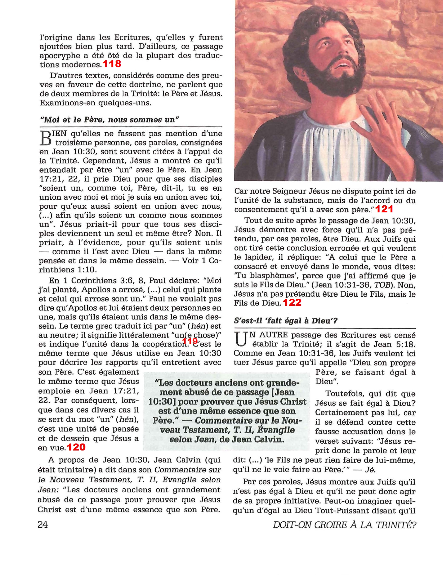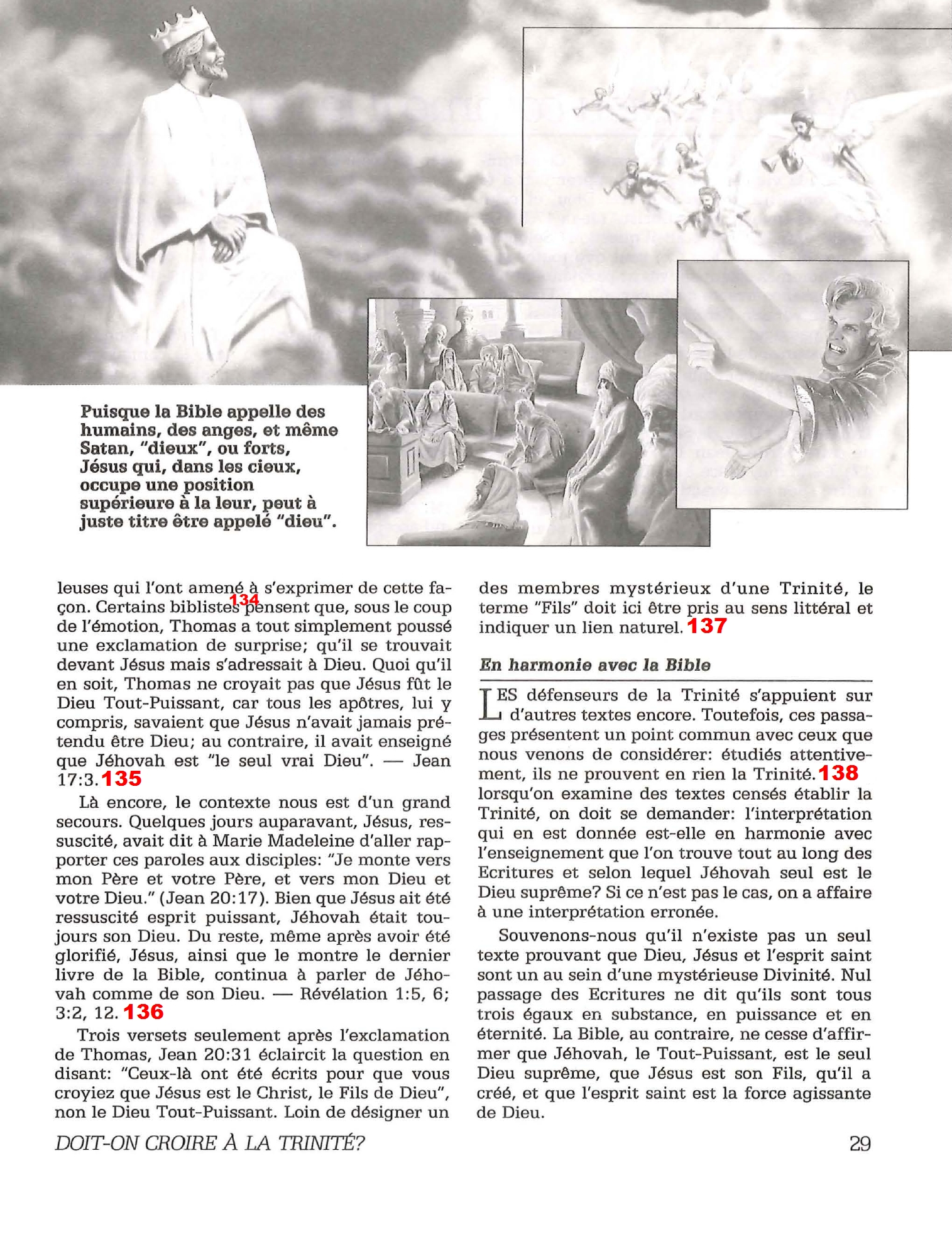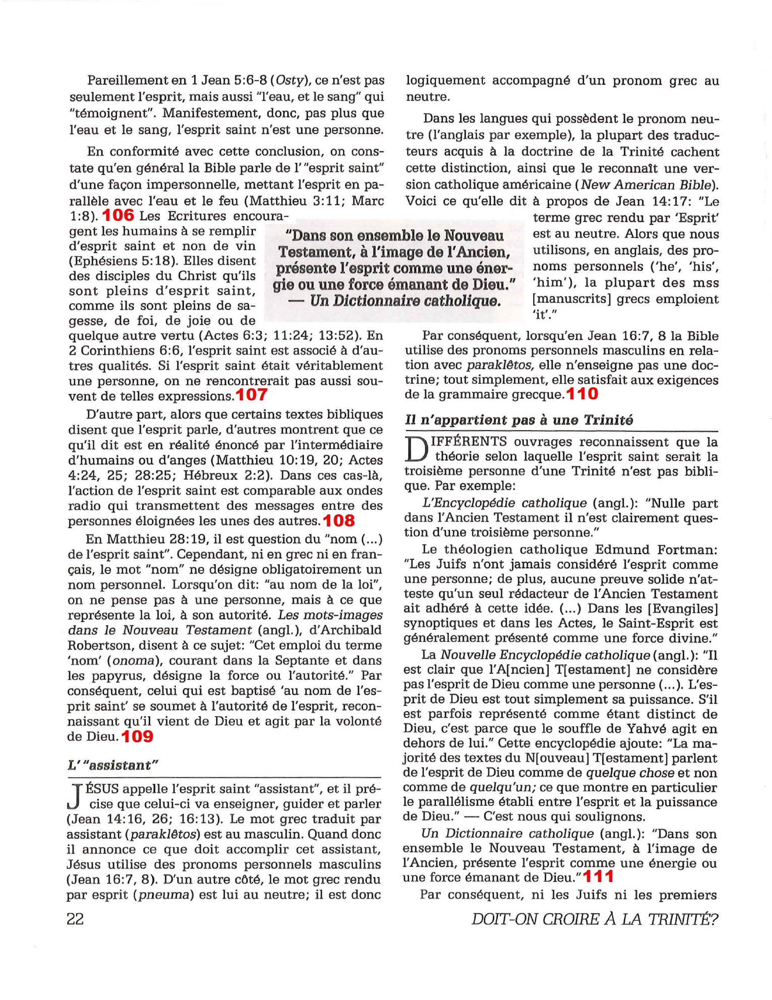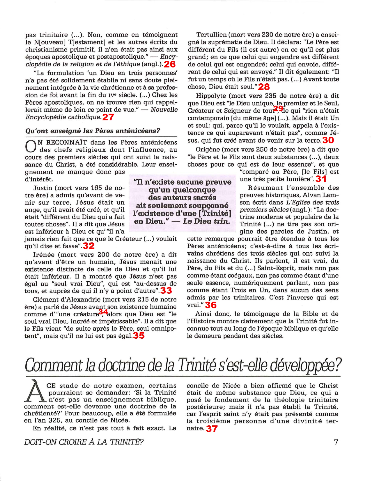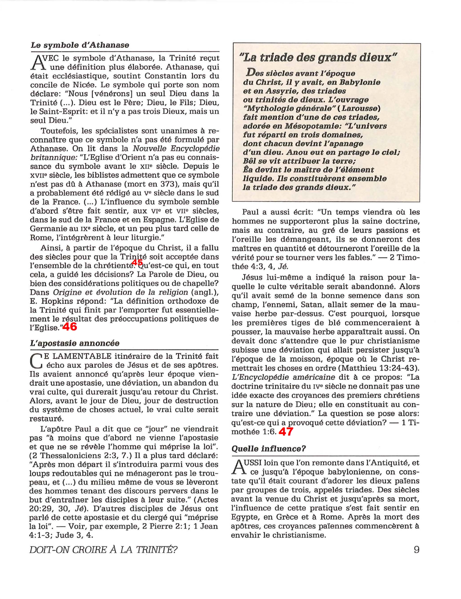 Introduction «Doit-on-croire à la Trinité?» est un pamphlet issu de la Tour de Garde (Watchtower society) publié en 1989 et qui attaque frontalement la Trinité, c’est-à-dire l’idée d’un Dieu unique en trois personnes (Père, Fils et St Esprit) qui est la marque distinctive du Christianisme. Cette brochure a été distribuée à 5 millions d’exemplaires, ce qui est tout simplement gigantesque, et j’ai été amené à la lire moi-même en 2014, lorsqu’un collègue Témoin de Jéhovah me l’a passé pour «m’amener à la vérité». Je remercie le Seigneur d’avoir déjà étudié le sujet auparavant, car les arguments contenus dans ce pamphlet sont les meilleurs que l’Organisation des Témoins de Jéhovah a pu apporter. Aujourd’hui, je me suis senti amené à écrire cette «contre-brochure» sous la forme de notes en bas de page du texte original. J’ai fait ce choix pour trois raisons :