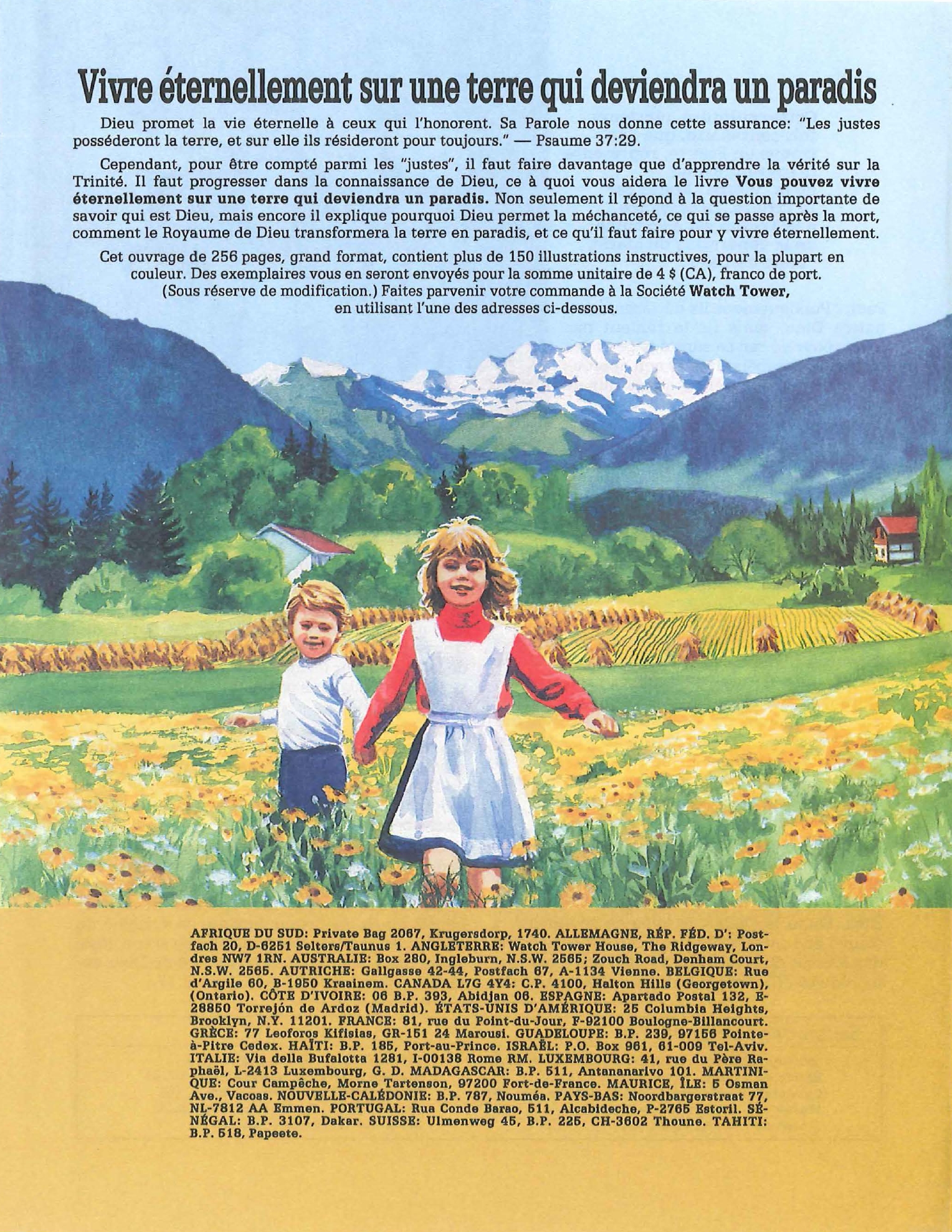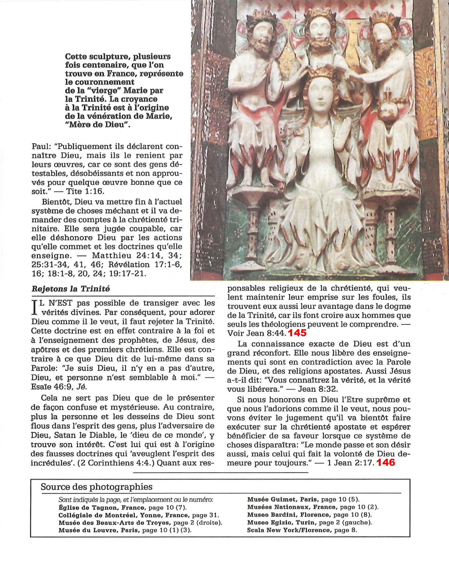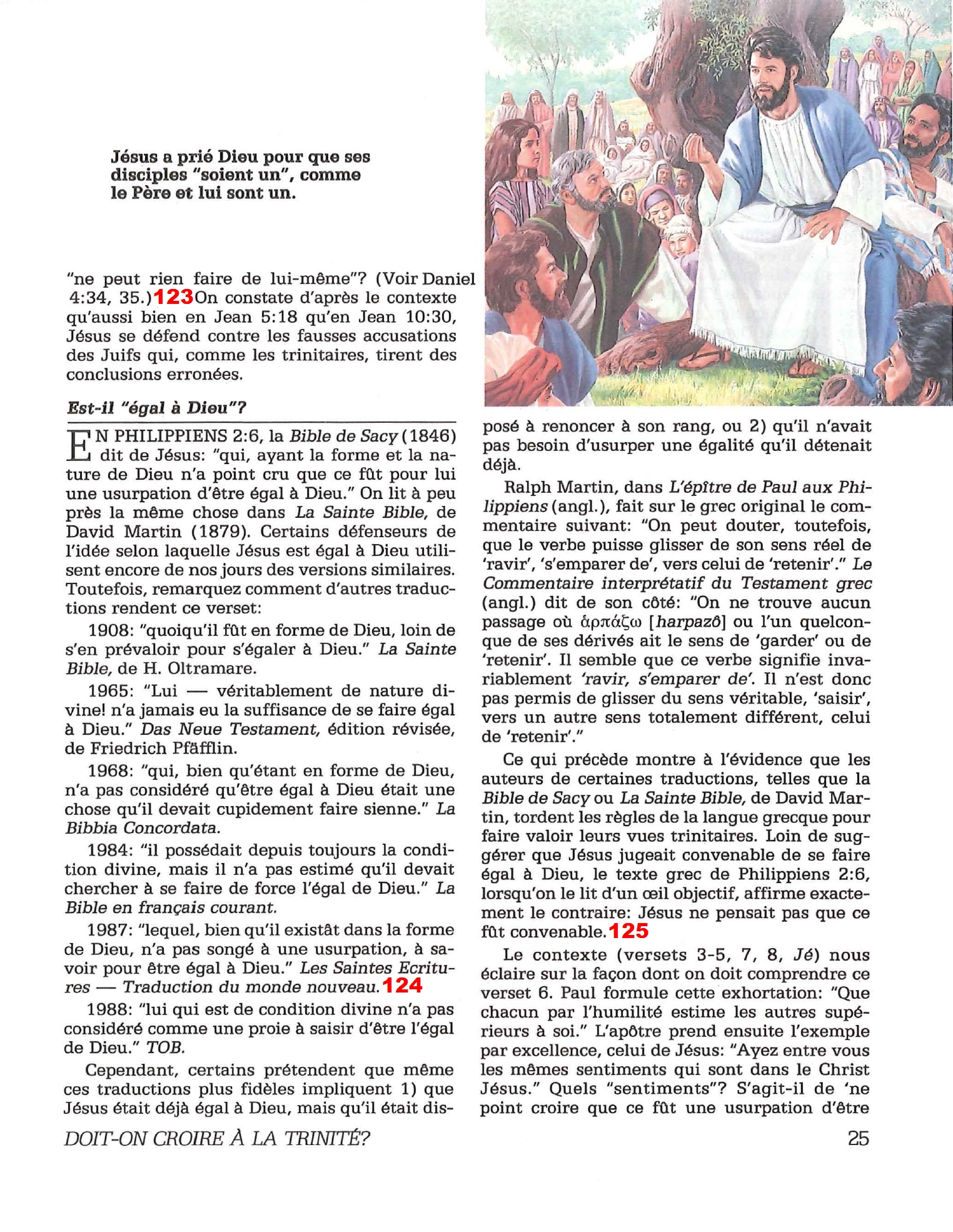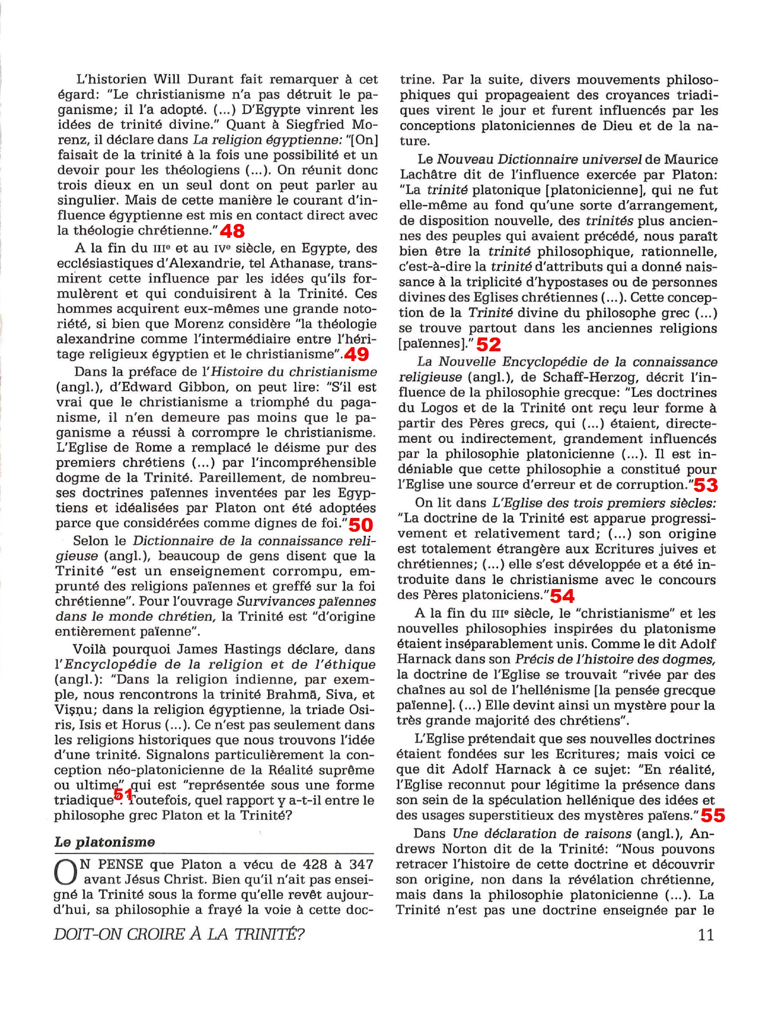 Introduction «Doit-on-croire à la Trinité?» est un pamphlet issu de la Tour de Garde (Watchtower society) publié en 1989 et qui attaque frontalement la Trinité, c’est-à-dire l’idée d’un Dieu unique en trois personnes (Père, Fils et St Esprit) qui est la marque distinctive du Christianisme. Cette brochure a été distribuée à 5 millions d’exemplaires, ce qui est tout simplement gigantesque, et j’ai été amené à la lire moi-même en 2014, lorsqu’un collègue Témoin de Jéhovah me l’a passé pour «m’amener à la vérité». Je remercie le Seigneur d’avoir déjà étudié le sujet auparavant, car les arguments contenus dans ce pamphlet sont les meilleurs que l’Organisation des Témoins de Jéhovah a pu apporter. Aujourd’hui, je me suis senti amené à écrire cette «contre-brochure» sous la forme de notes en bas de page du texte original. J’ai fait ce choix pour trois raisons :
