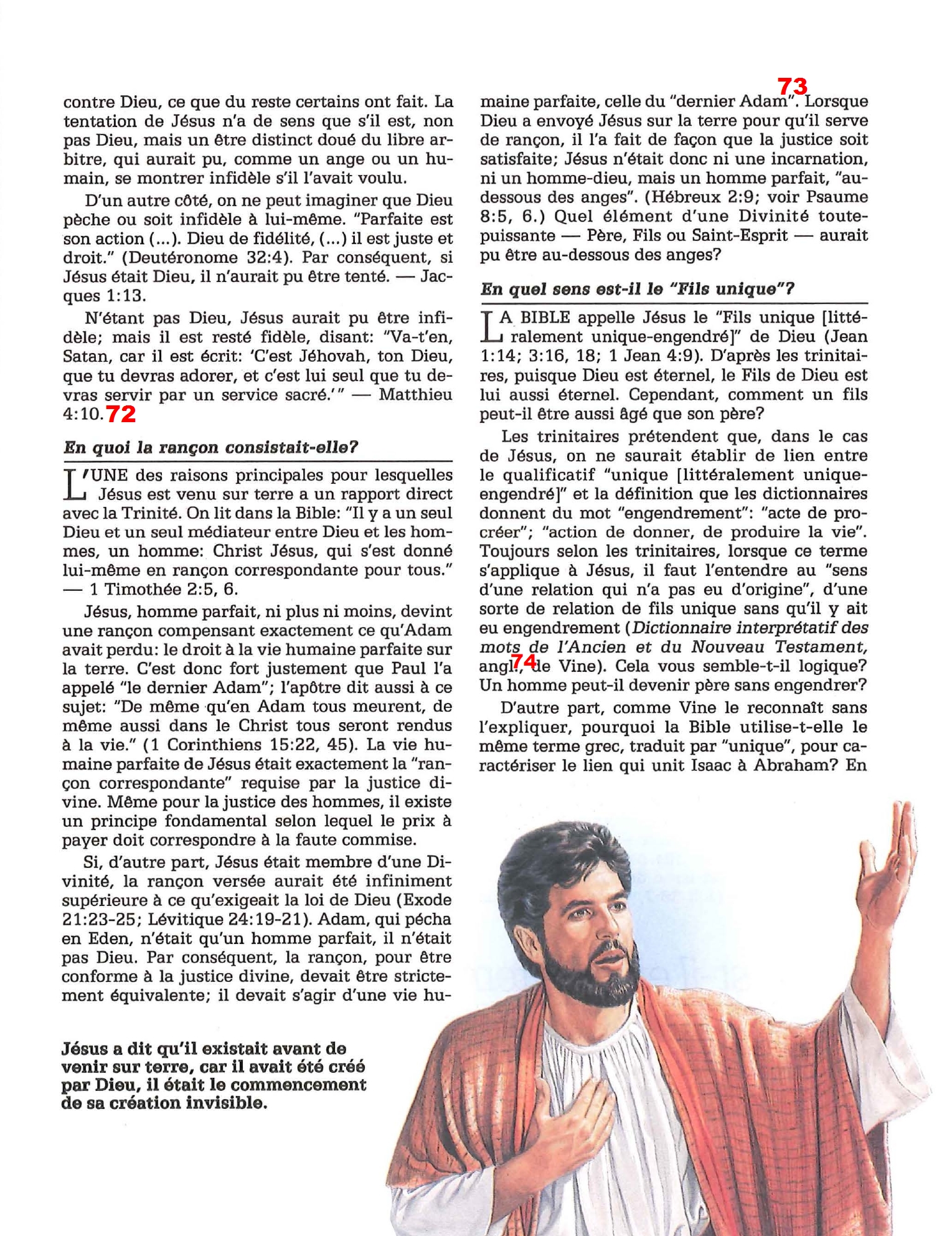 76. Dommage que les TdJ ne mettent pas la définition entière. Ils sauraient ainsi que dans le grec du 1er siècle, monogénes ne désigne pas tant le fils unique, que le fils le plus important, le «premier». Il arrivait même parfois que le troisième garçon de la famille soit appelé «monogénés» parce que c’était lui qui reprenait l’héritage familial 77. A ceci près que Jésus a revendiqué son éternité (Jean 8.58, Jean 1.1), son omniprésence (Mt 18.20), son omnipotence (Es 9.5) et son omniscience 78. Ce qui n’est pas incompatible avec l’enseignement trinitaire: la distinction des personnes ne remet pas en cause l’unité de substance. 79. Ah donc Jésus n’est pas non plus un homme ? Et comment a-t-il pu payer la facture de nos péchés s’il n’était ni Dieu pour pardonner, ni homme pour porter la faute ? 80. Je pourrais faire cette note à chaque paragraphe, alors je vais le faire ici: