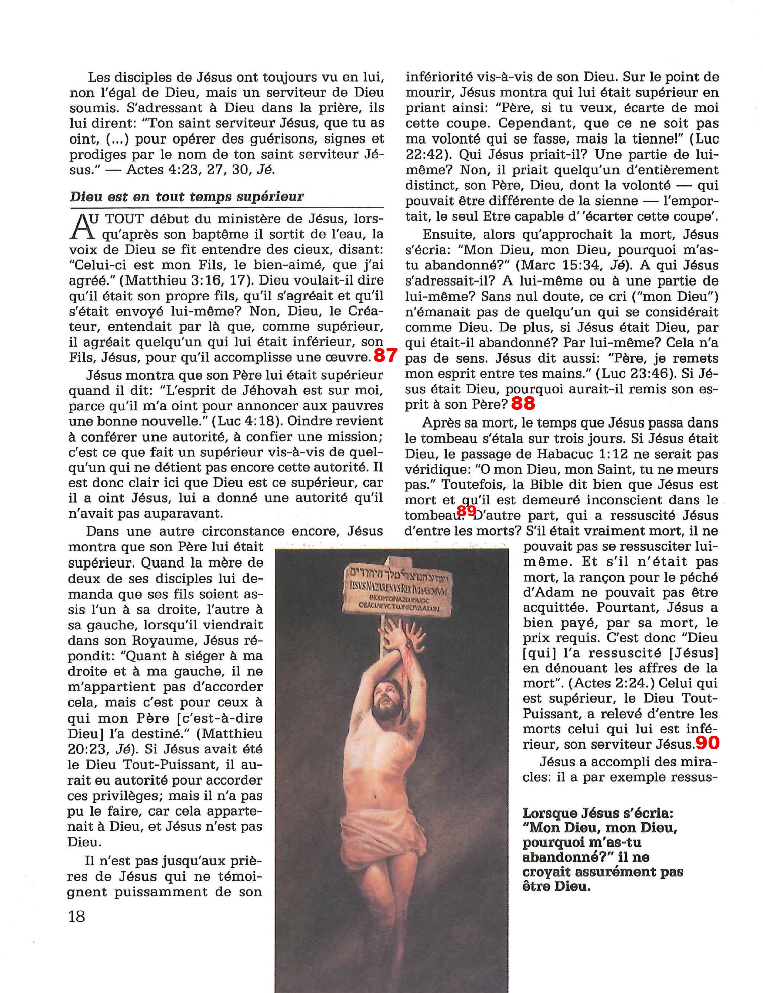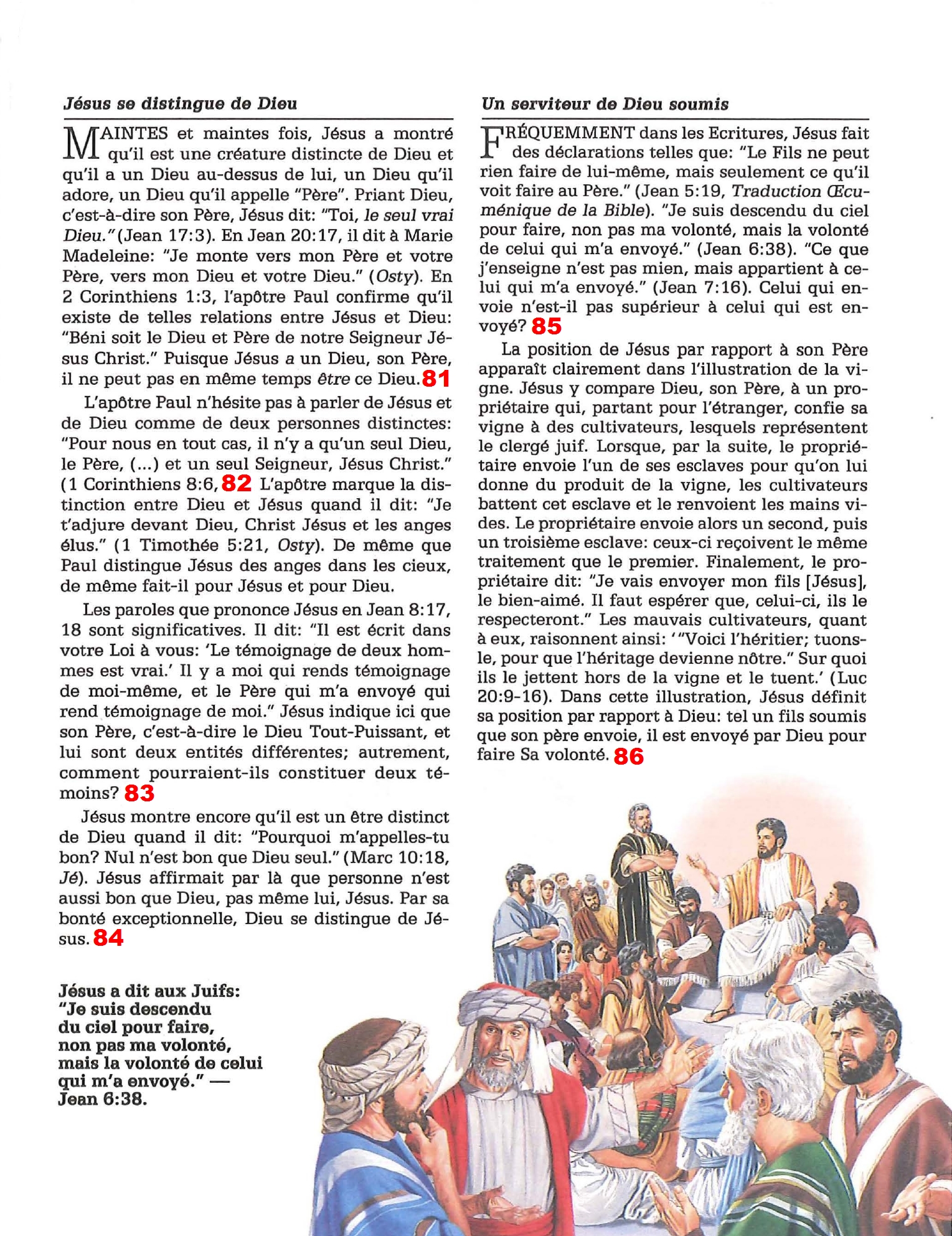 85. Cf distinction Trinité ontologique/ économique faite dans la note 80, pt 2 86. Le commentaire est impeccable, mais il ne remet absolument rien en cause. Cf n80, pt 2 ![]() 87. Se résout simplement si l’on comprend que le mot Dieu ici ne désigne pas tant la Divinité dans sa globalité que le Père en particulier. On pourrait presque rajouter «la voix de Dieu (=le Père) se fit entendre». cf n80 pt3 88. Les TdJ exagèrent la difficulté en confondant allégrement substance et personne: Jésus ne s’adresse pas à une partie de lui-même, ou son «autre tiers de Dieu». C’est une personne de la Divinité qui s’adresse à une autre personne de la Divinité, et qui exprime une peine trop grande pour que nous puissions seulement la comprendre. 89. En tant qu’humain, Jésus est mort, mais il est aussi Dieu. De plus la difficulté n’est pas si grande si l’on considère que l’âme humaine subsiste, même après la mort (en état conscient ou inconscient, peu importe). En plus simple : La mort n’est que séparation de l’âme et du corps, pas anéantissement complet. Les TdJ évidemment nient toute subsistance de l’âme humaine, alors ce point ci est un blocage pour eux. 90. Cf n80 pt 1 sur la distinction des personnes. ![]() 91. Sauf que ni Elie ni Elisée n’ont proclamé être Dieu. Les miracles que Dieu réalisait par Jésus servaient de preuves à la vérité de son message, et parmi son message, se trouvait aussi des affirmations de sa Divinité. 92. Deux interprétations sont proposées quant à cette difficulté :