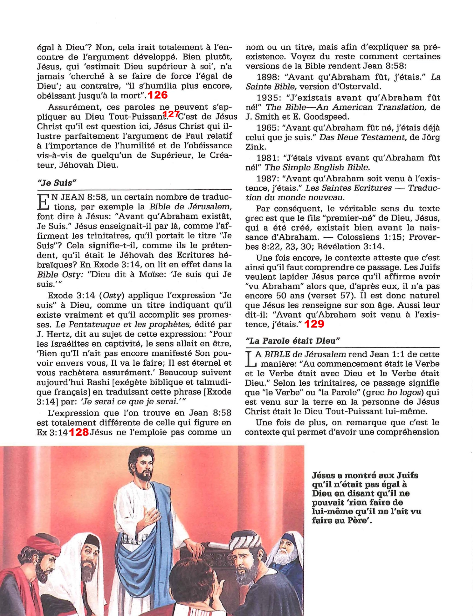 120. «hén» a un sens très, très large. Allez, au hasard, je prends la première fois où il apparaît dans le NT : Mt 5.18 «Car, je vous le dis en vérité, tant que le ciel et la terre ne passeront point, il ne disparaîtra pas de la loi un [hèn] seul iota ou un seul trait de lettre, jusqu'à ce que tout soit arrivé.» Que dois-je déduire ? Qu’il y a une unité de pensée et de dessein entre la loi et le iota ? Le raisonnement est faux. 121. L’unité de substance (homoousios) est établie à partir des données bibliques, mais vous ne trouverez pas de verset qui énonce le crédo de Nicée. Seulement, à partir du moment où le Père est Dieu et que Jésus est Dieu, et qu’il n’y a qu’un seul Dieu, combien faut-t-il d’étapes avant d’y arriver ? Notre tâche est donc d’établir et de défendre la Divinité de Jésus. 122. Pourquoi ne citent-t-ils pas le passage entier ? Parce qu’il serait alors clair que Jésus ne réfute pas sa Divinité, mais il réfute l’idée qu’être vraiment homme et vraiment Dieu soit blasphématoire. Autrement dit : Jésus défend sa double nature parfaitement humaine et parfaitement divine, en faisant remarquer que la Bible ne met pas de catégorie étanche entre les deux dans le Ps 82.6. Le contexte de Jean 10.30 défend au contraire la divinité de Jésus. ![]() 123. Au contraire, dans Jn 5.19-30, Jésus revendique énormément de prérogatives divines. Dans l’ordre : il revendique le pouvoir de donner la vie à l’égal de Dieu (v21), être le Juge suprême à la place du Père (v22), être digne de louange strictement à égalité avec Jéhovah/le Père (v23), de sa propre autorité il affirme son statut d’unique sauveur (v24 cf prologue pr des refs à l’AT), de sa propre autorité il affirme son pouvoir de ressusciter (v25), il déclare aussi être incréé et nécessaire comme le Père (v26) et réaffirme qu’il a reçu le droit de Juge suprême du Père, alors que seul Dieu peut juger (v27). Vraiment je trouve étonnant qu’ils n’aient pas cité textuellement le passage. 124. Coucou ! La traduction officielle des TdJ et utilisée uniquement par eux au milieu d’autres versions couramment acceptées ! Ça sent la manœuvre rhétorique. Ils la referont systématiquement. 125. Ce qui est étrange, c’est qu’aucune des deux traductions «saisir» ou «retenir» ne remet vraiment en cause l’idée que Jésus était de «condition divine», sachant qu’il n’y a qu’un seul Dieu... ![]() 126. Le contexte est tordu (c’est probablement la raison pour laquelle le passage n’est pas cité) : «Ayez en vous les sentiments qui étaient en Jésus-Christ, lequel, existant en forme de Dieu, n'a point regardé comme une proie à arracher d'être égal avec Dieu, mais s'est dépouillé lui-même, en prenant une forme de serviteur, en devenant semblable aux hommes; et ayant paru comme un simple homme, il s'est humilié lui-même, se rendant obéissant jusqu'à la mort, même jusqu'à la mort de la croix» Quelque soit la traduction que vous prenez de «proie à arracher», les sentiments auxquels nous sommes appelés, et que même si nous avons «des droits» ou des privilèges, nous devons les abandonner au profit des autres. Cet enseignement est compatible aussi bien avec la divinité de Jésus que son absence, quoiqu’il soit plus fort dans le premier cas. 127. Ah si c’est compatible, et j’ai même envie de dire : c’est dans cette humiliation que le Dieu Jésus-Christ se montre supérieur à tous les autres dieux. 128. Pourquoi donc les TdJ n’ont-t-ils trouvé que des experts juifs et non chrétiens pour soutenir cette traduction destinée à réfuter les thèses chrétiennes ? J Hertzel et Rachi sont les premiers à rejeter la préexistence de Jésus et donc l’enseignement des TdJ ! D’ailleurs, traduire par «Je Serai» implique que Dieu n’est pas encore pleinement Dieu au moment où il dévoile son nom, ce qui est une difficulté théologique importante. 129. Que veut dire YHWH ? Il faut savoir qu’en hébreu, le verbe être se traduit par «haya». A la première personne du singulier, cela donne quelque chose de très proche de YaHWeH. Voilà pourquoi nous n’hésitons pas à traduire ces quatre lettres par «JE SUIS», car ce n’est rien d’autre que le «prénom» de Dieu. Ainsi, lorsque Jésus, juif parmi les juifs s’adresse à un auditoire juif et déclare qu’avant Abraham ne fût «Je Suis», cela leur claque forcément aux oreilles.