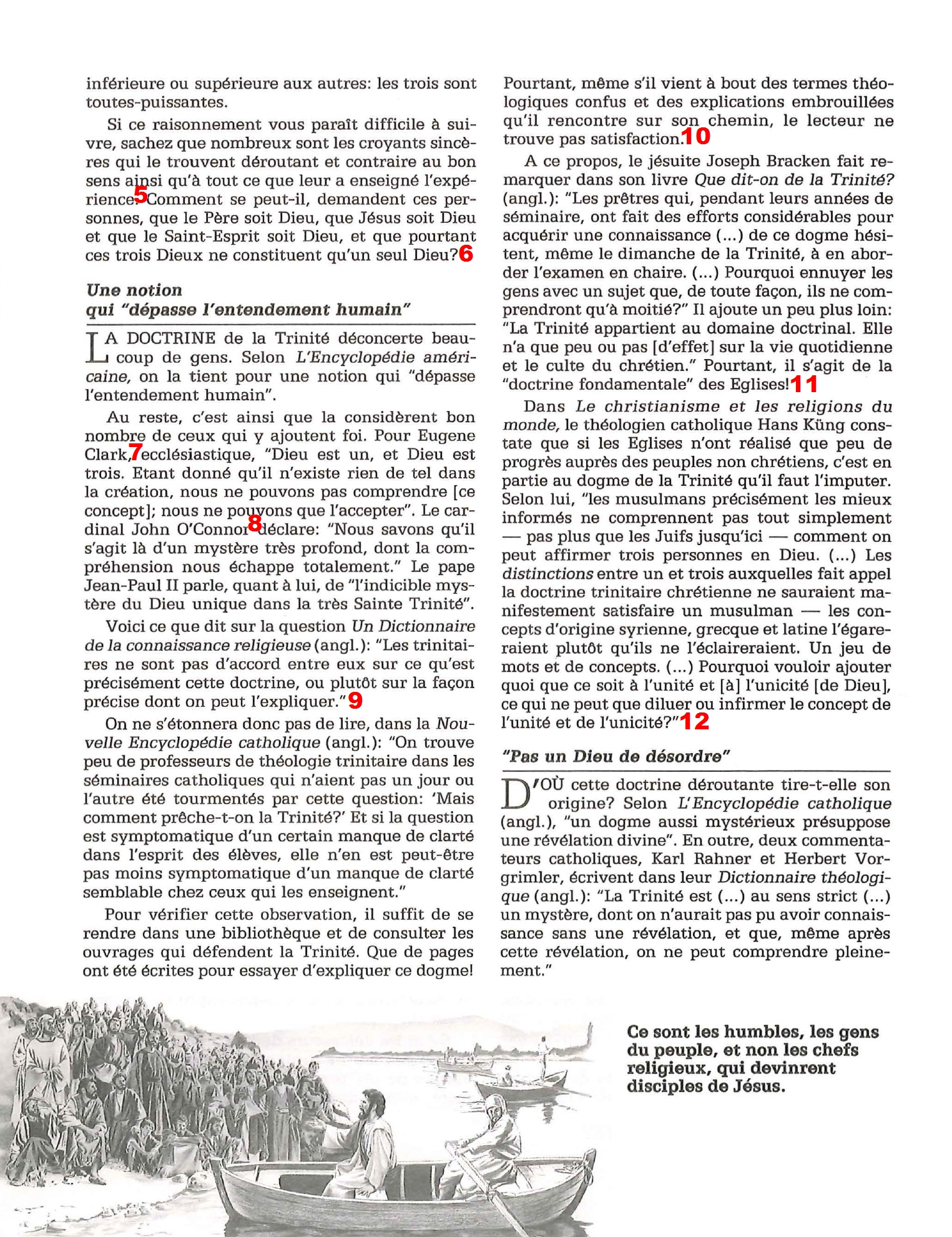 ![]() 1. On remarque ici l’emphase particulière que mettent les TdJ sur la «bonne doctrine» comme élément central de notre salut. Si j’exagère un peu, les protestants croient au salut par la foi seule, les témoins de Jéhovah par l’orthodoxie seule. 2. Les ariens, du nom d’Arius, le premier qui a enseigné cette idée. 3. «Il fut un temps où le Fils n’existait pas» Arius d’Alexandrie. 4. Livre d’Arthur Weigal (1880-1934), qui était égyptologue et non historien du christianisme. Son livre réfute à peu près tout ce qui concerne Jésus comme «d’origine païenne» : sa naissance, sa vie, l’appel des douzes disciples, sa tentation, sa crucifixion, sa résurrection... Les Témoins de Jéhovah ne prennent que ce qui les arrange ![]() 5. Ce n’est pas un «raisonnement», mais la description brute de ce que dit la Bible, avant justement tous les raisonnements. Ce sont les faits bibliques de base, si vous préférez. Nous y reviendrons. 6. Formulation déloyale: on fait toujours attention à parler de «personnes» et non de dieux quand on parle du Père, du Fils ou du St Esprit en particulier, à l’écart des deux autres. Il serait plus juste de dire: «ces trois personnes ne constituent qu’un seul Dieu». 7. Prélat à l’archidiocèse de New York, 1926-2012, connu pour son adhésion vocale aux pratiques et valeurs traditionnelles 8. Archevêque de New York, 1920-2000, conservateur 9. Lymann Abbott, p944, à noter que sur cette même page se trouve aussi: «Il est certain cependant que depuis les temps apostoliques ils ont rendu un culte au Père au Fils et au Saint Esprit, leur ont adressé leurs prières, et les ont inclus dans leurs doxologies.» et «La Bible représente Dieu à nous comme Père, Fils et Saint Esprit. Il les représentent comme également dignes de la plus haute révérence, affection et allégeance."