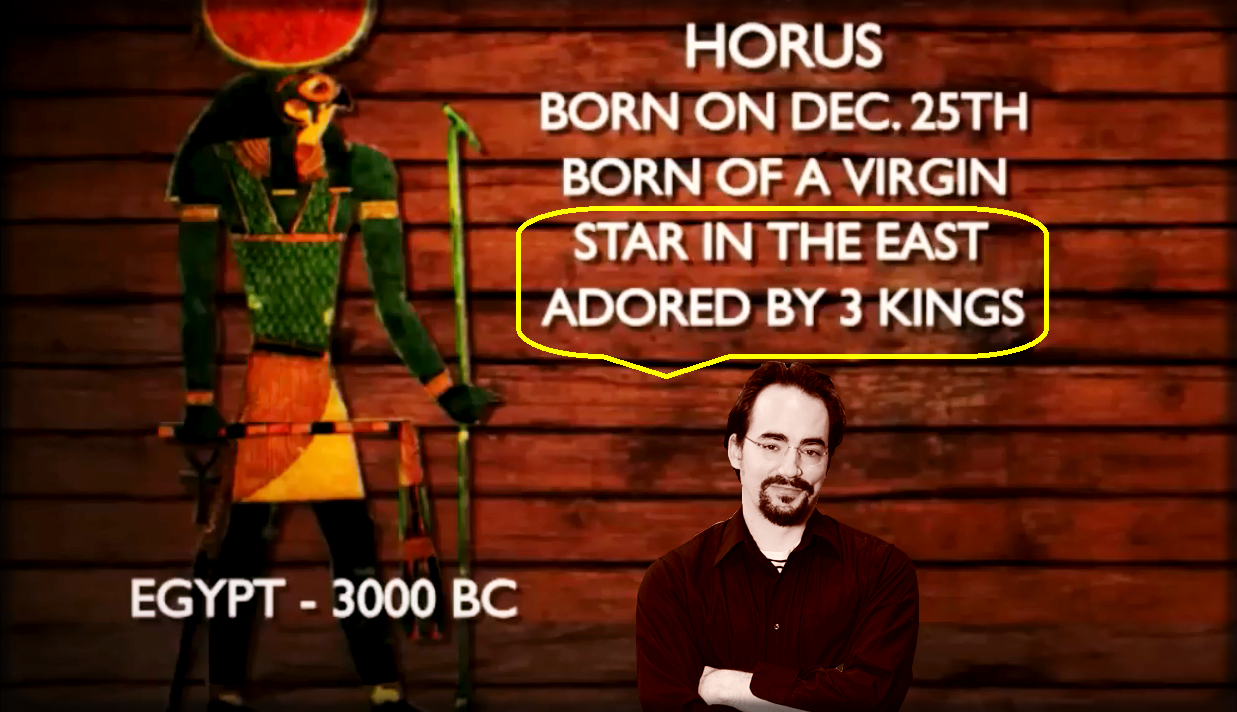 Une nouvelle fois, le jeune réalisateur de zeitgeit établit un faux parallèle entre Horus et Jésus, qui auraient eut en commun 3 rois venus l'adorer. À 18 min 19 s, Peter Joseph reprend cette idée à propos de Jésus :