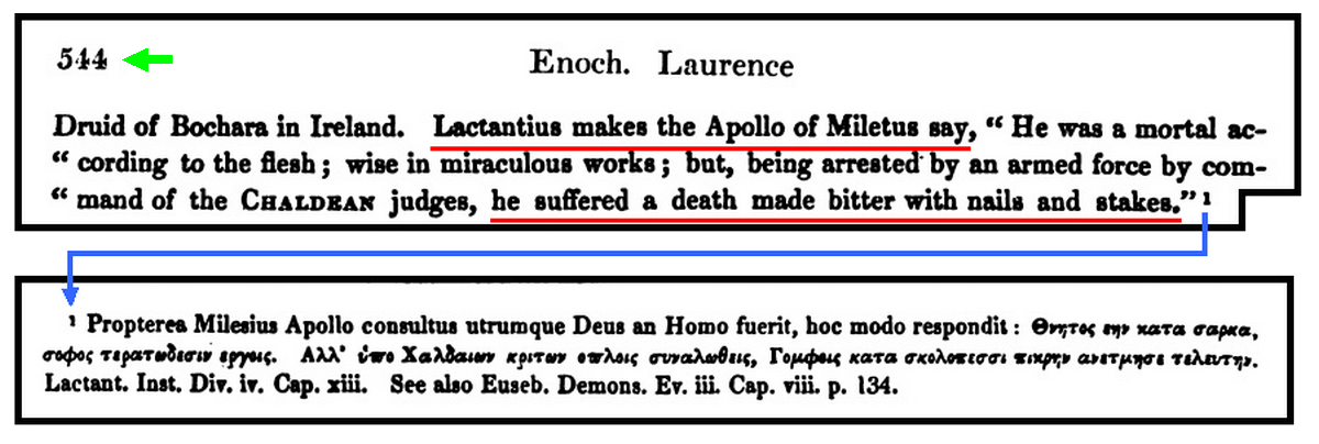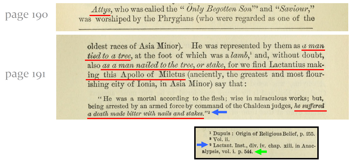 - La Note contenue en page 544 du Vol 1 d'Anacalypsis renvoie à Lactance - « Lucius Caecilius Fimianus LACTANTIUS, Livre IV, Chapitre XIII » où il est question de Jésus, de sa mort, des ses miracles, de sa divinité, etc.