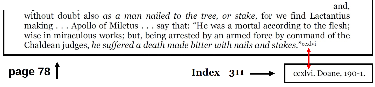 La note n°2 du livre de Doane nous conduit à la page 544, du 1er Volume du livre « anacalypsis » du franc-maçon Higgins Godfrey. Qui lui, fait une citation de Lactantius :